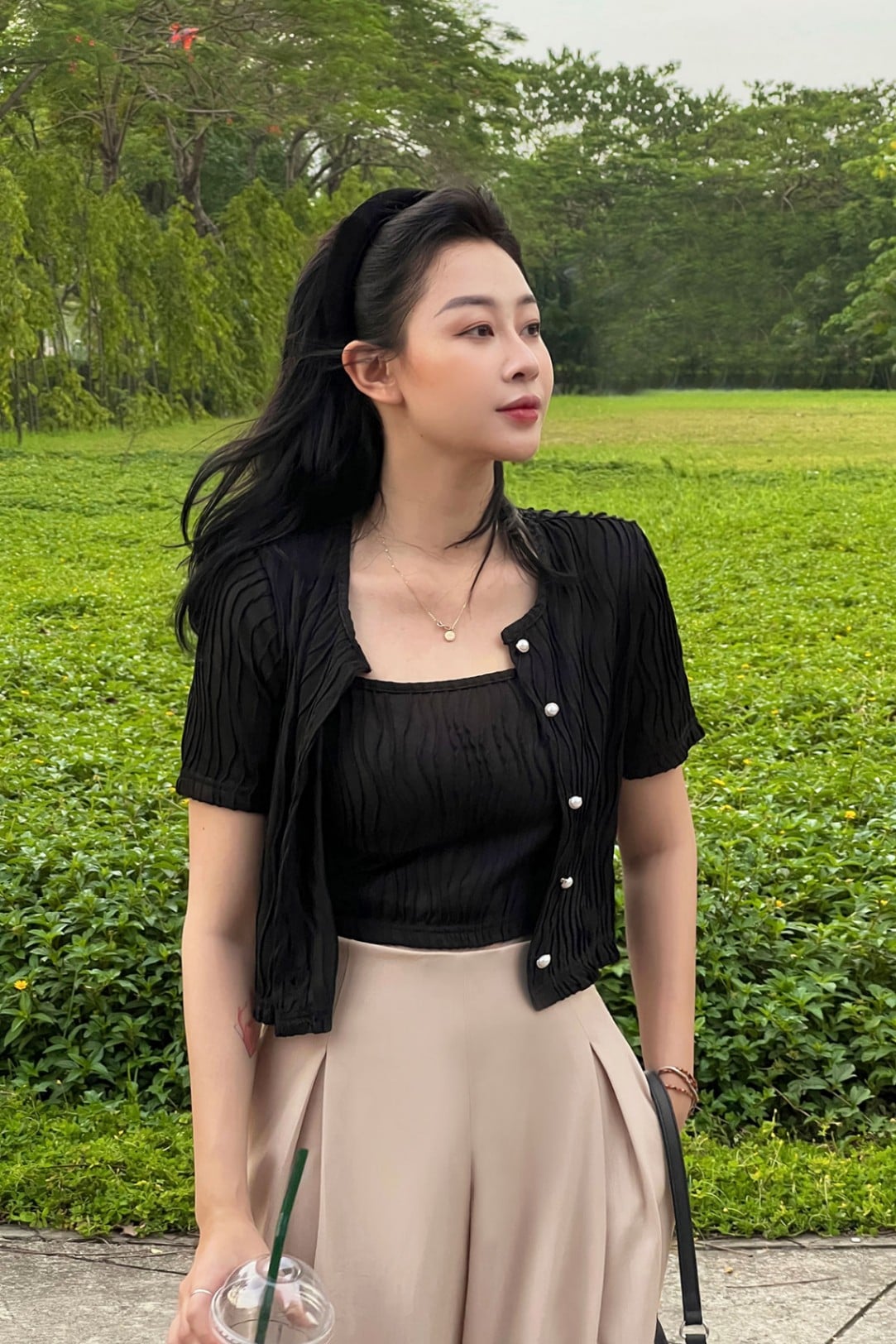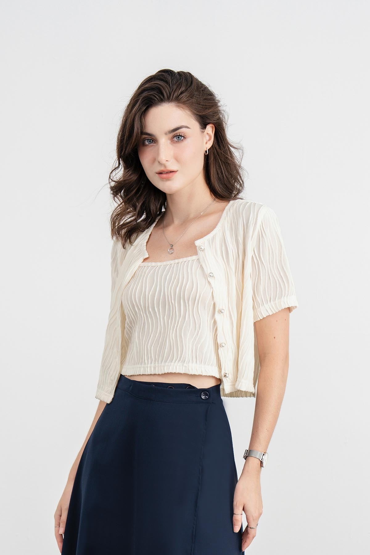 Mô tả sản phẩm : Áo cardigan thun, dáng suông croptop, cài cúc, ghéo bộ áo dây mặc trong