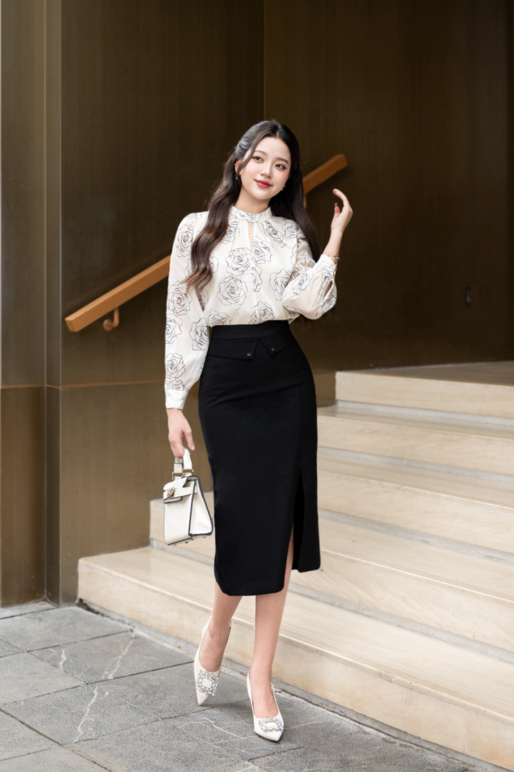 Mô tả sản phẩm : Áo cổ tàu, xẻ V, chiết ly, tay bồng, cài cúc sau cổ, cúc dự phòng được đính trong mác sử dụng của sản phẩm