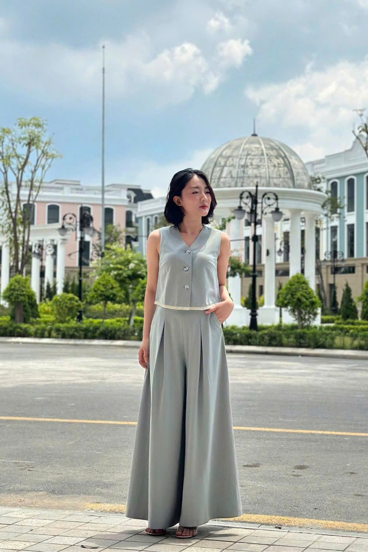 Mô tả sản phẩm : Áo dáng suông, sát nách, gấu phối màu, nẹp đính cúc. GB V64W25H007