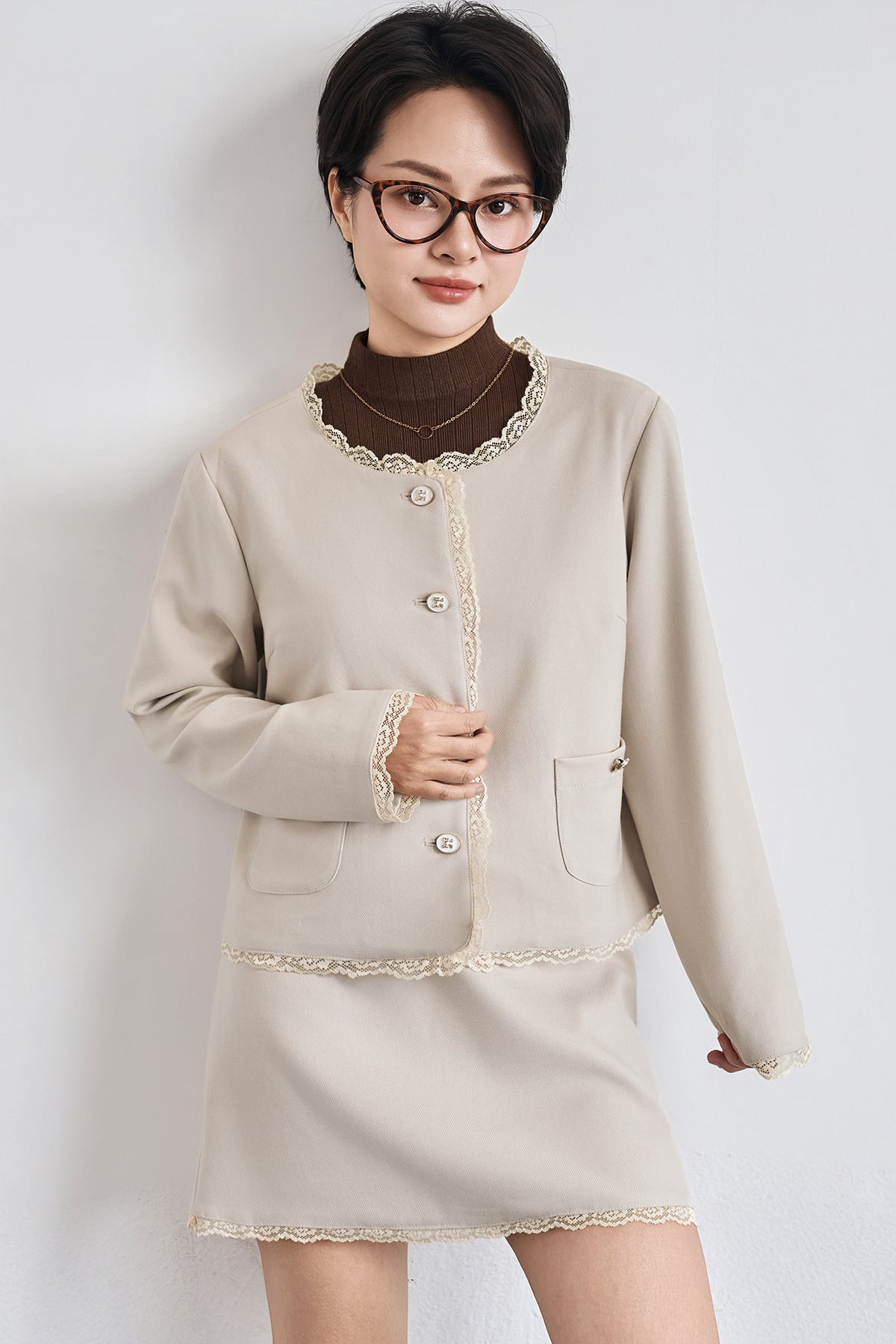 Mô tả sản phẩm : Áo dáng suông, cổ tròn, dài tay, phối ren, 2 túi ốp, nẹp đính cúc. GB V62R25Q010.