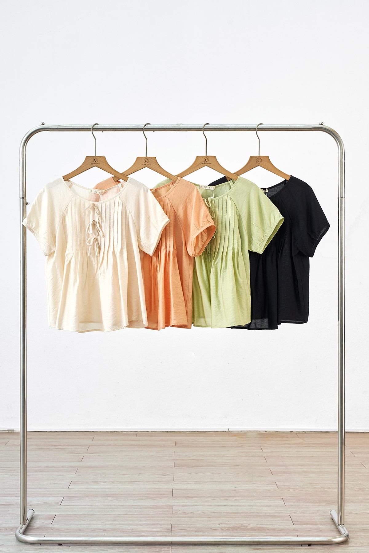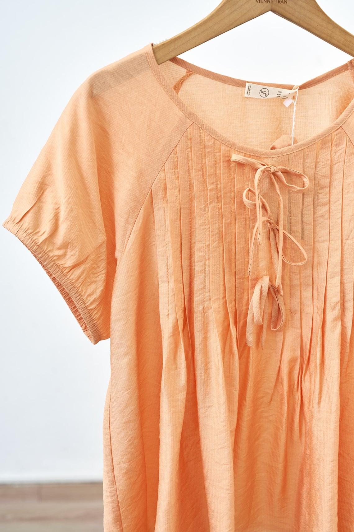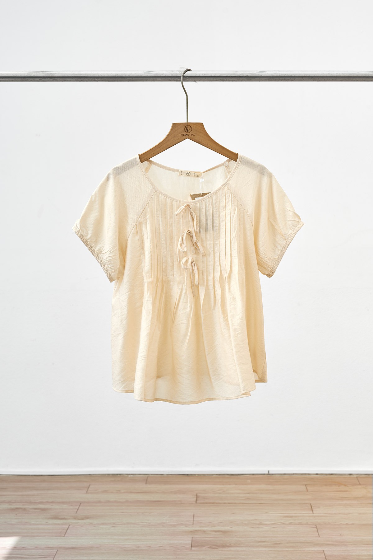 Mô tả sản phẩm: Áo dáng suông, xếp ly ngực, ly gấu tay, cổ tròn, tay bồng, đính nơ.