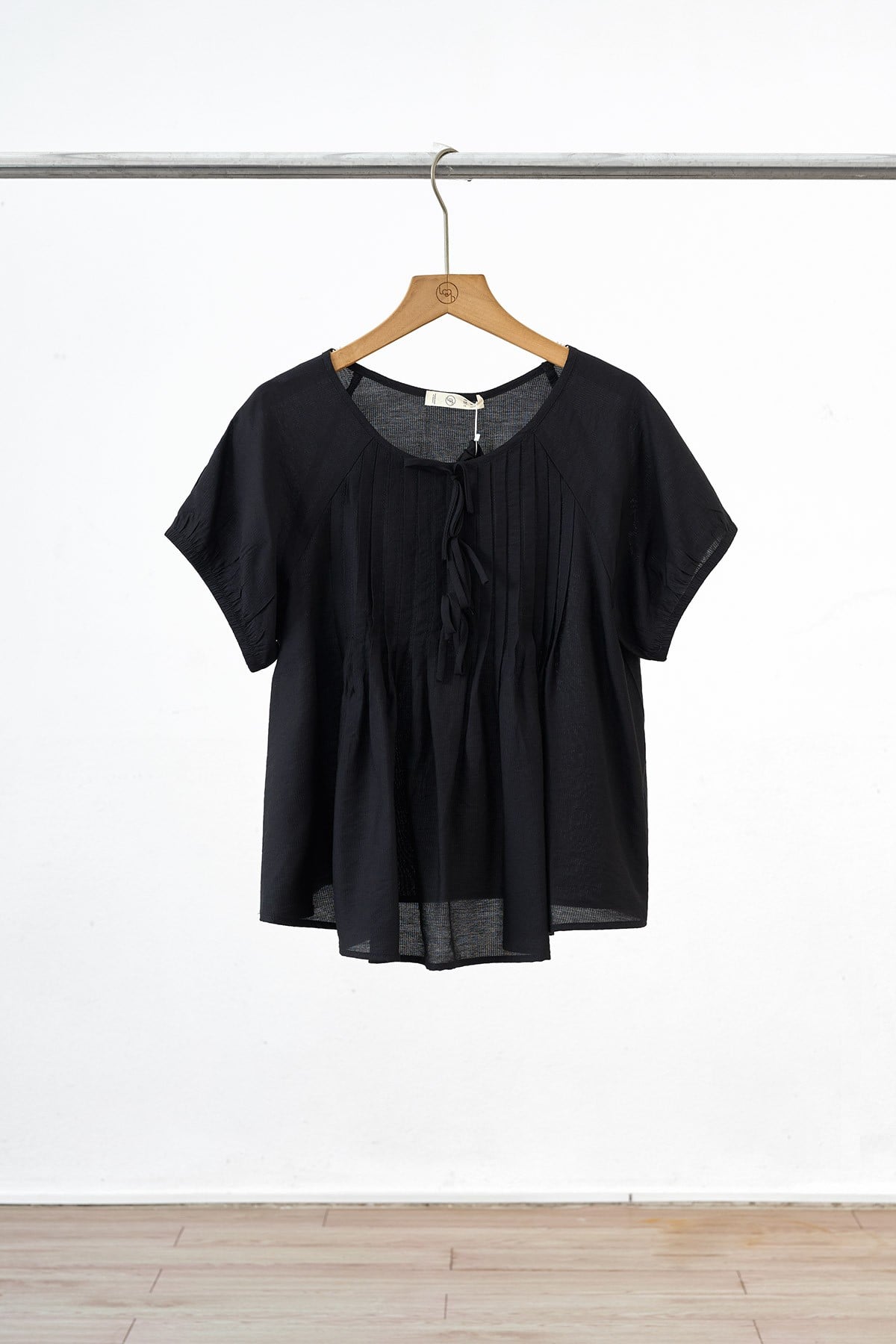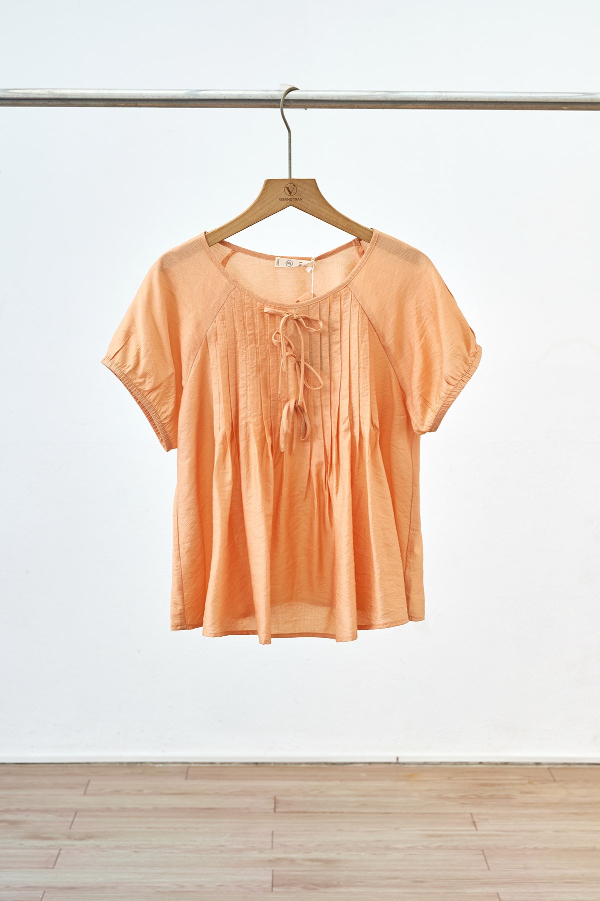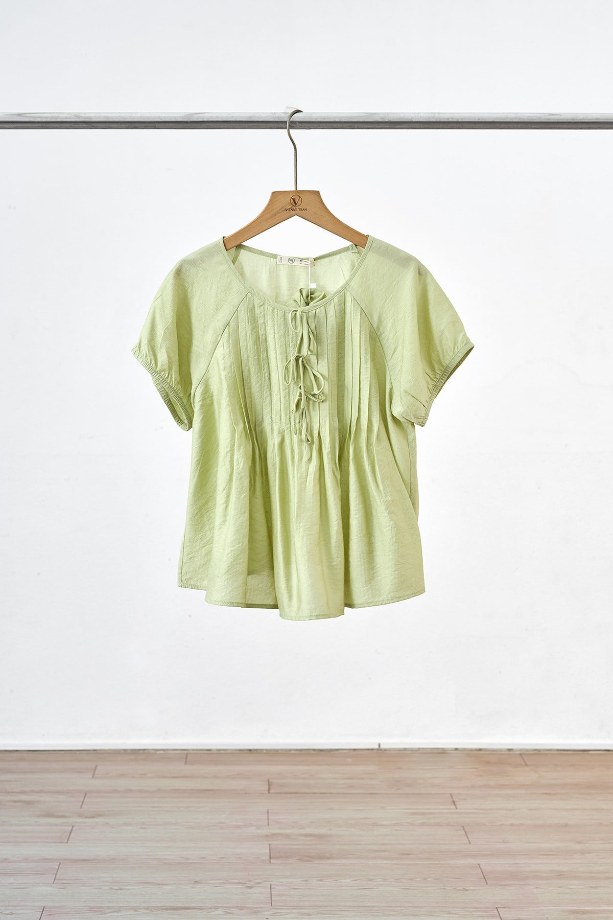 Mô tả sản phẩm: Áo dáng suông, xếp ly ngực, ly gấu tay, cổ tròn, tay bồng, đính nơ.