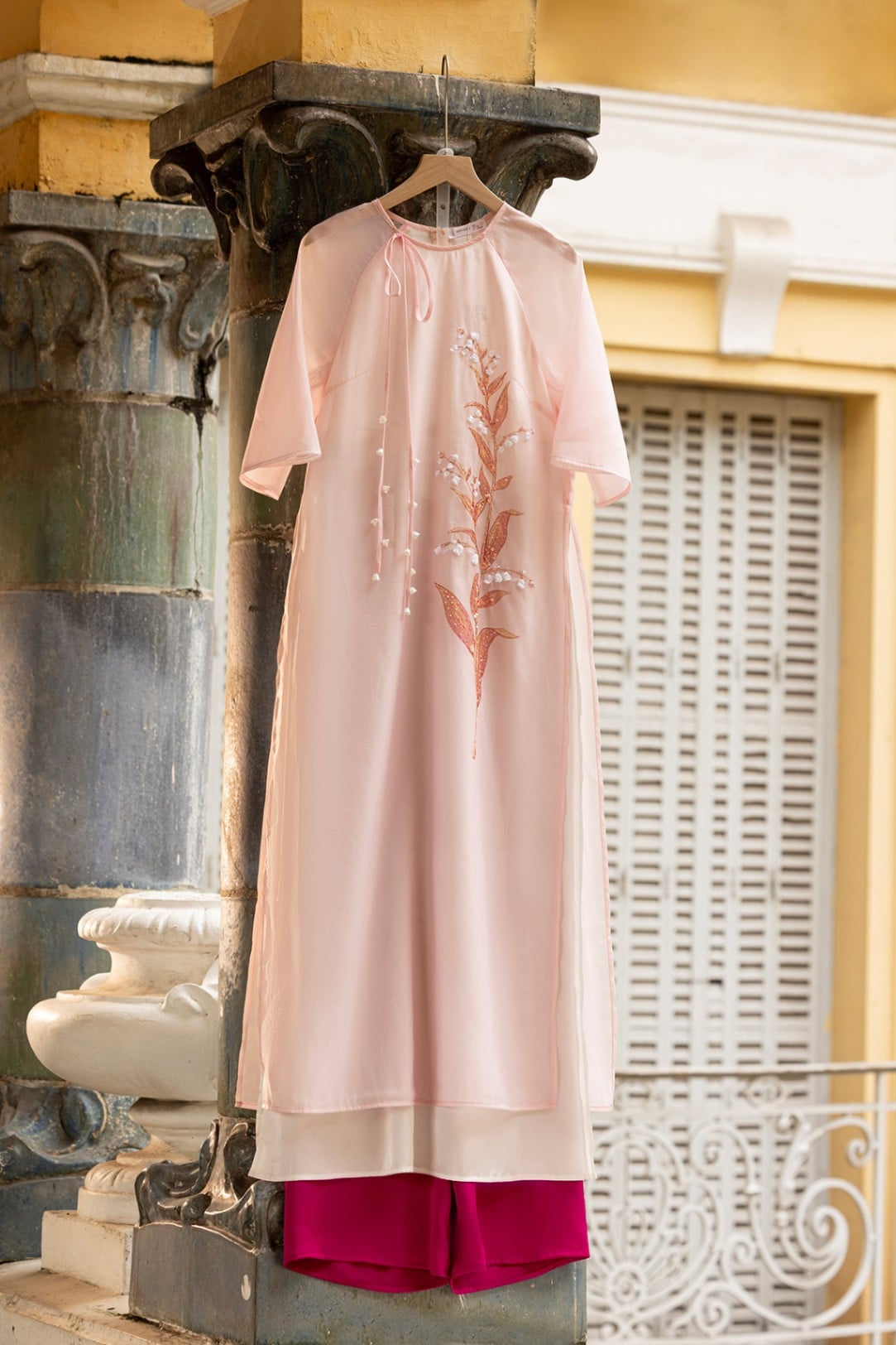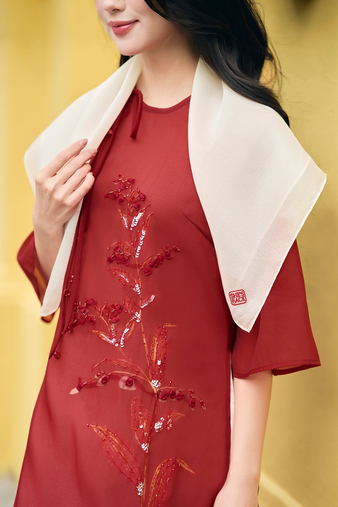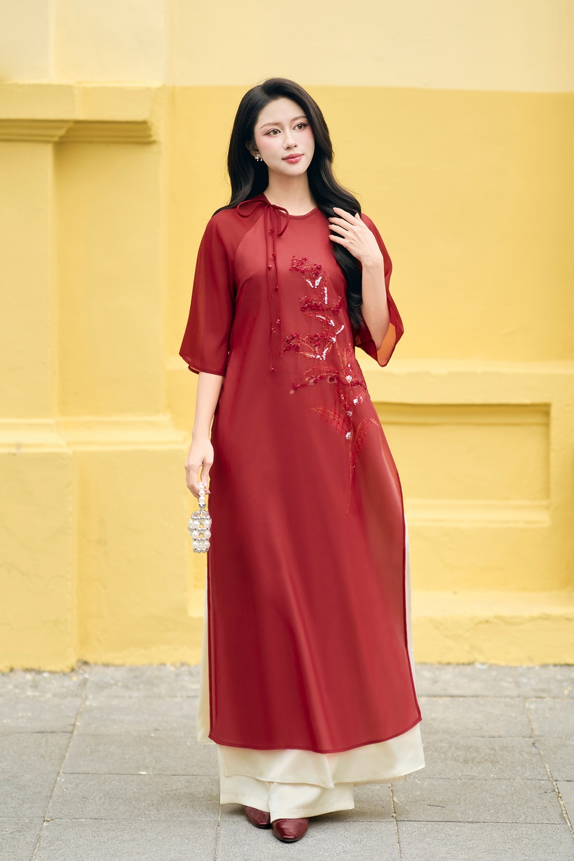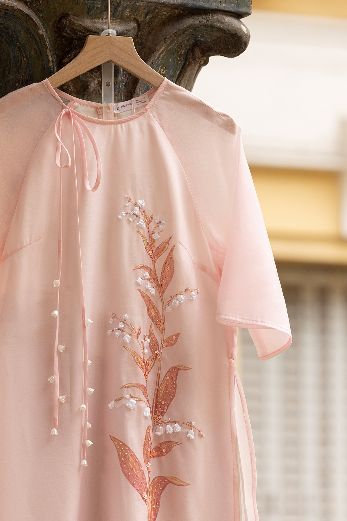 Mô tả sản phẩm : Áo dài cách tân dáng suông, tay lỡ, họa tiết hoa đính kết thân trước, dây trang trí.