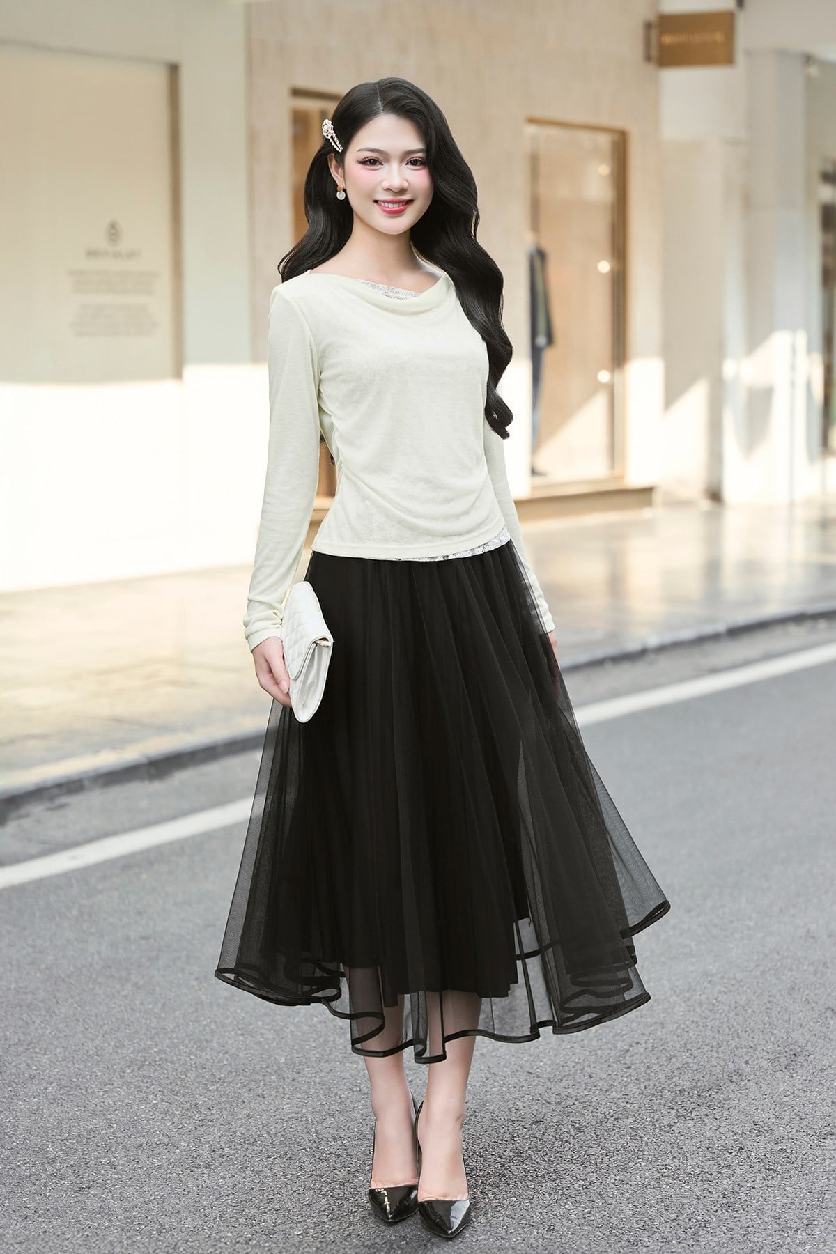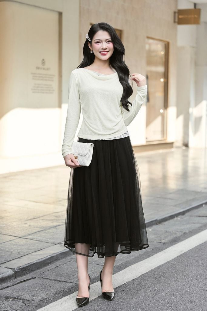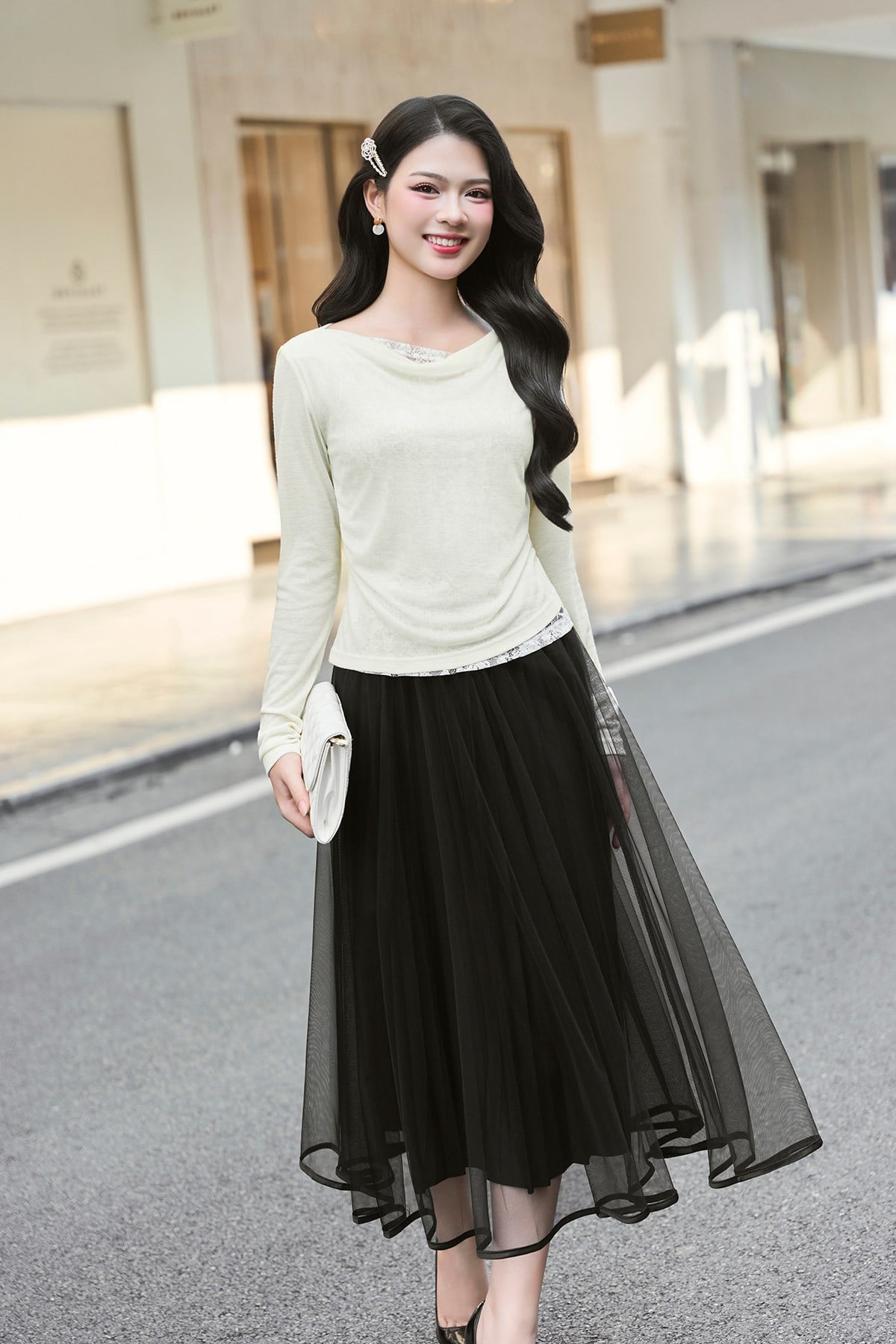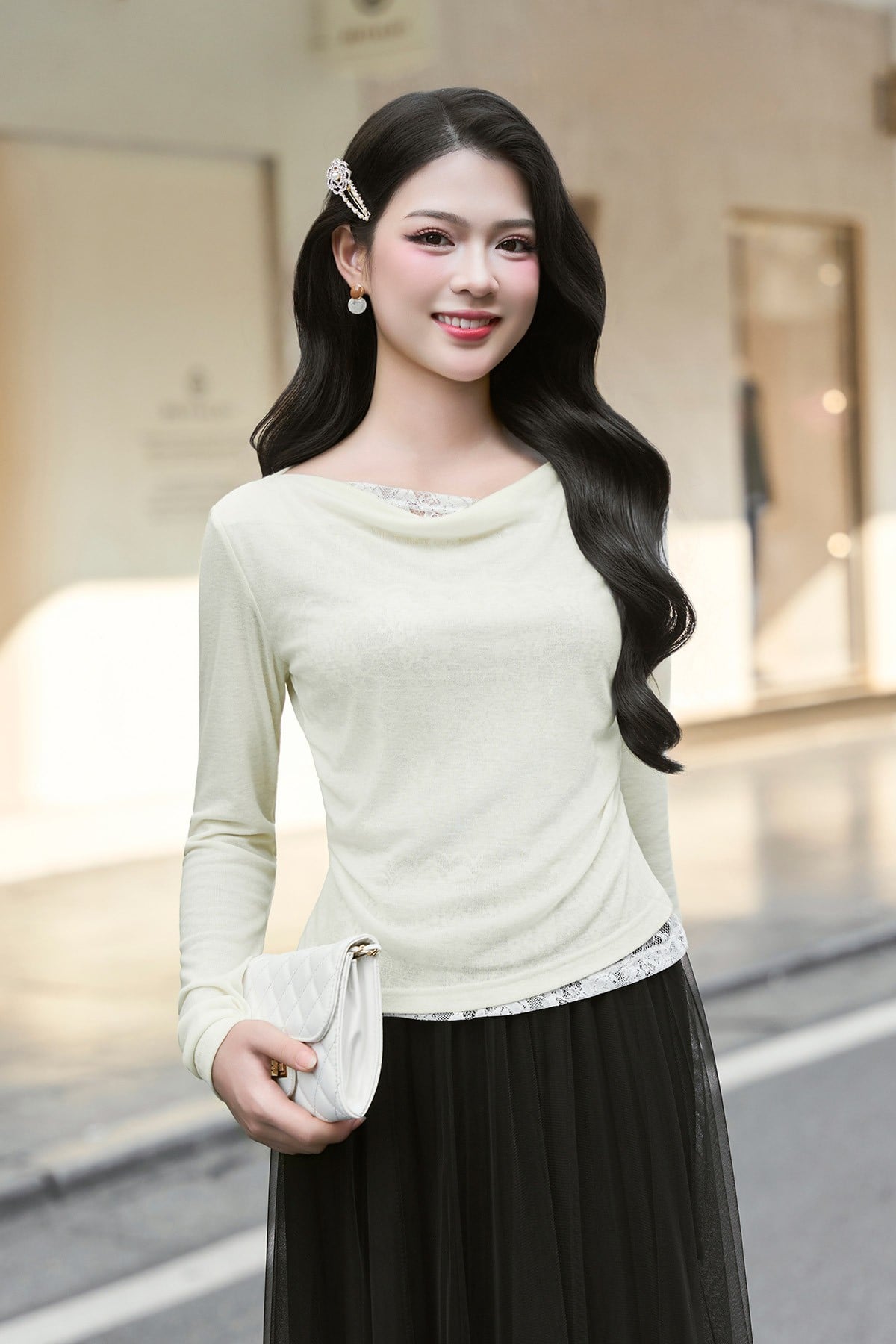 Áo dài tay trễ vai chun sườn phối ren - V61B25Q030