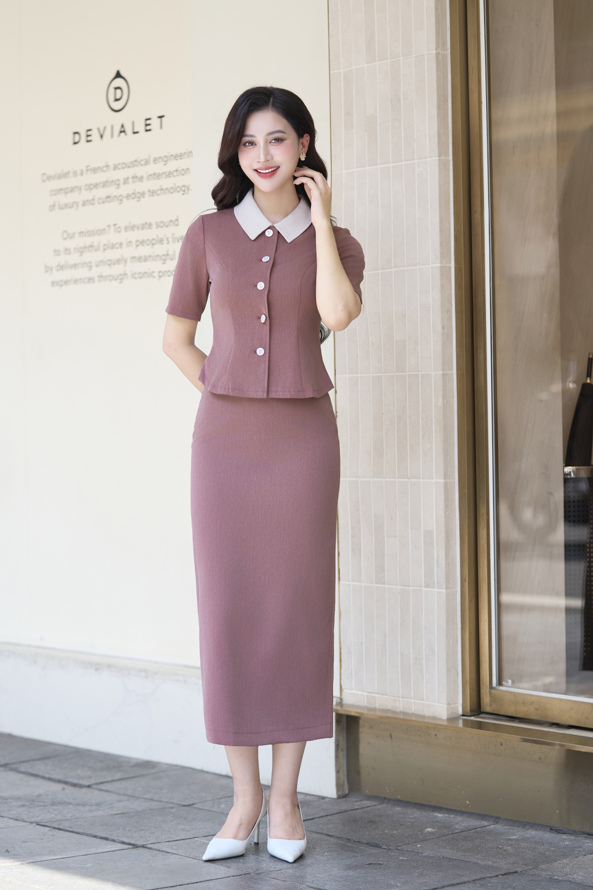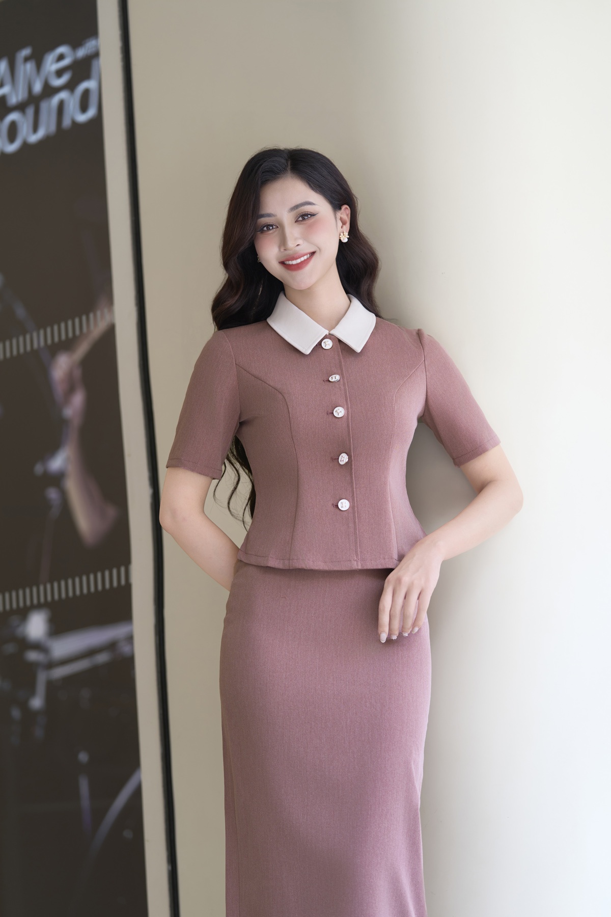 Mô tả sản phẩm : Áo dáng ôm, cổ đức, phối màu, tay lỡ, nép đóng cúc trang trí. GB L62F25Q018