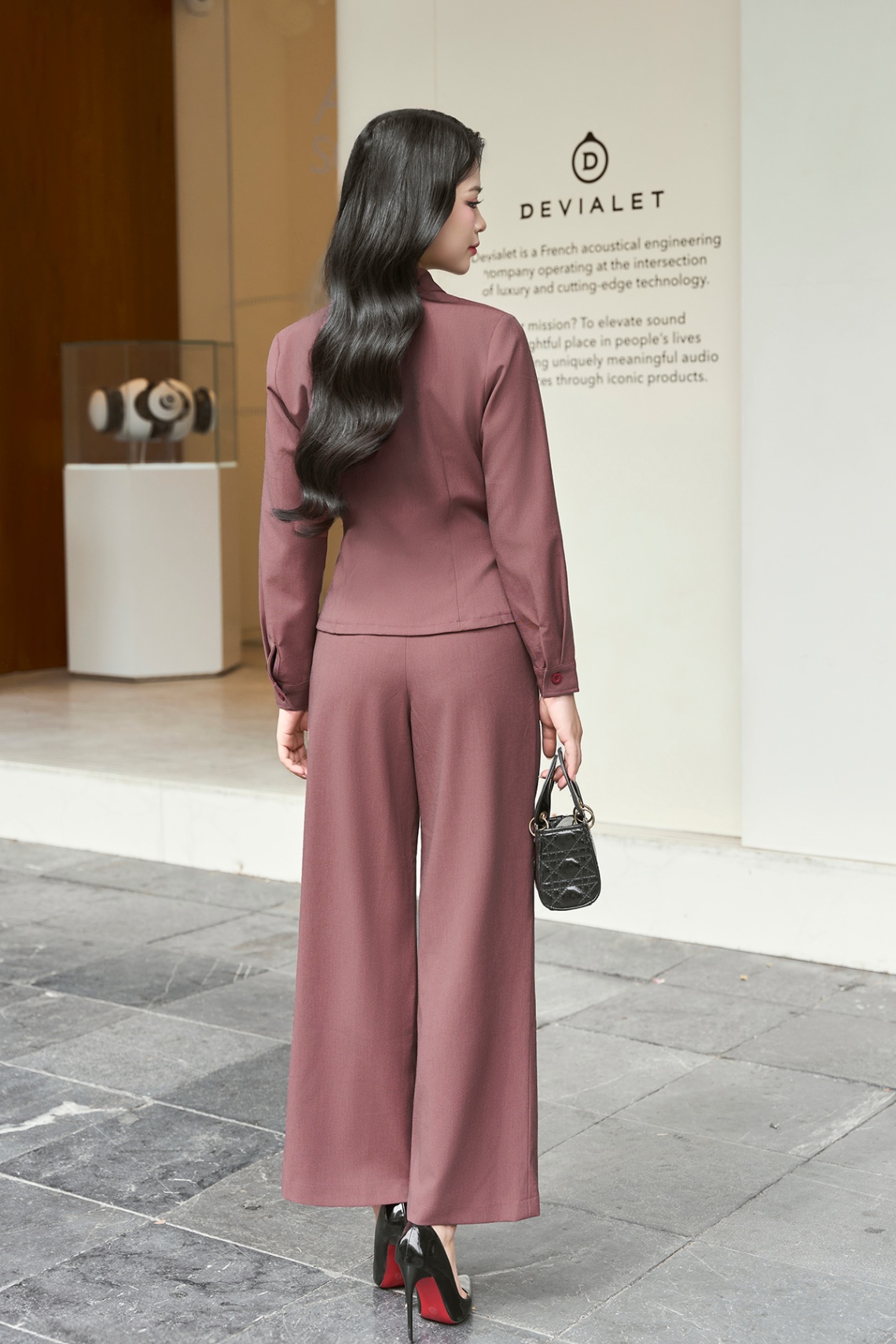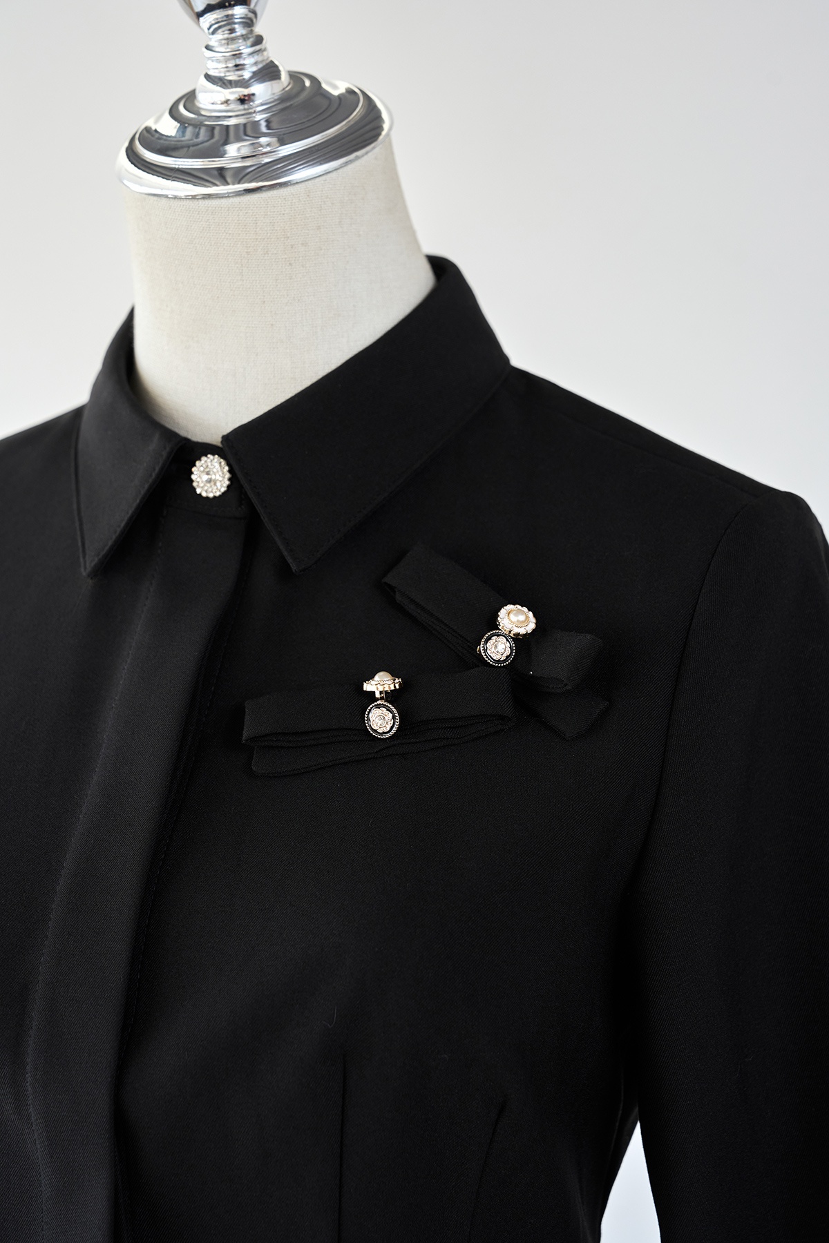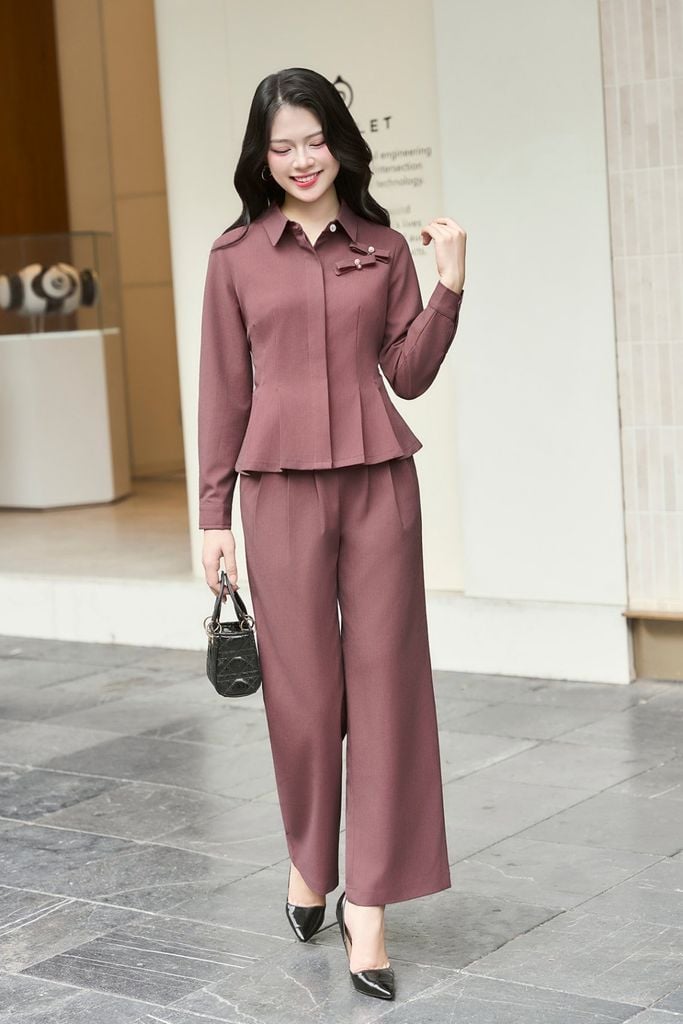 Mô tả sản phẩm : Áo dáng ôm, cổ đức, nẹp dấu khuy, xếp ly eo, nơ đính ngực. GB L64W25Q010