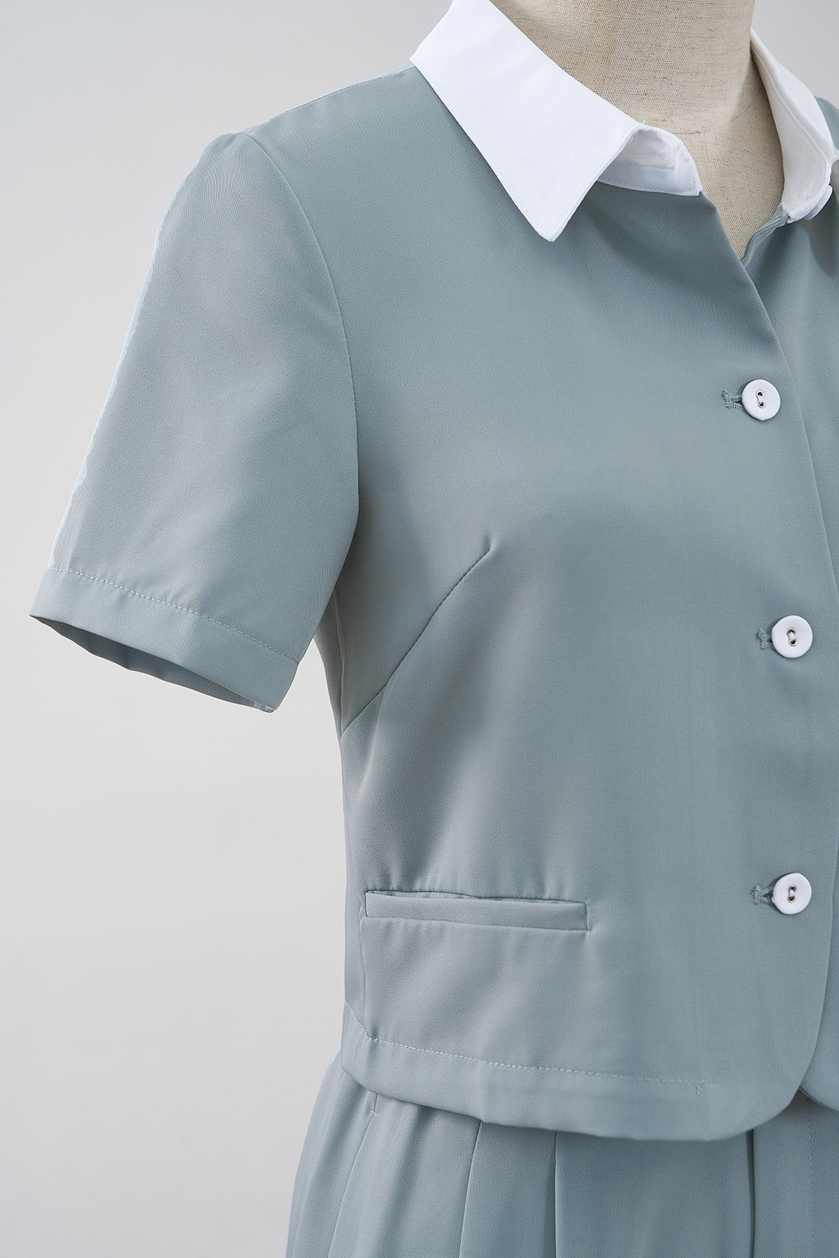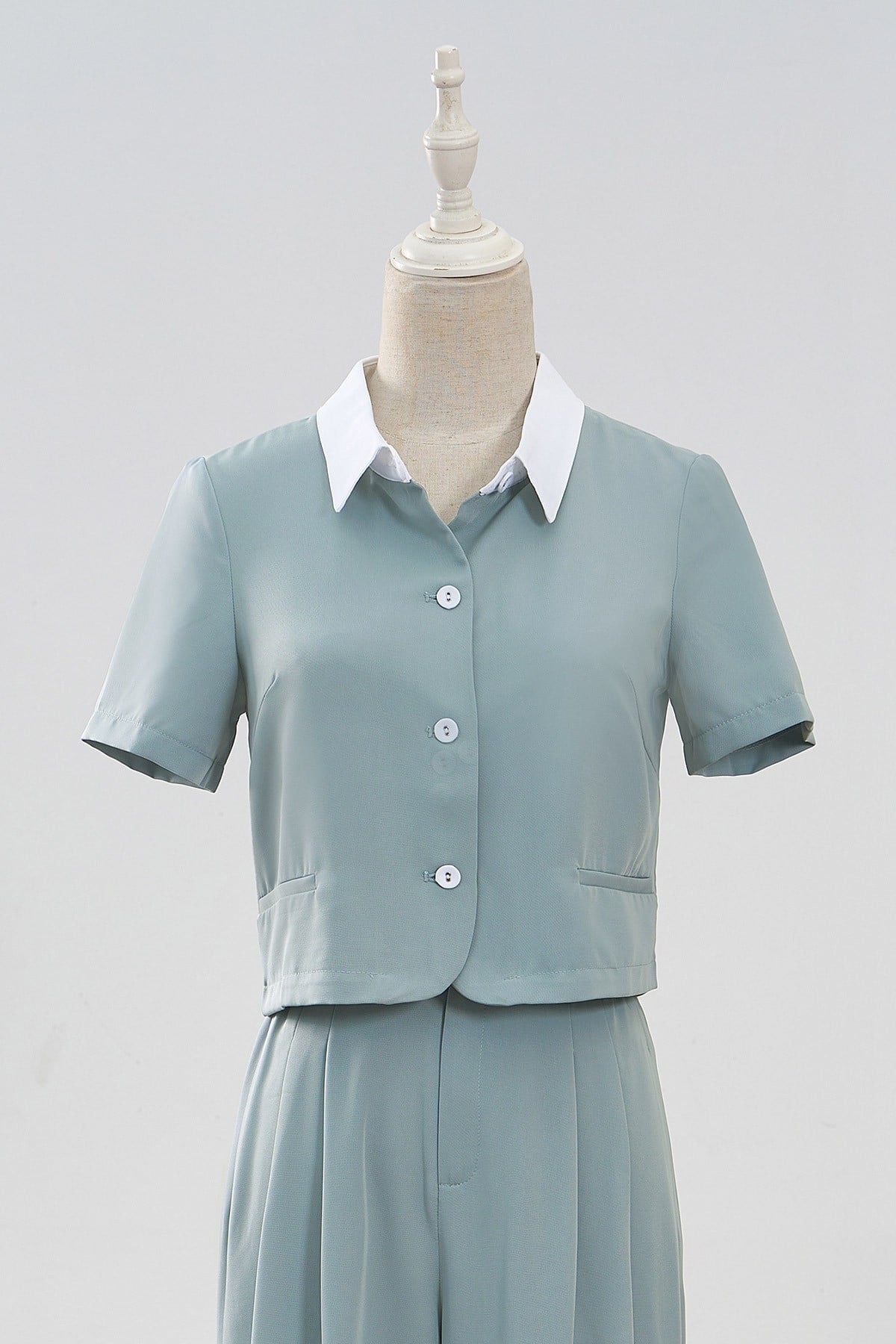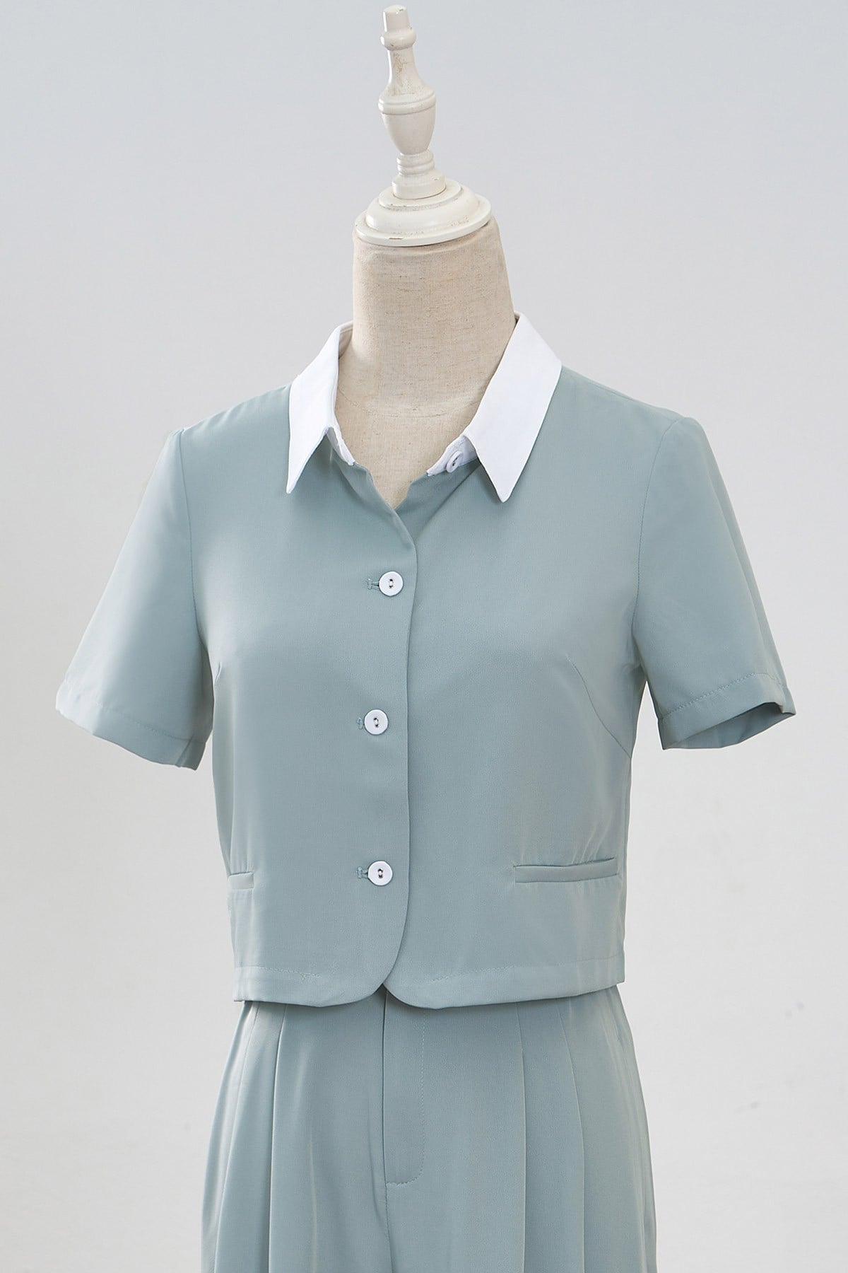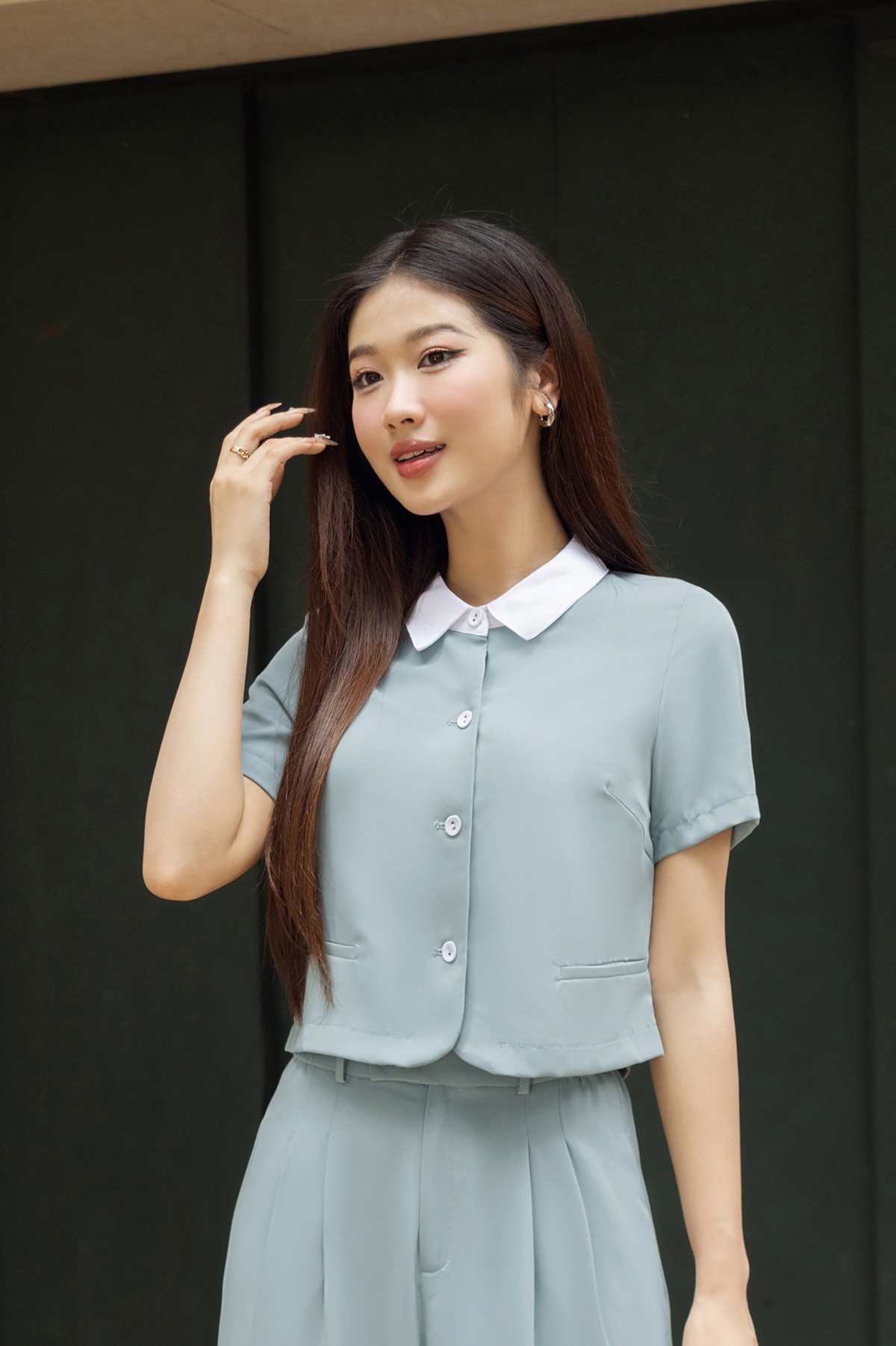 Mô tả sản phẩm : Áo đờ mi dáng ngắn, vạt ròn, cổ phối cùng mau cúc, túi cơi giả. GB-O64W24H004