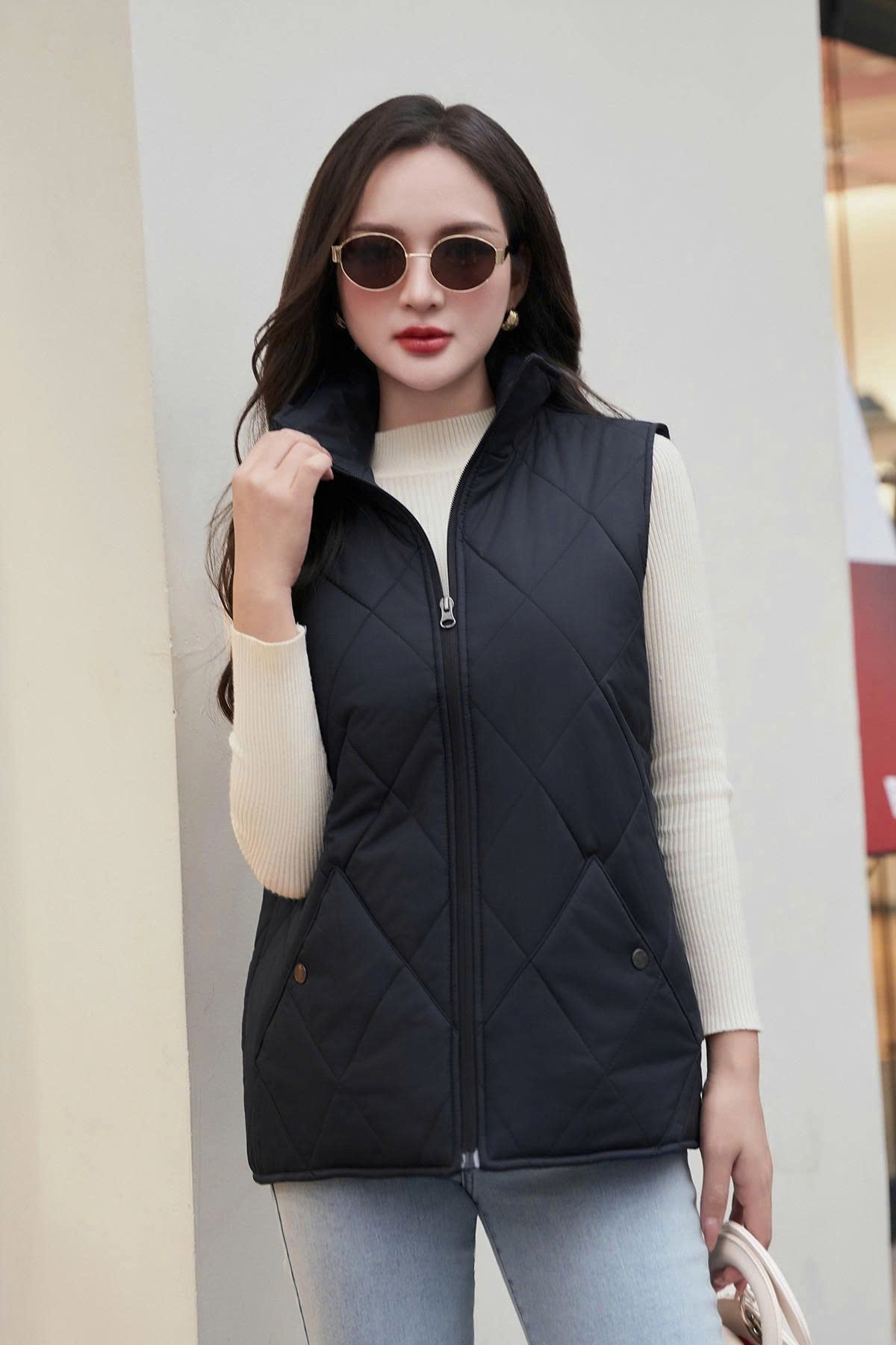 Mô tả sản phẩm : Áo gile phao ô trám, kéo khóa, túi chéo có cúc bấm