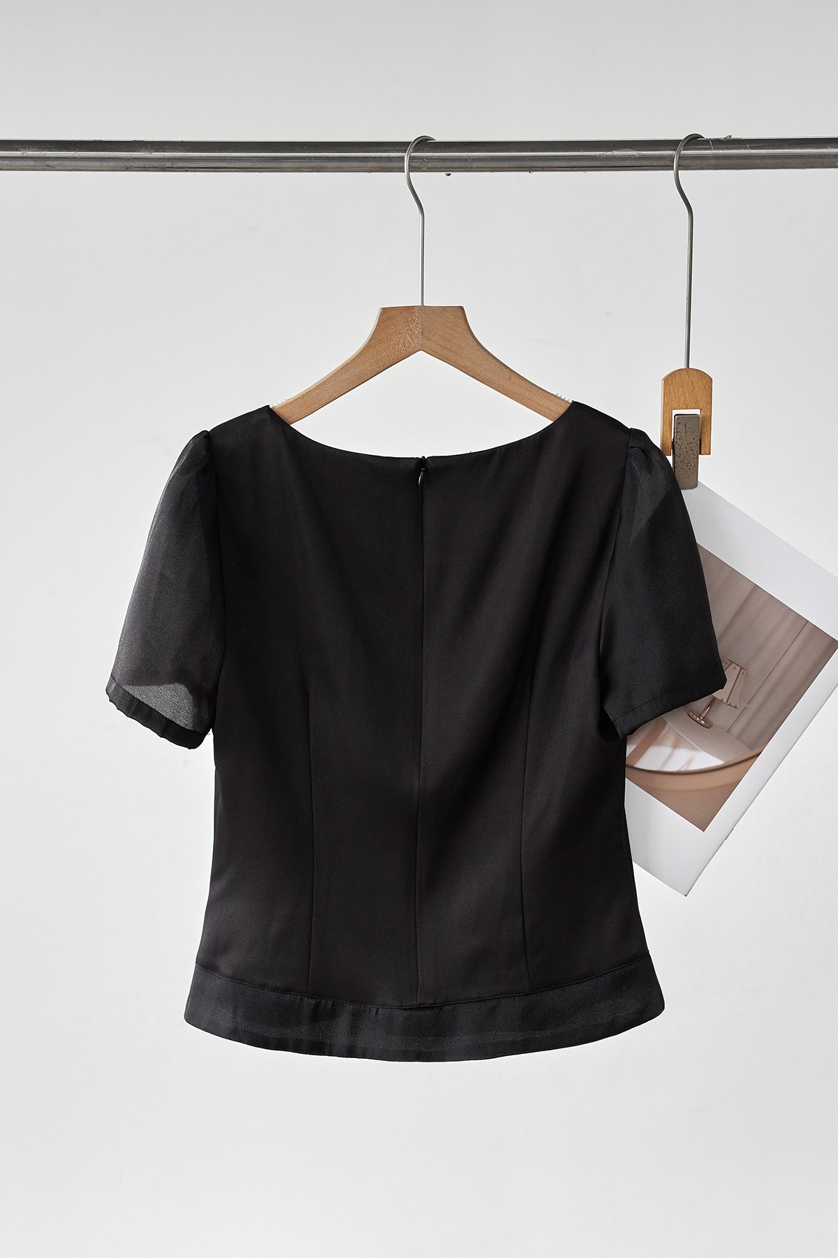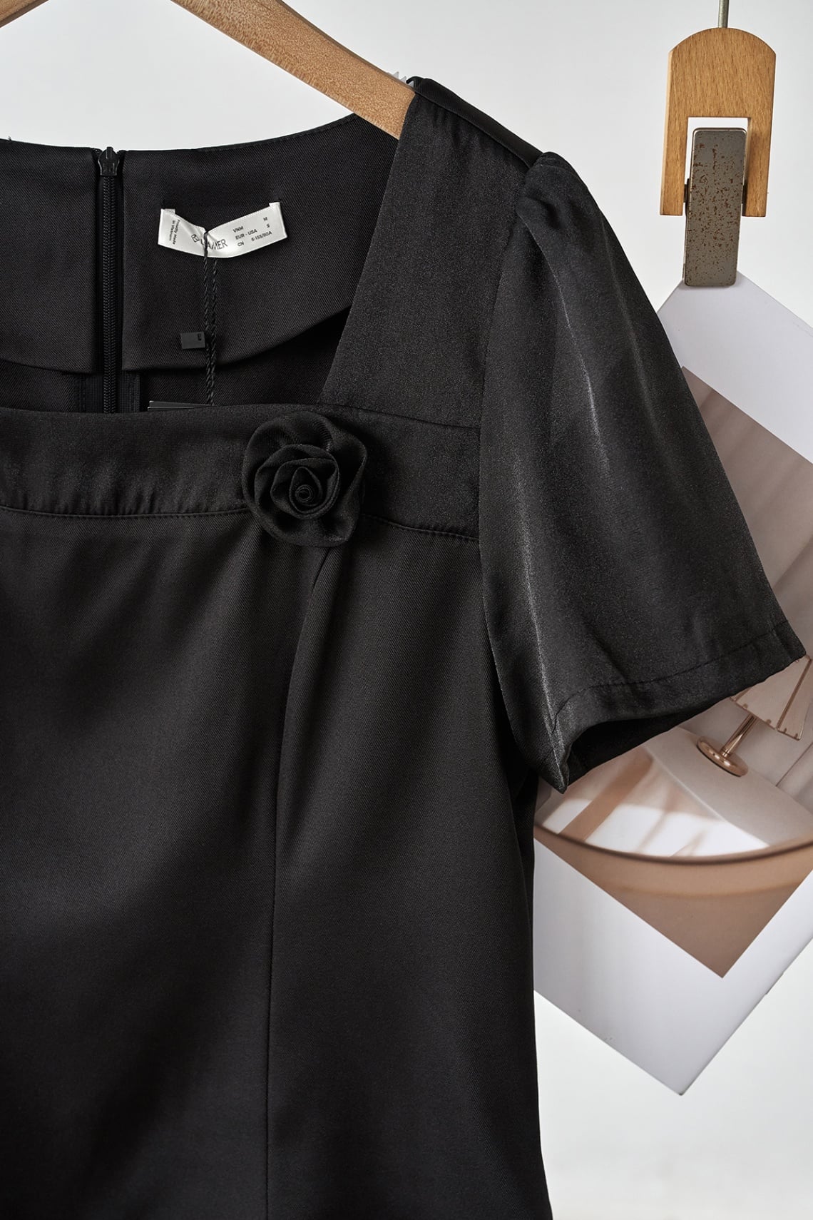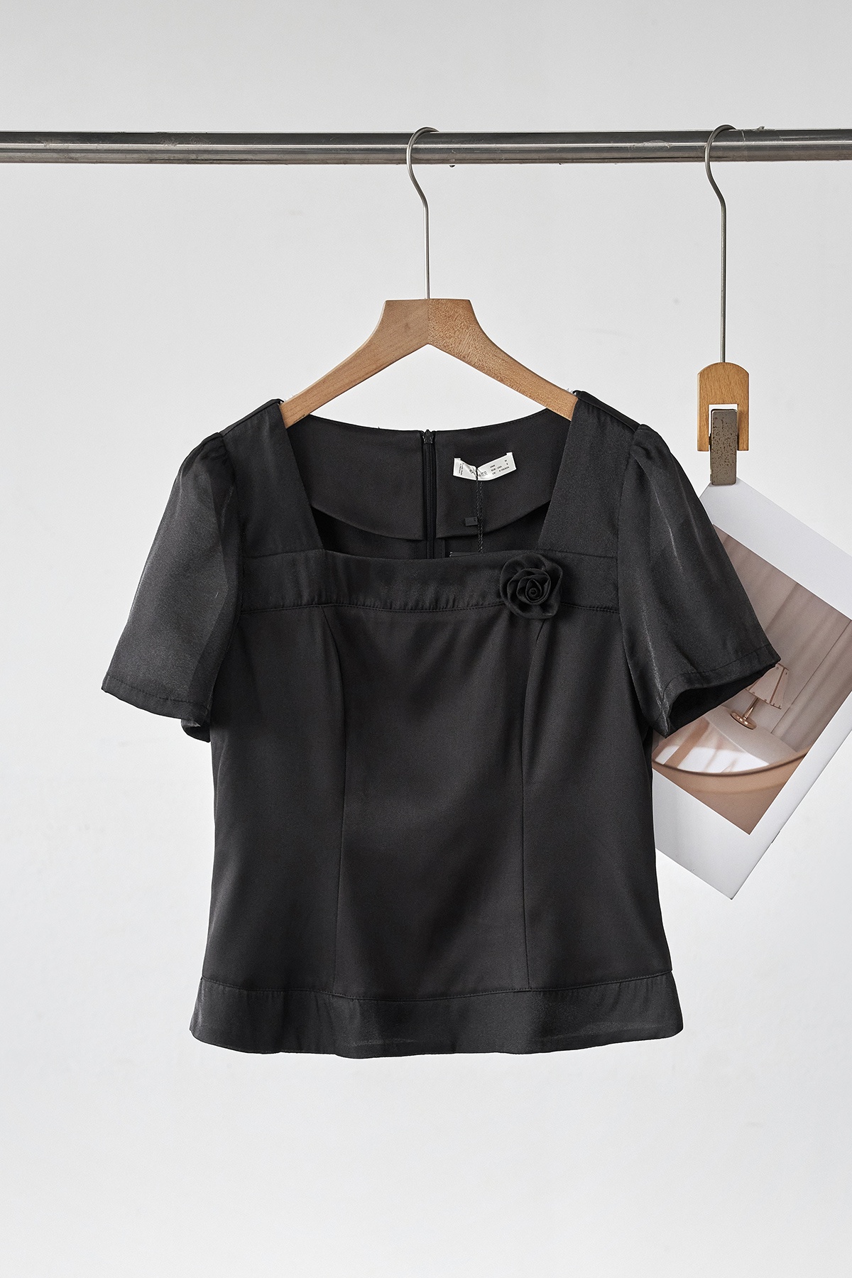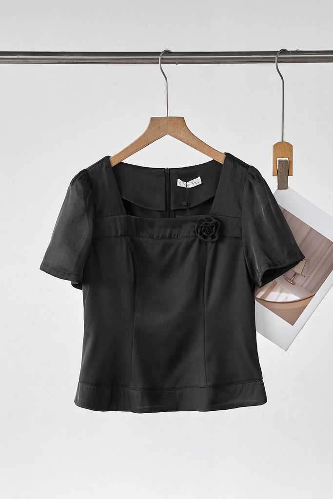 Mô tả sản phẩm : Áo dáng ôm, cổ vuông,tay phối voan, hoa ngực, kéo khóa sau