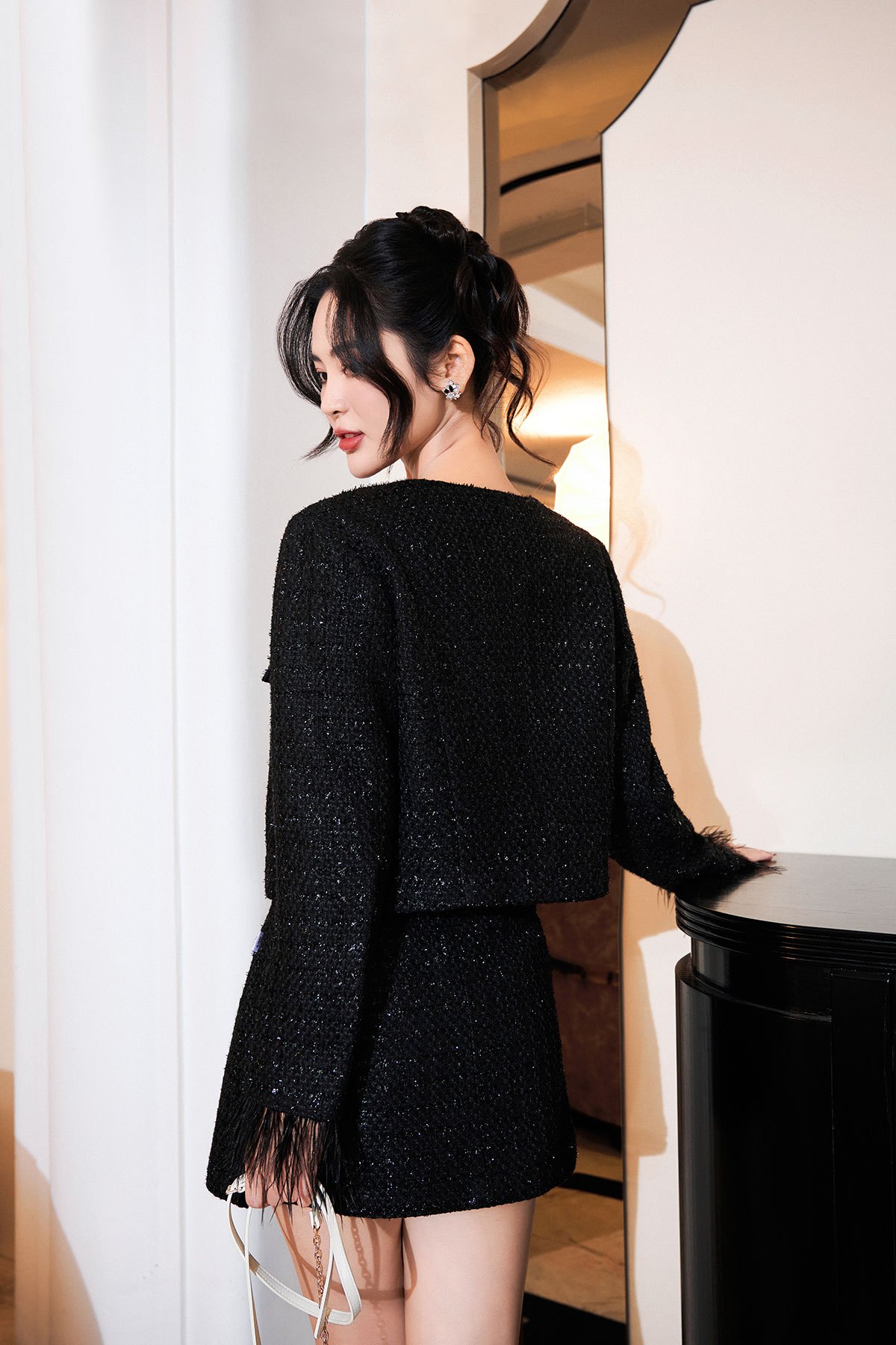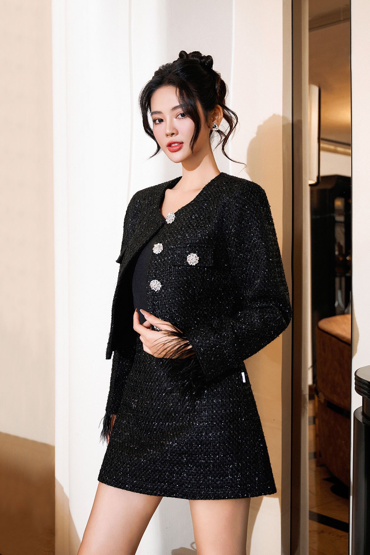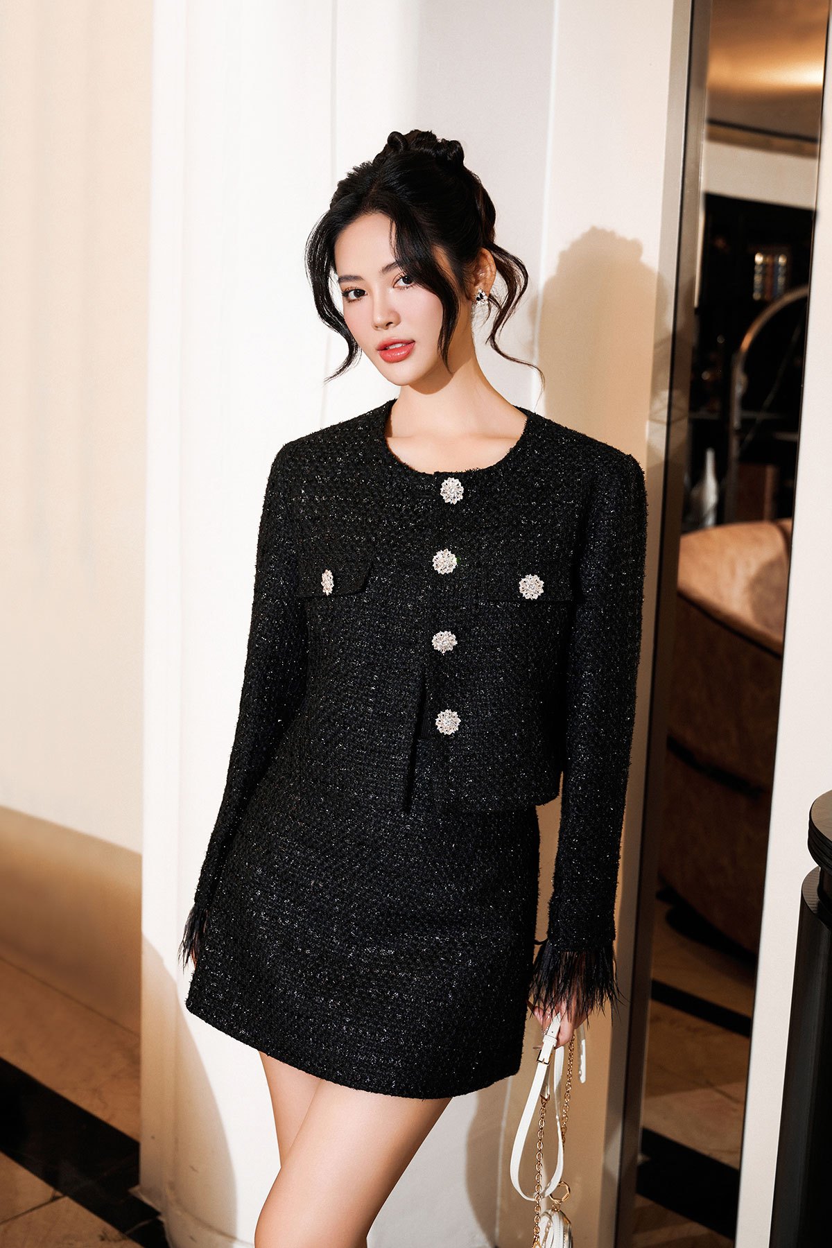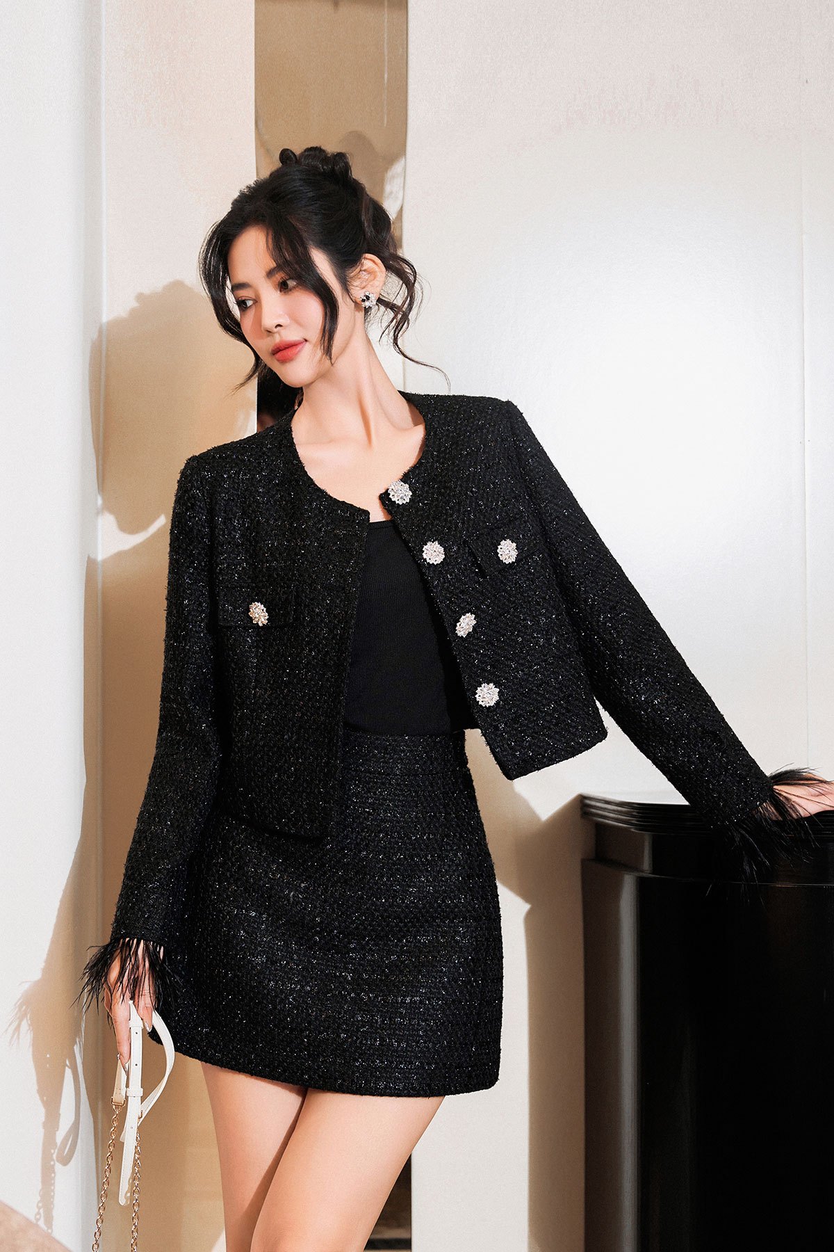 Chất liệu : 2 lớp, vải chính dạ tweed, vải lót habutai