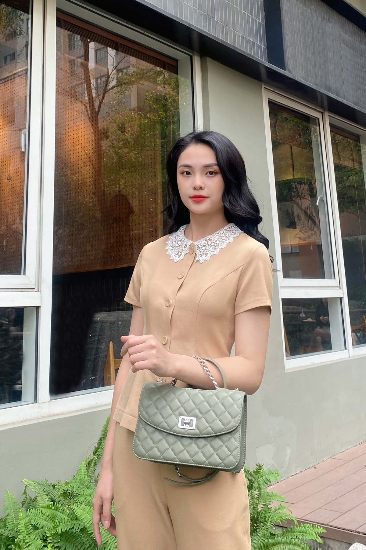 Mô tả sản phẩm : Dáng ôm, cổ áo phối, nẹp đính khuy, tay cộc, thân bổ mảnh vest