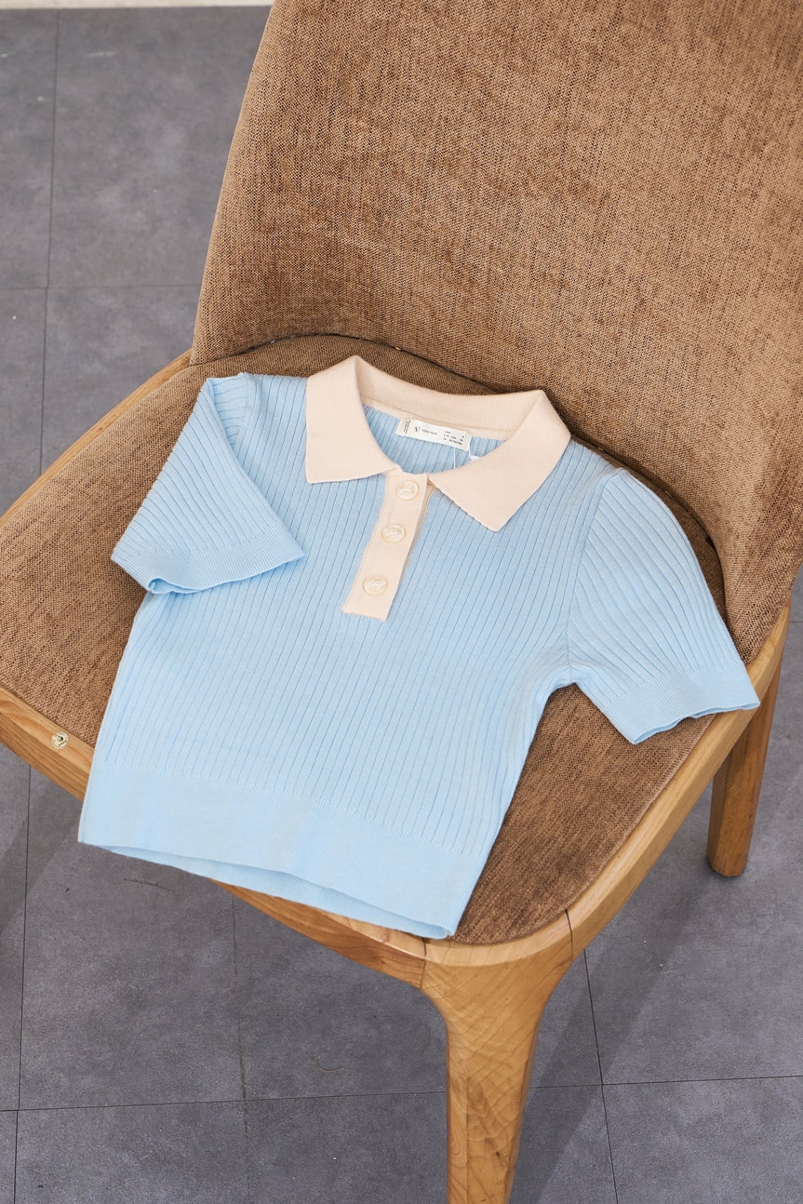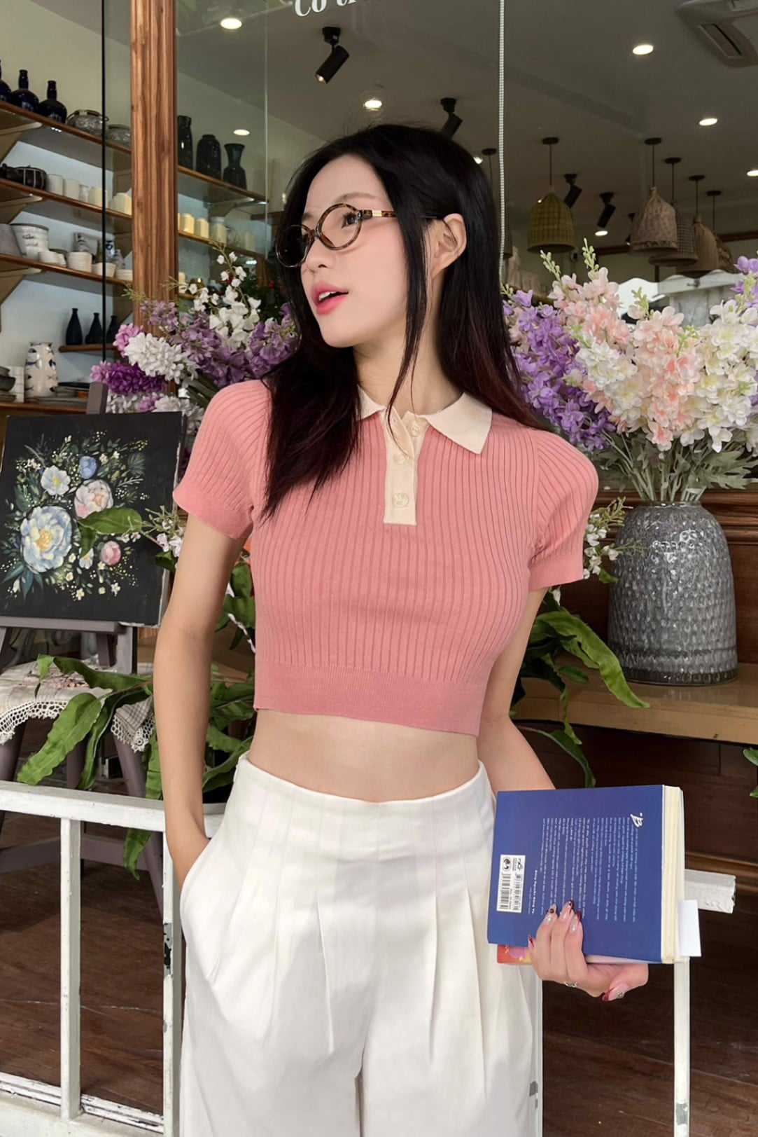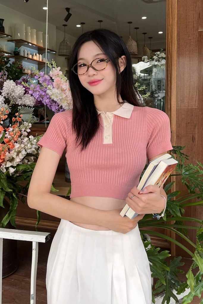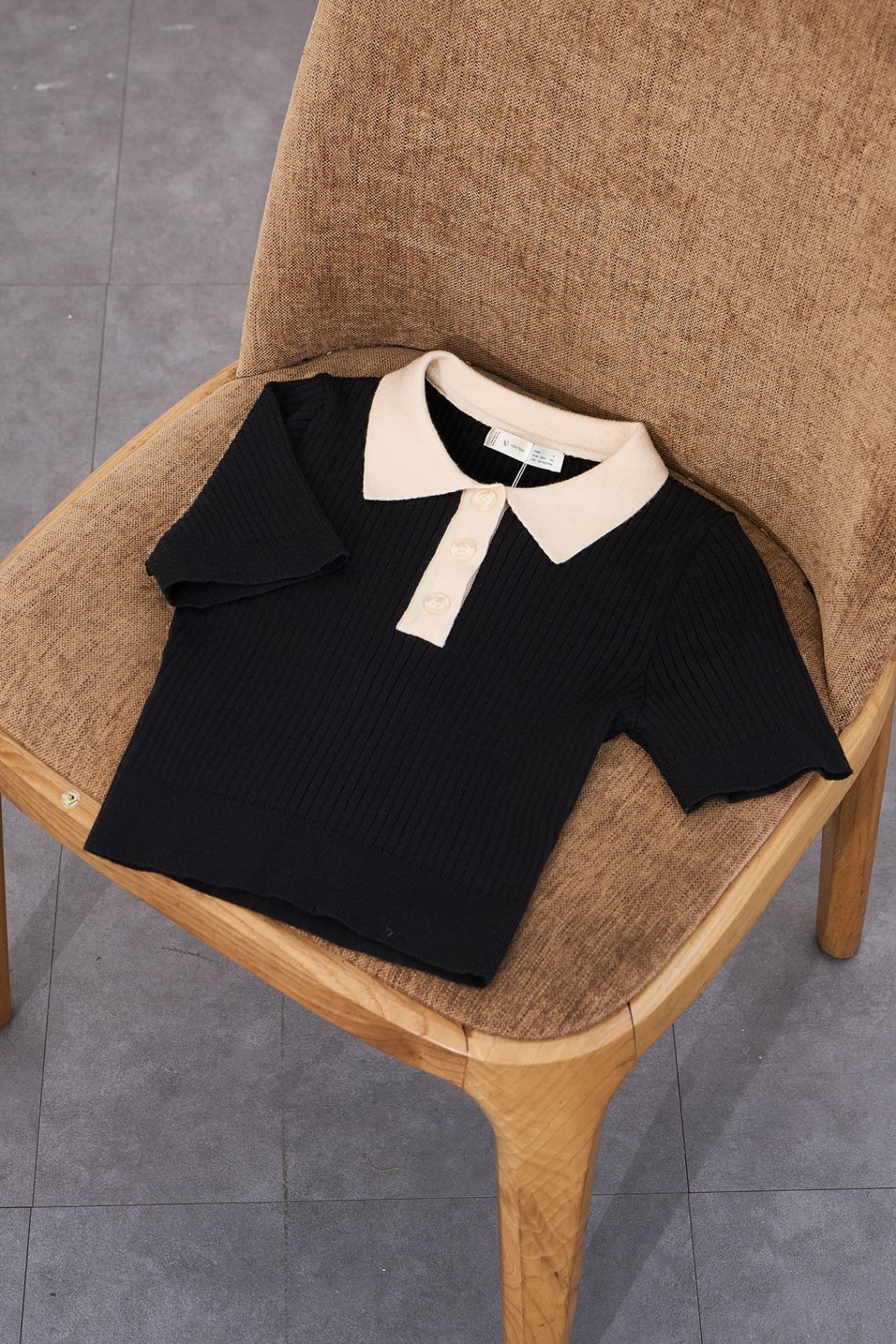 Mô tả sản phẩm : Áo dáng ôm croptop, cổ bẻ, nẹp trụ phối màu, tay cộc, gấu bo.