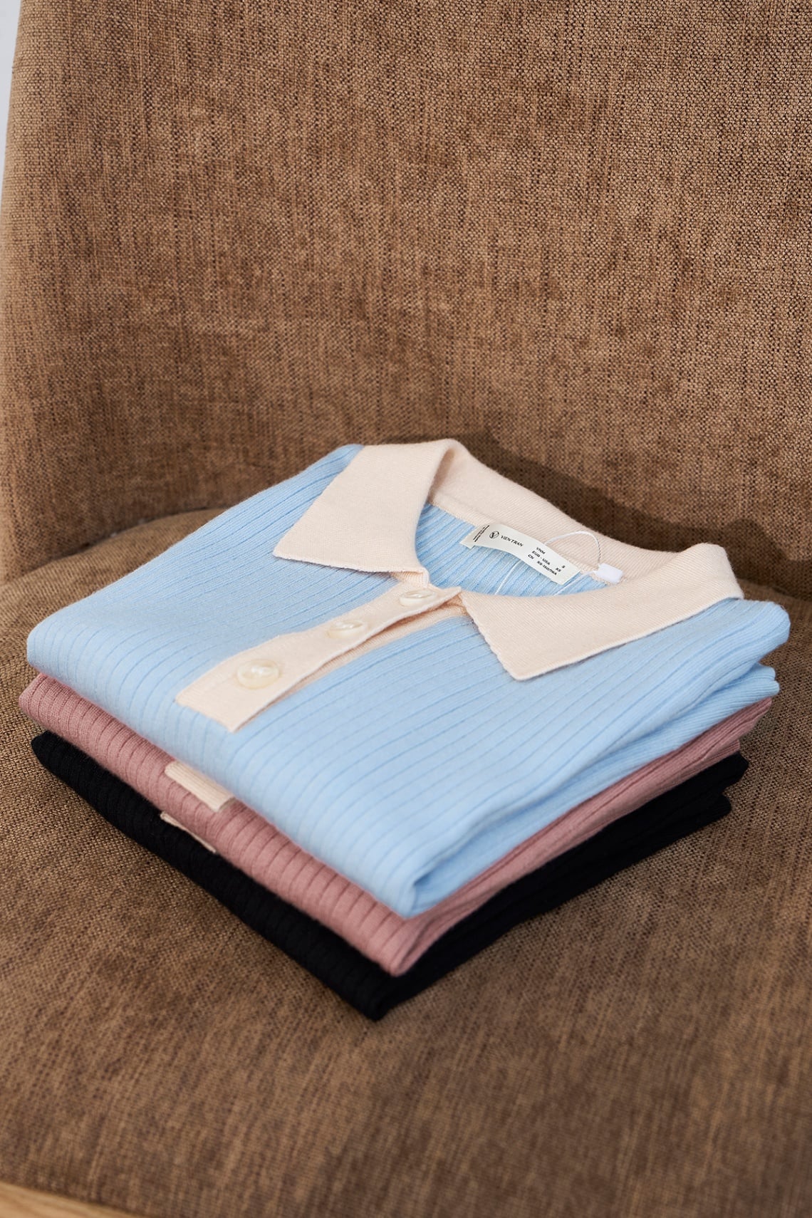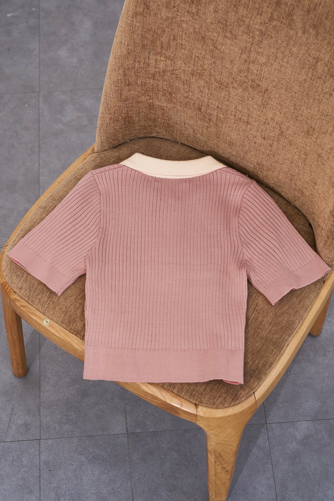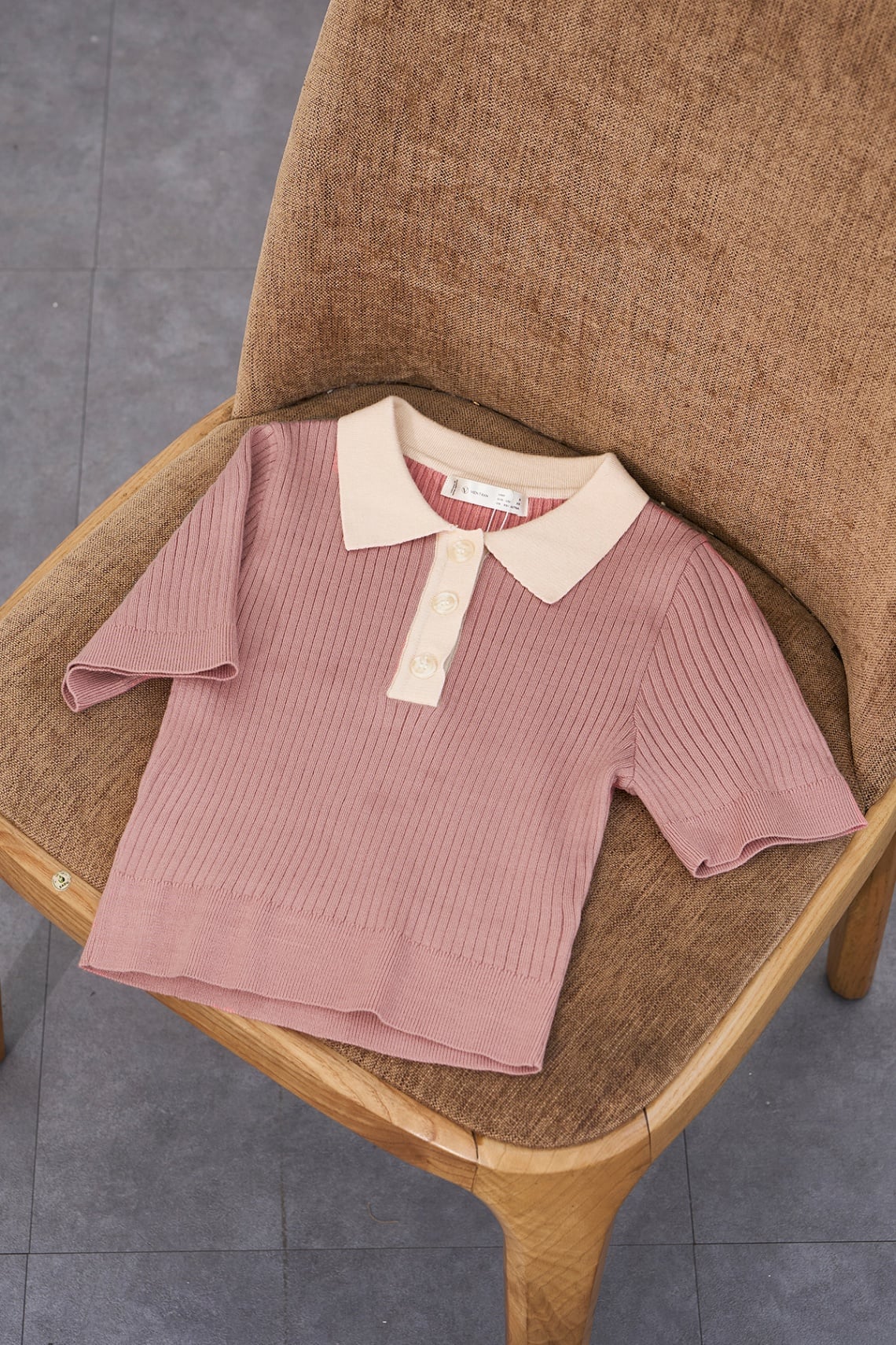 Mô tả sản phẩm : Áo dáng ôm croptop, cổ bẻ, nẹp trụ phối màu, tay cộc, gấu bo.