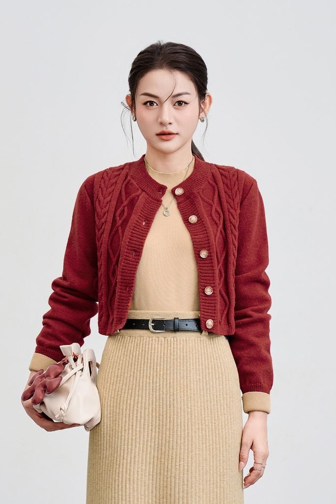 Mô tả sản phẩm : Áo len croptop vặn thừng, cổ tròn, dài tay, cài cúc.