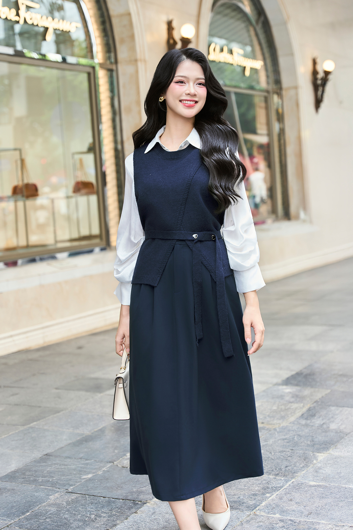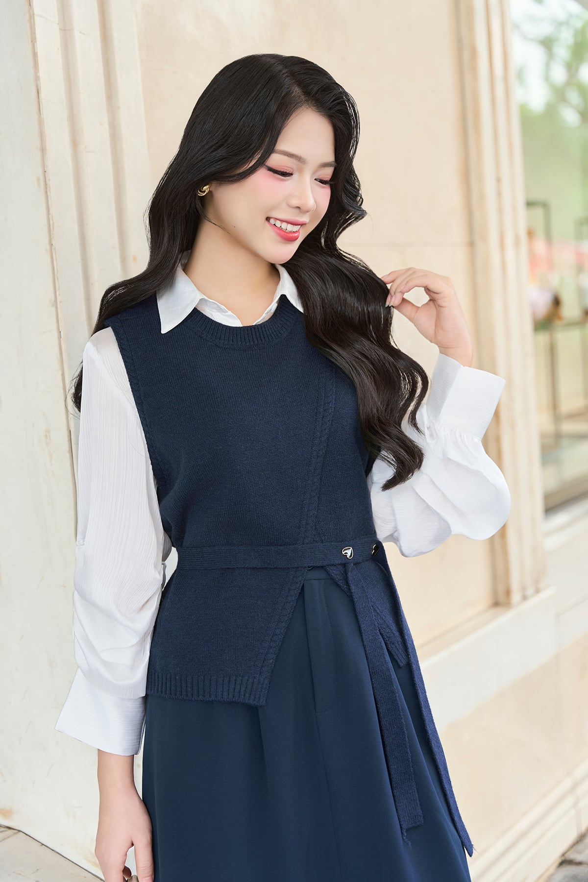 Áo len gile cổ tròn vạt chồng kèm đai đính cúc tim - O61W25Q022 KHUYẾN MÃI - ƯU ĐÃI