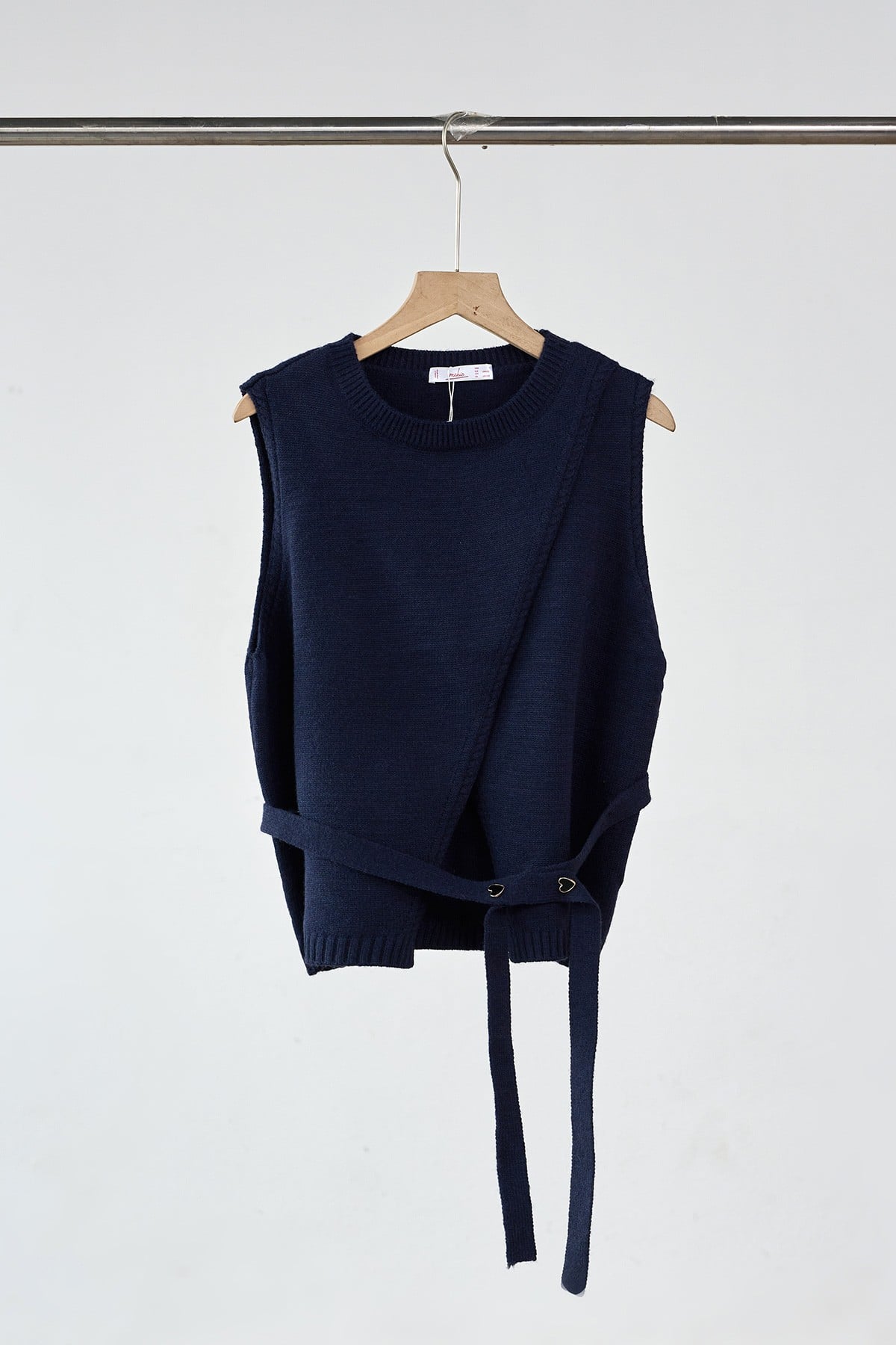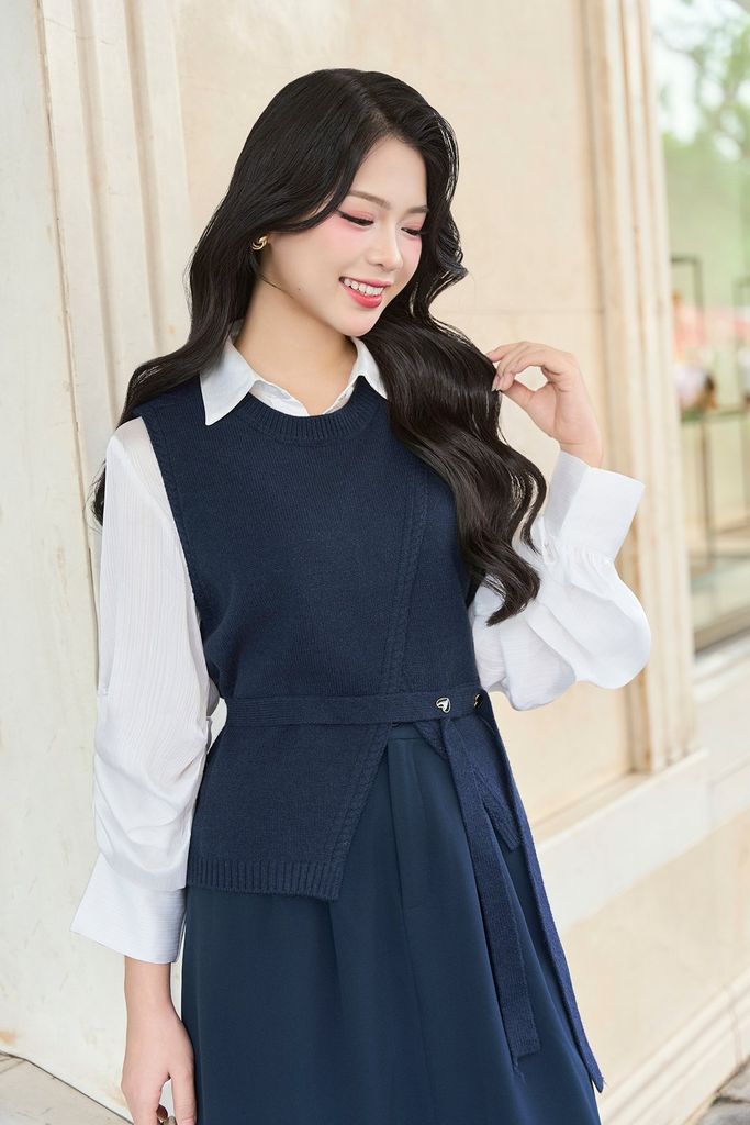 Áo len gile cổ tròn vạt chồng kèm đai đính cúc tim - O61W25Q022