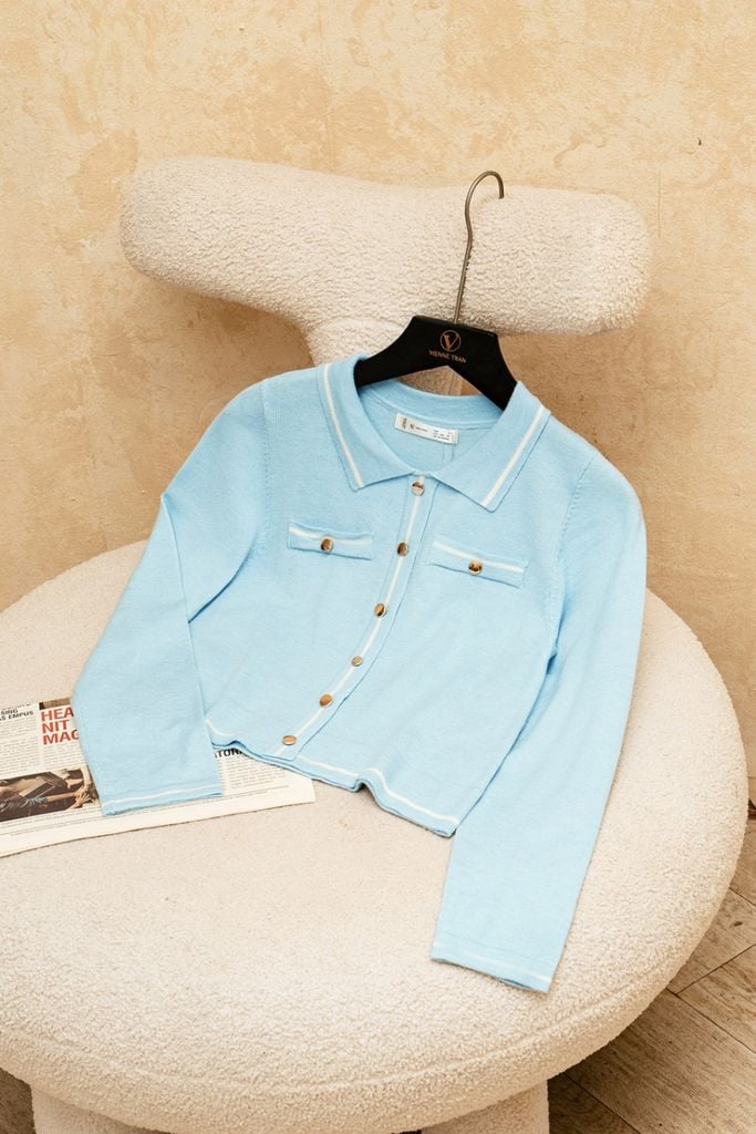 Mô tả sản phẩm : Áo len polo phối kẻ màu, dài tay, túi cơi, đính cúc trang trí