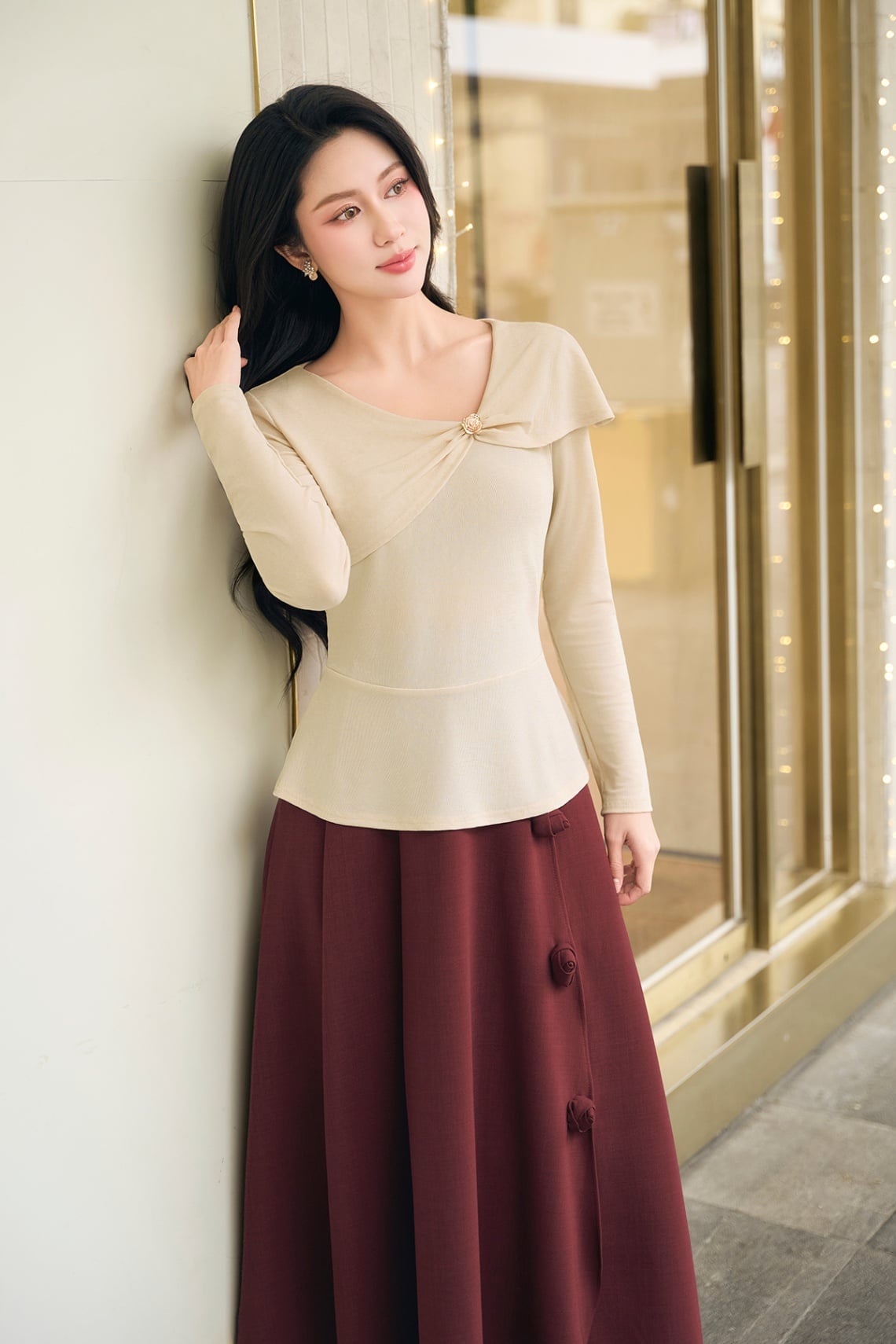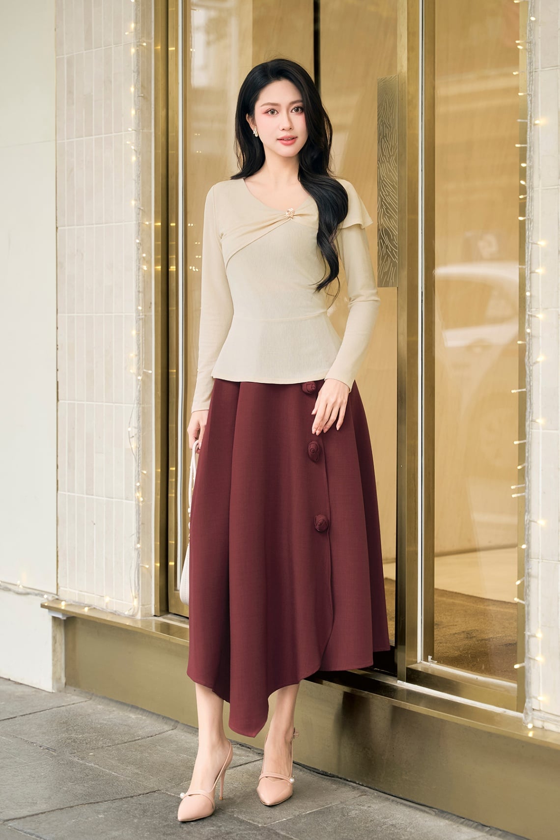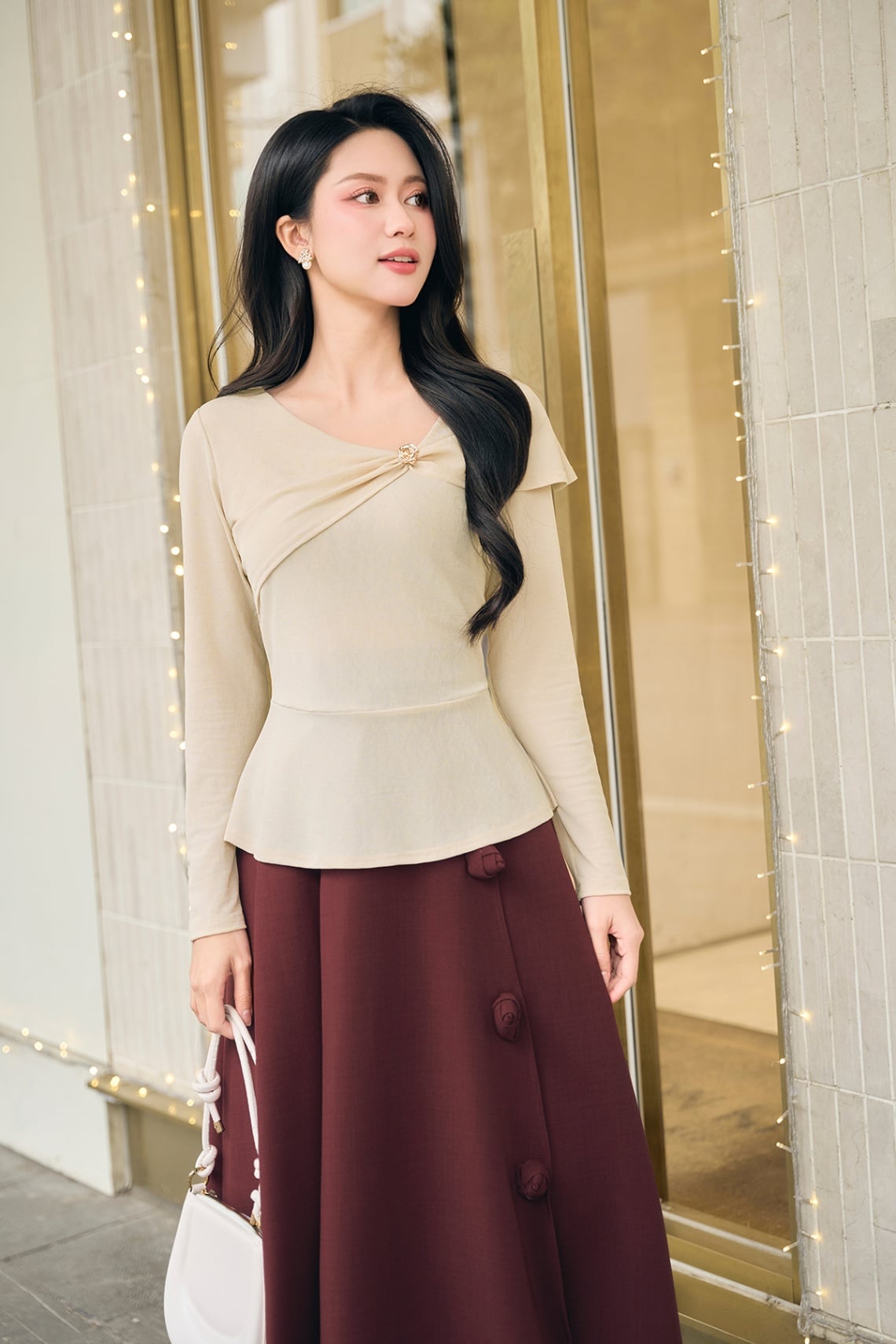 Mô tả sản phẩm : Áo dáng ôm, cổ tim, vai lệch nhún, dài tay, peplum.