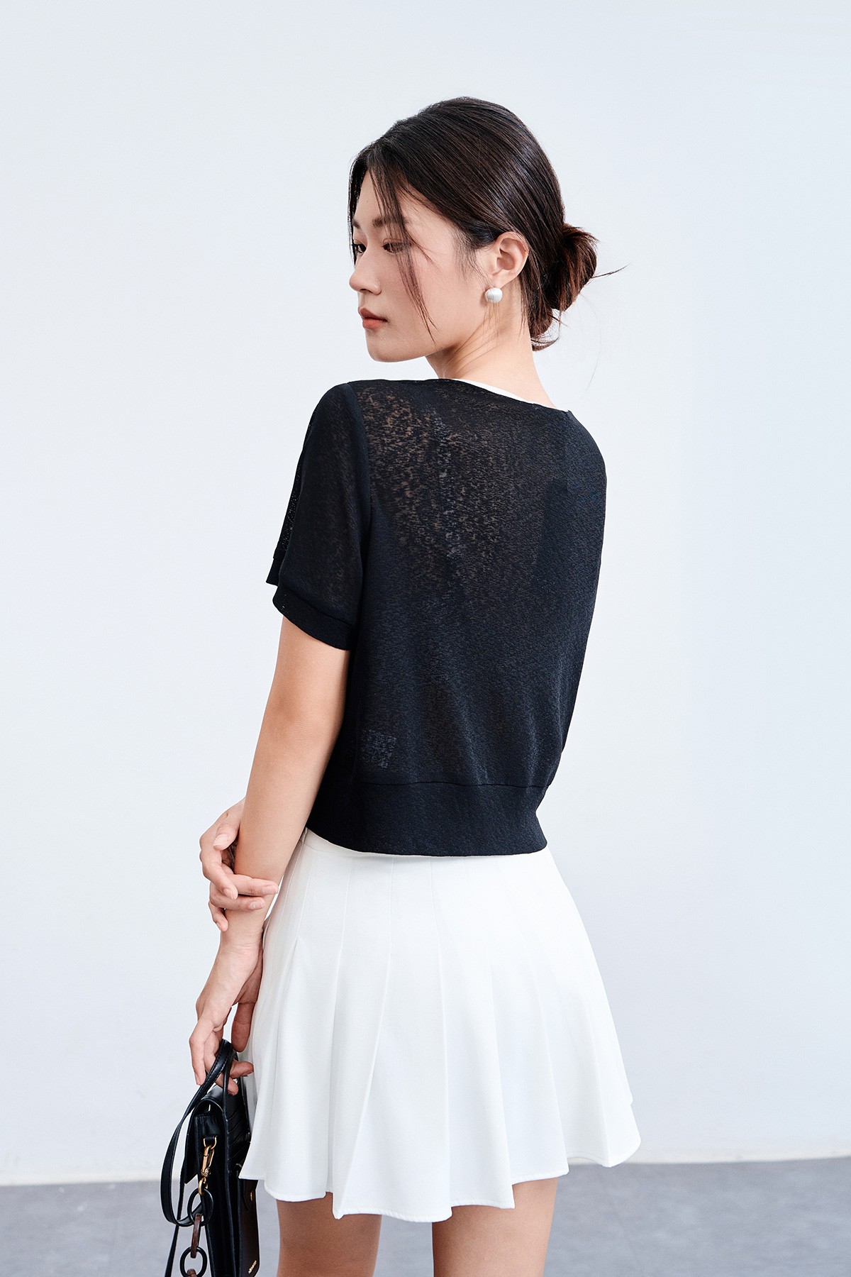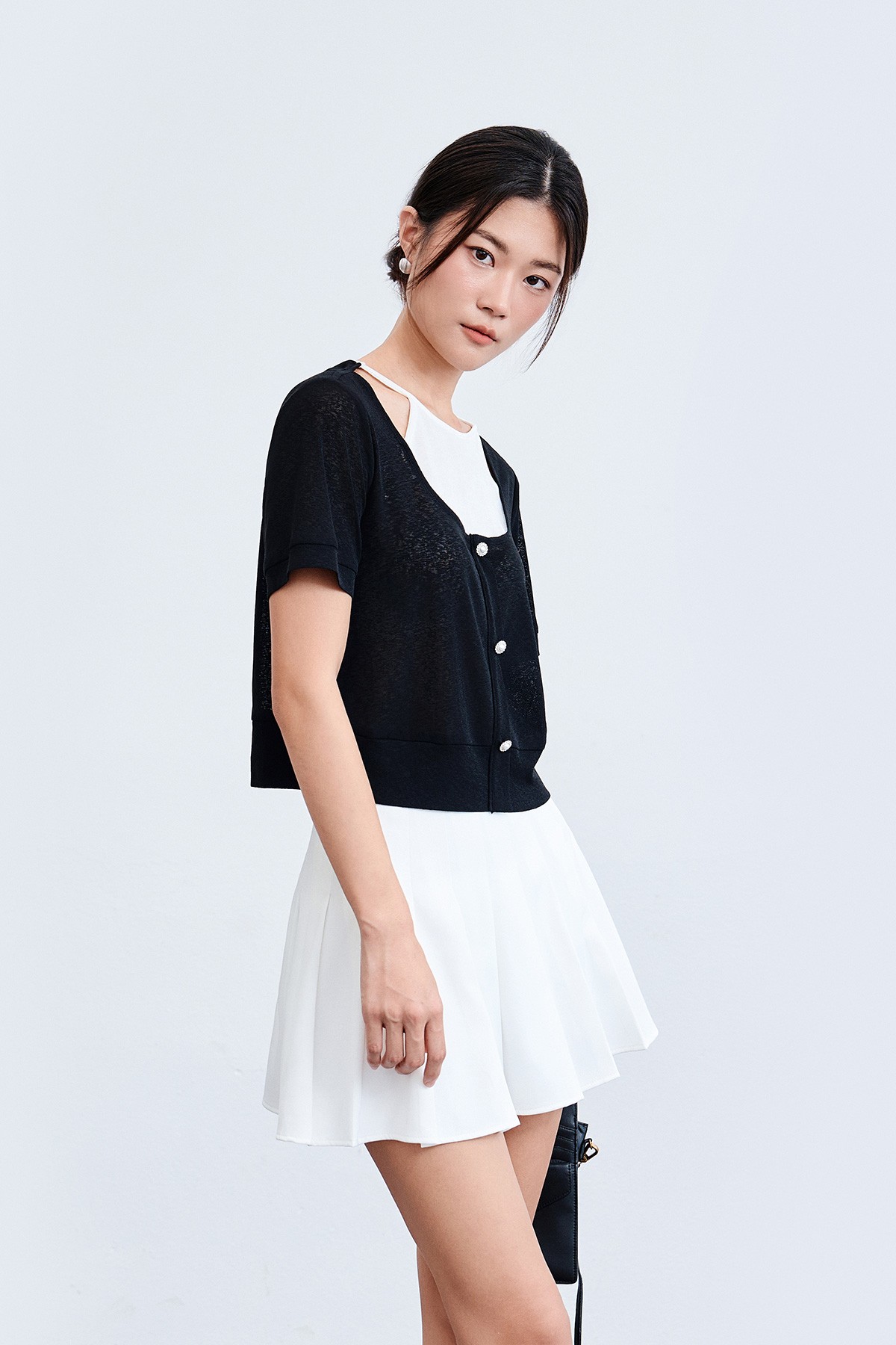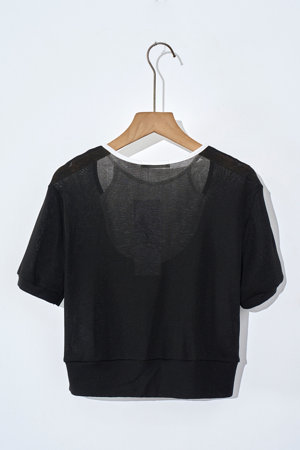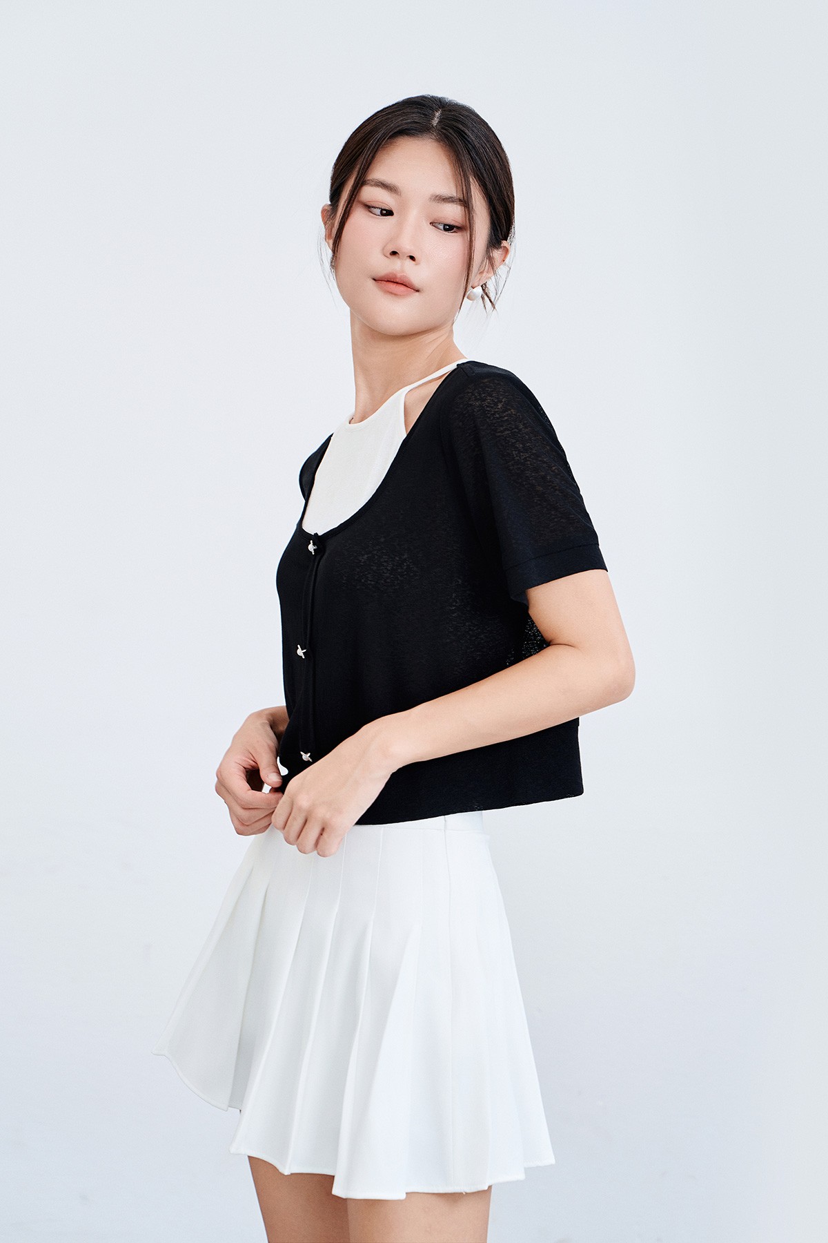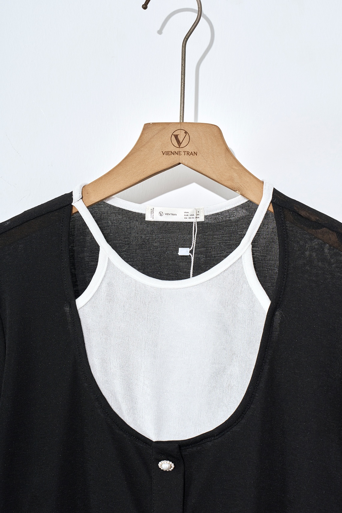Mô tả sản phẩm : Áo len thun dáng suông bo gấu, cổ yếm phối màu, nẹp cúc giả, đính khuy trai đá, tay cộc bo đai.