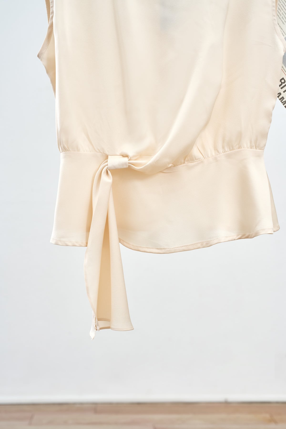Mô tả sản phẩm : Áo dáng ôm, cổ tròn, vai chờm, kéo khóa sau lưng, bèo rủ lệch 1 bên.