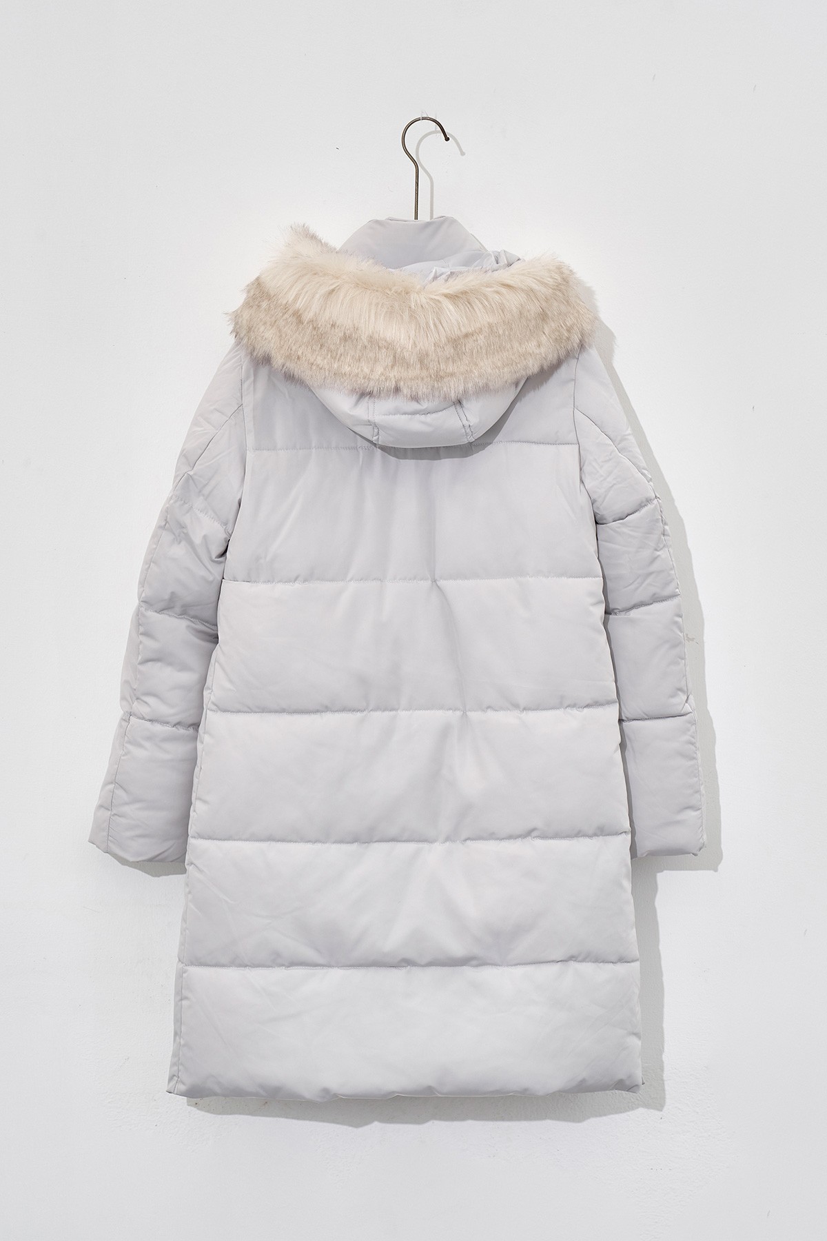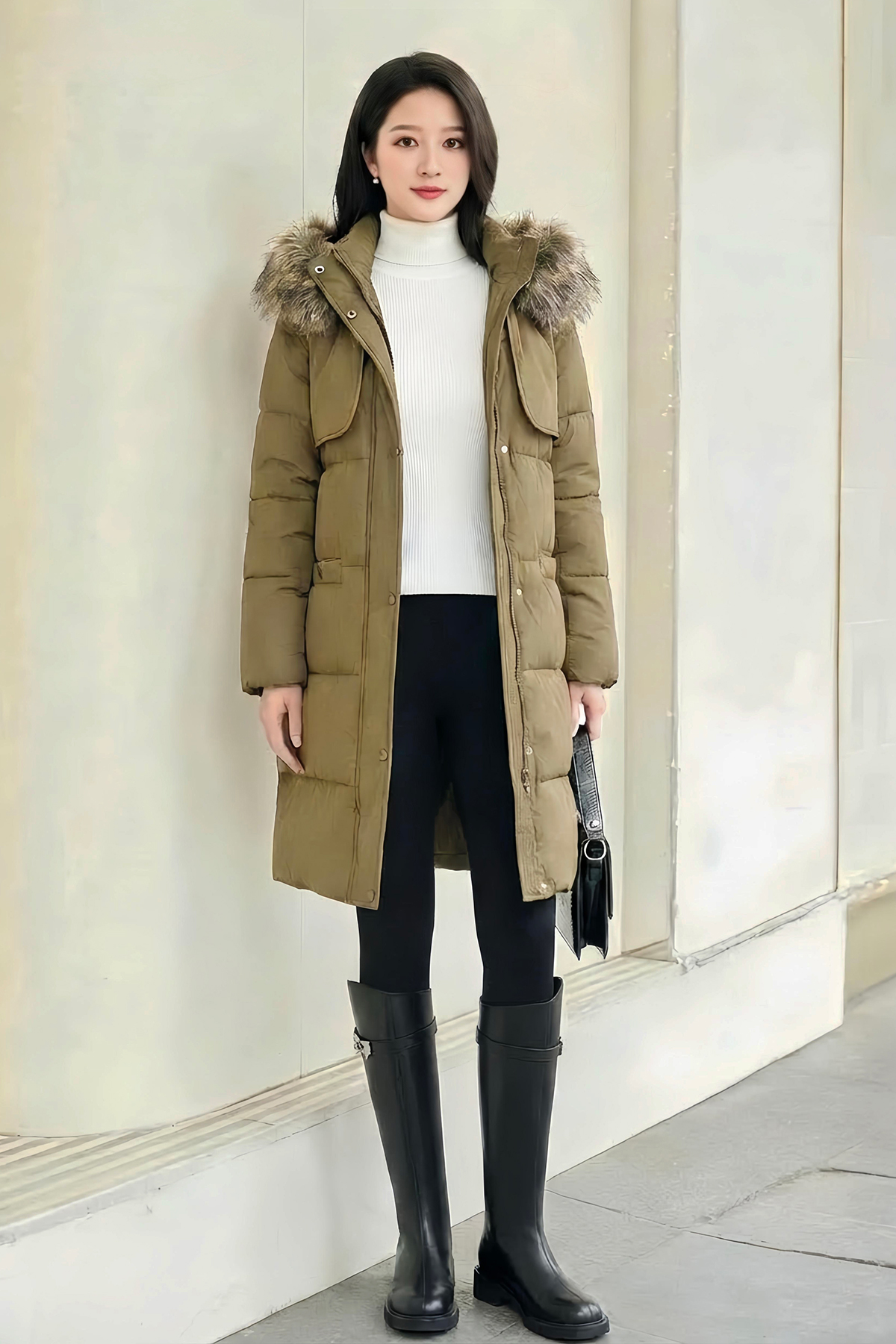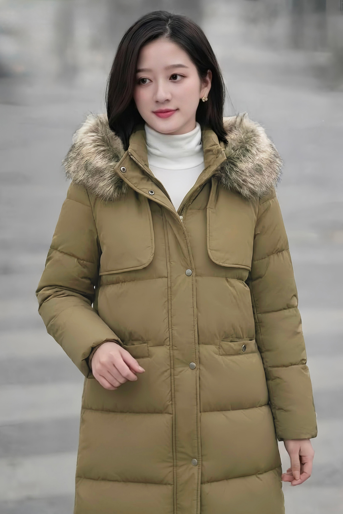 Mô tả sản phẩm : Áo phao dáng dài nhồi bông, kéo khóa, phối lông có khóa cửa mũ.