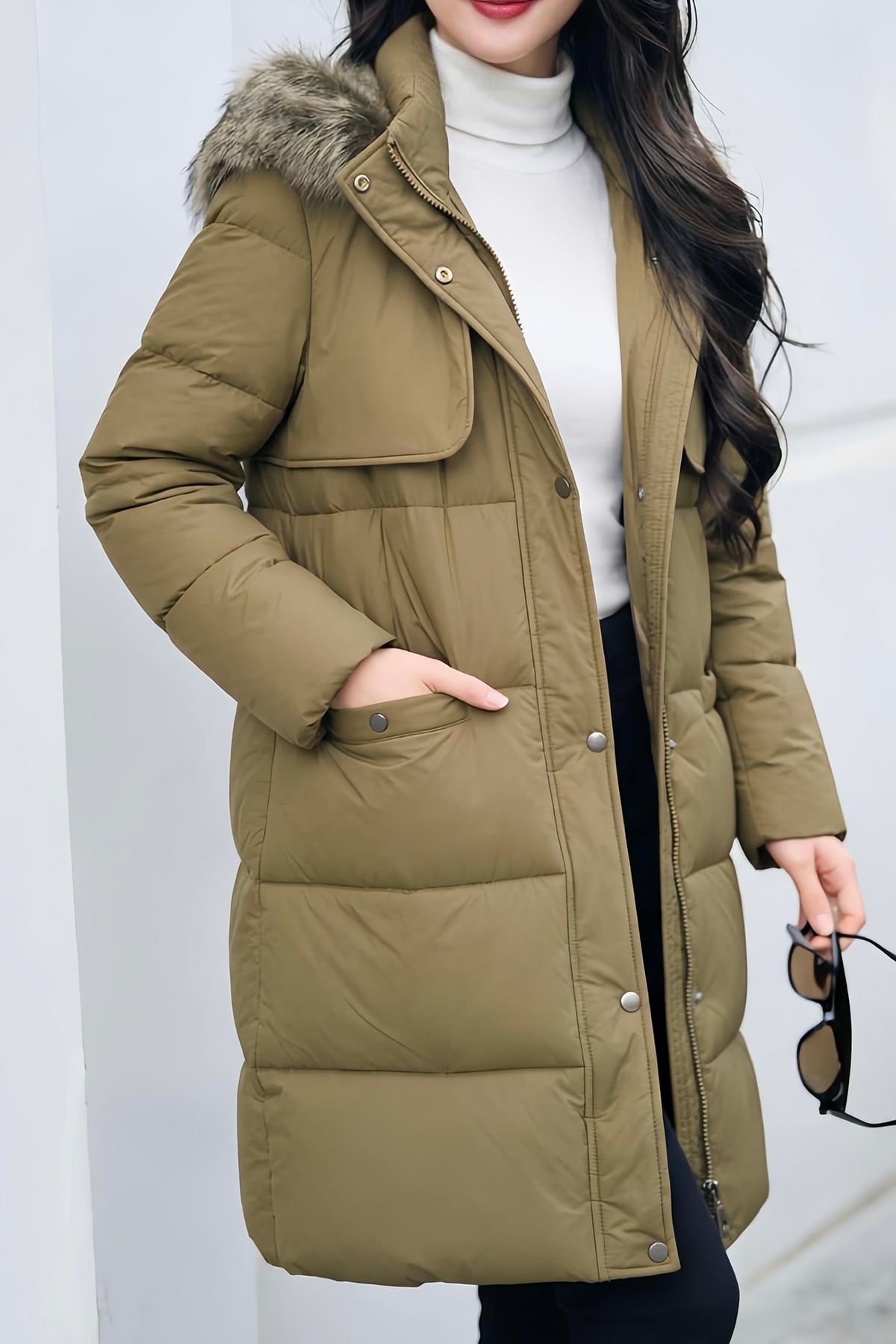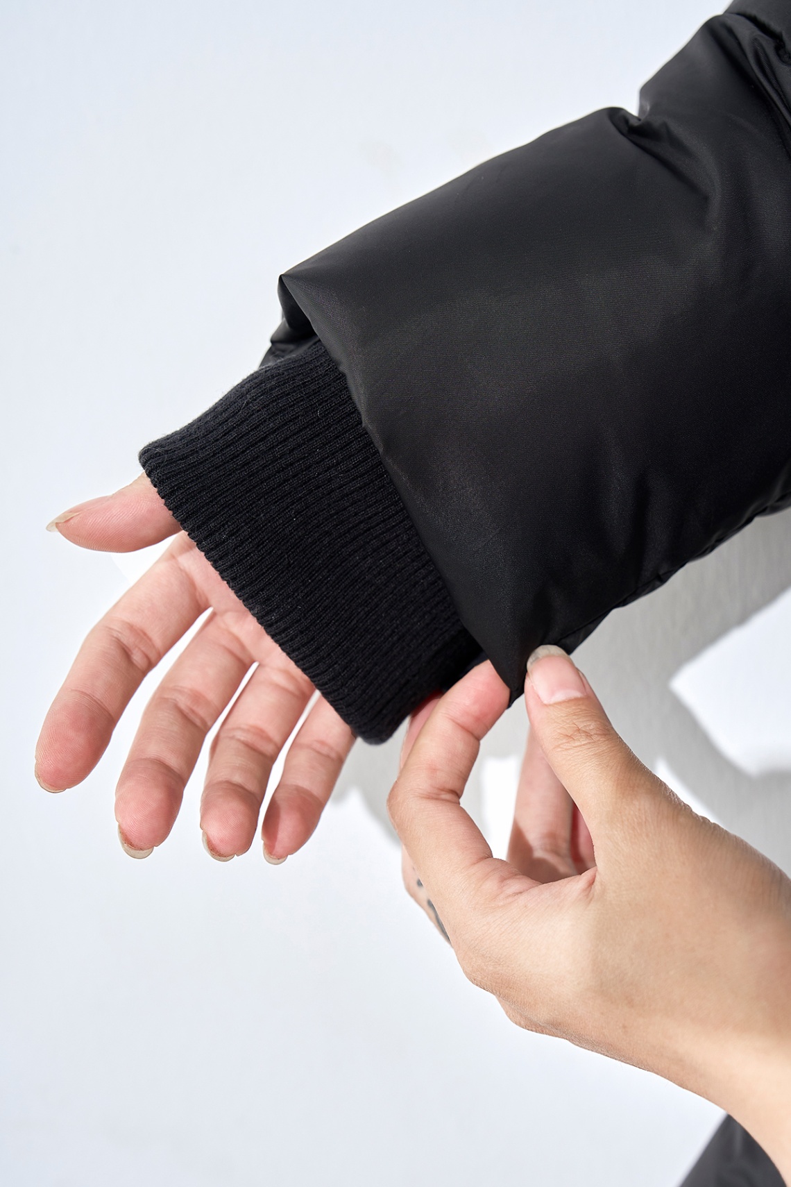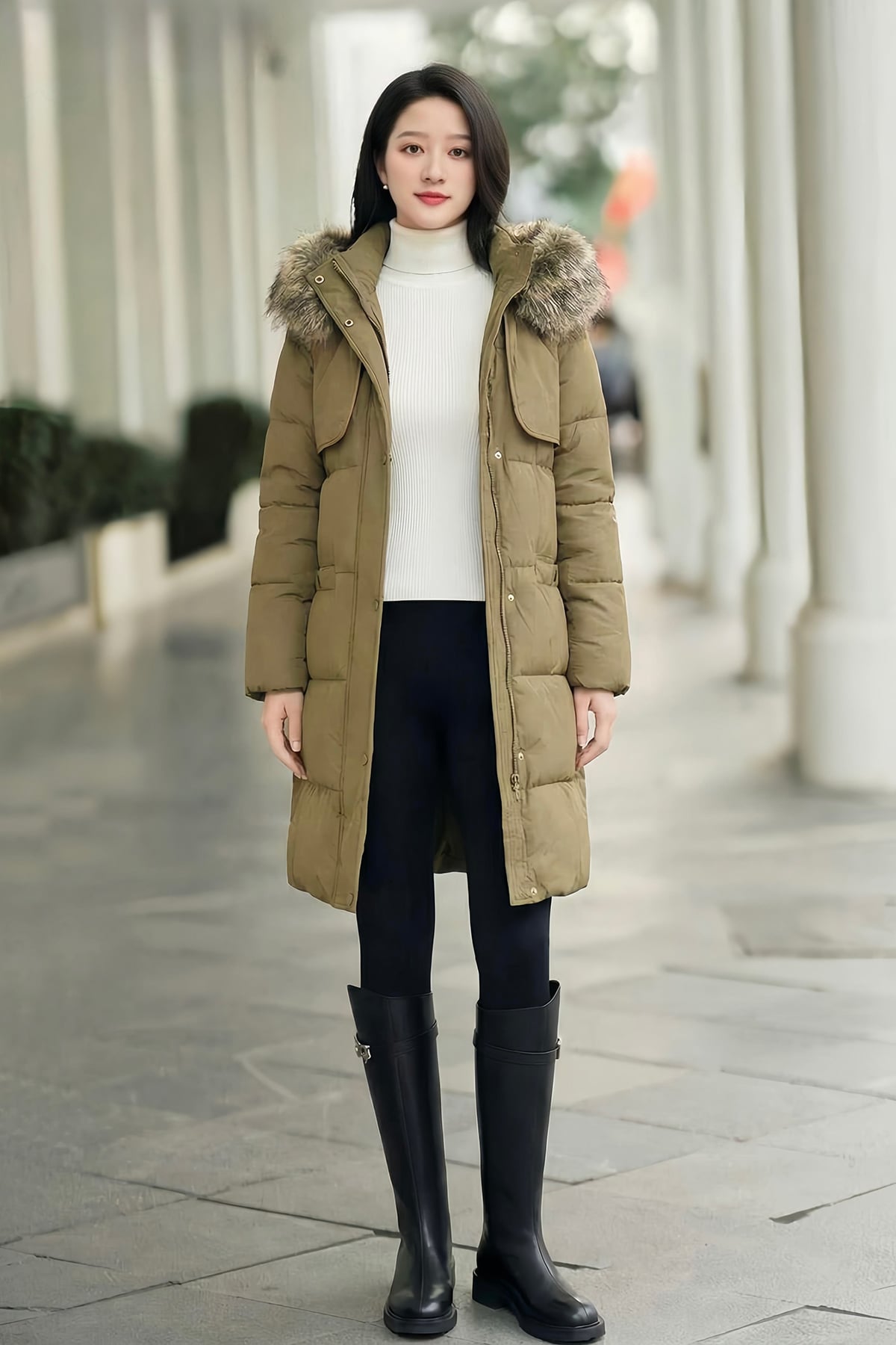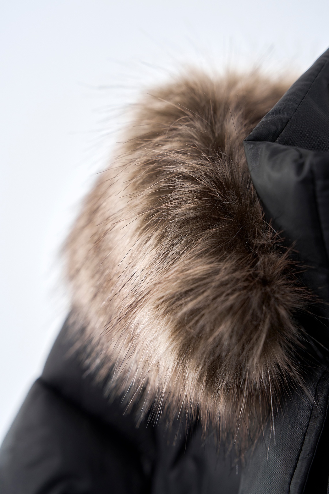 Mô tả sản phẩm : Áo phao dáng dài nhồi bông, kéo khóa, phối lông có khóa cửa mũ.