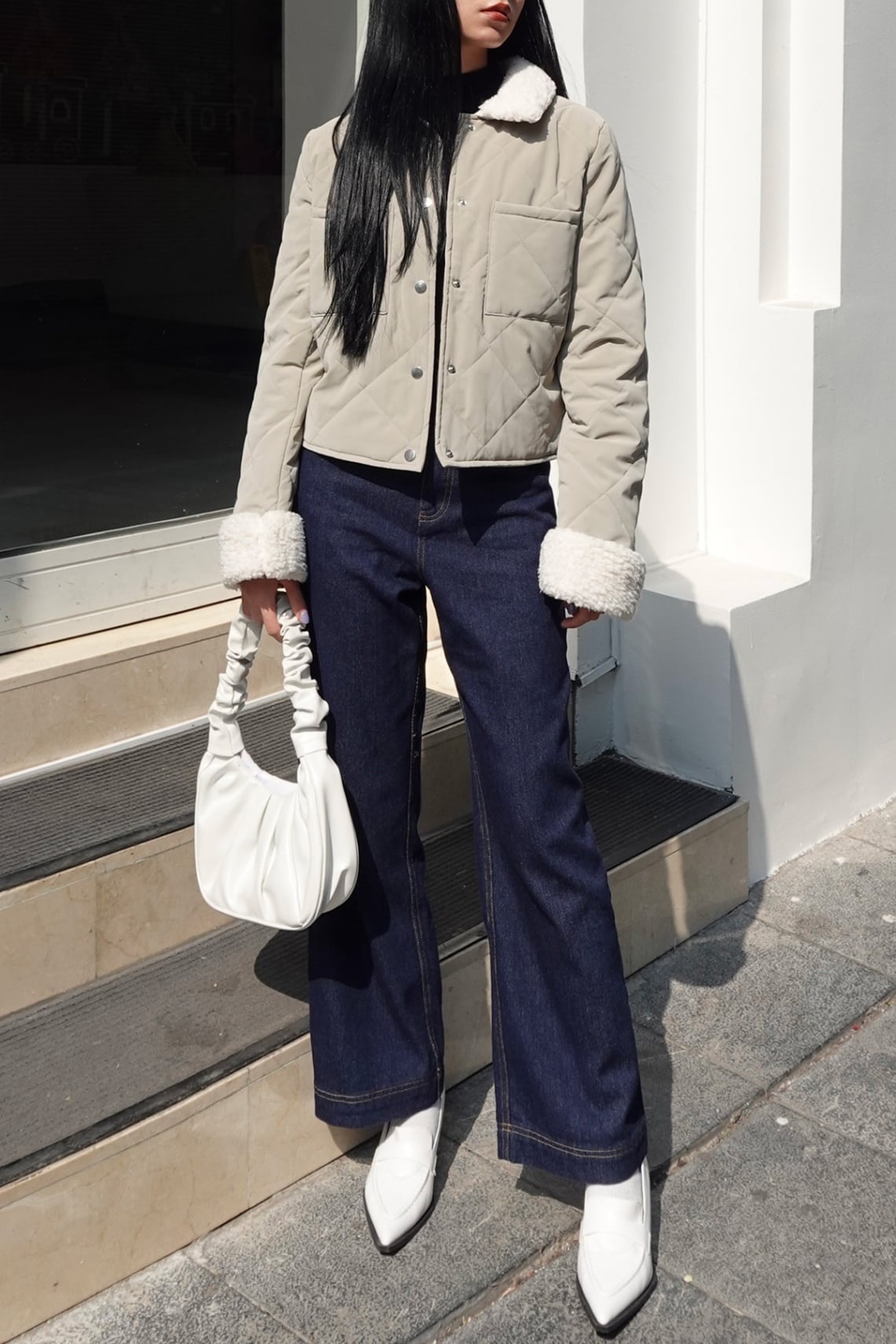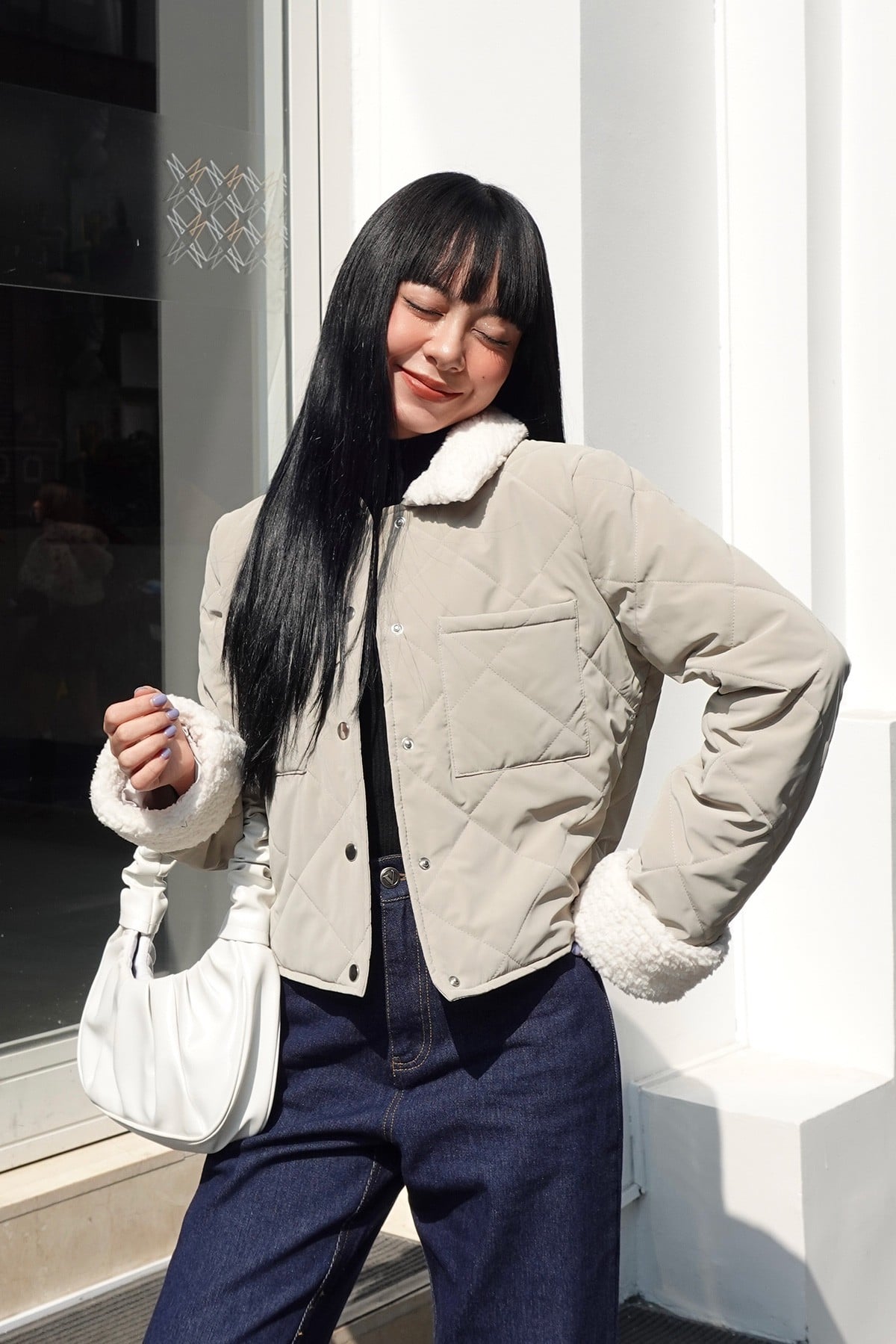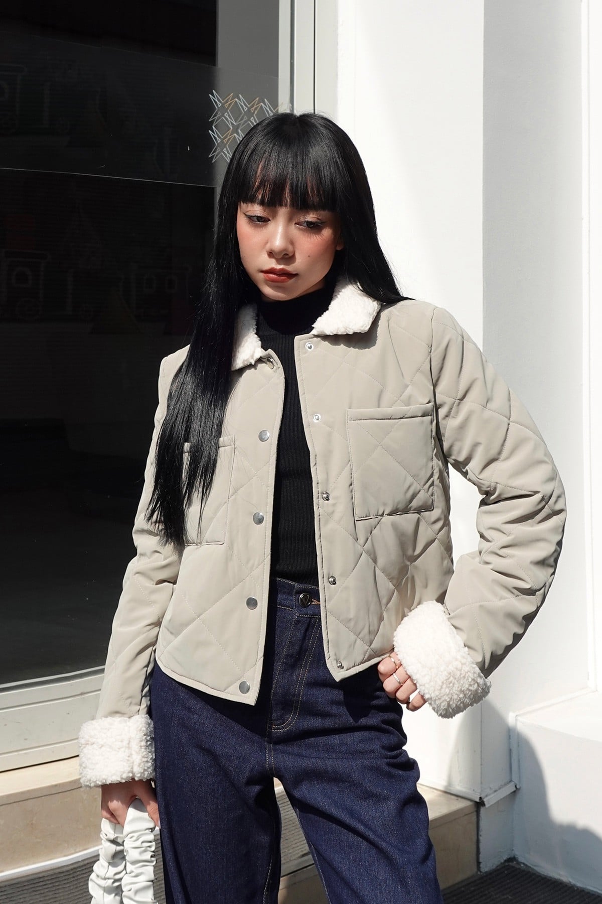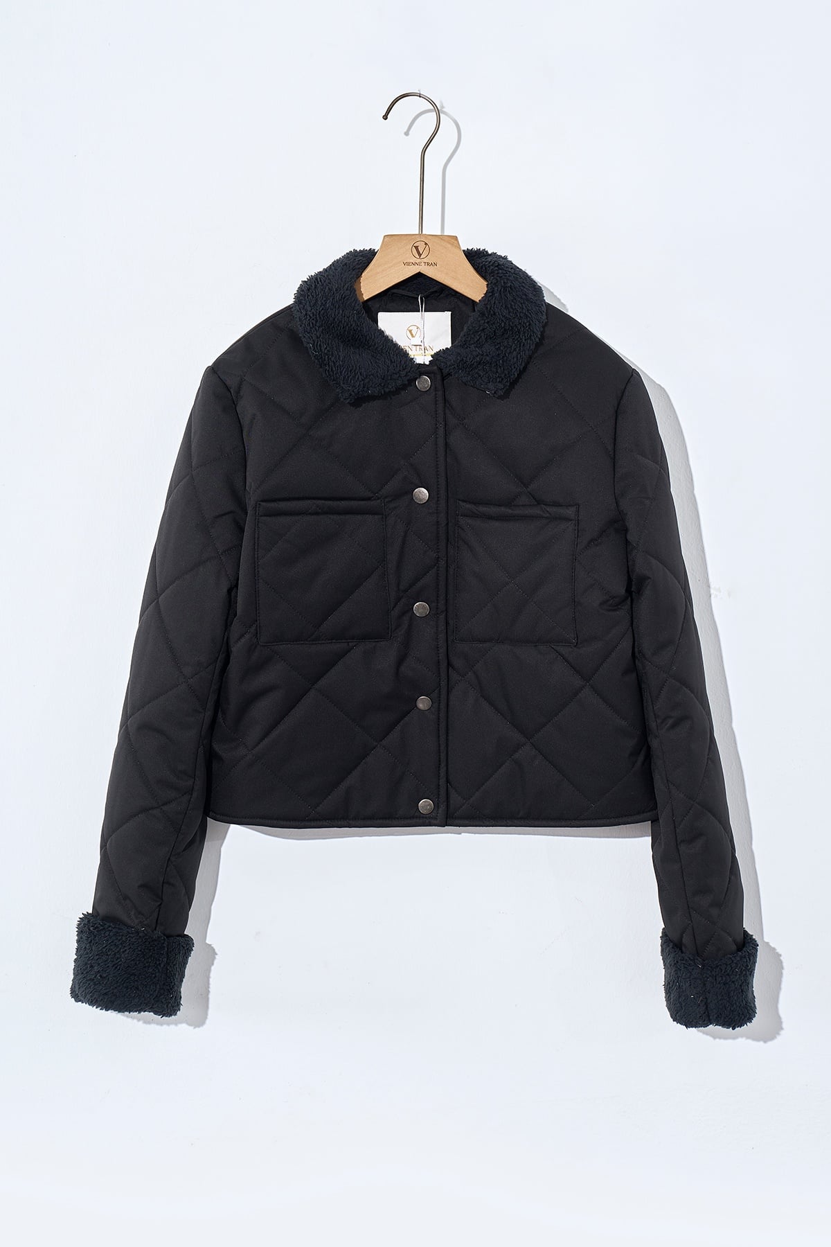 Mô tả sản phẩm : Mô tả sản phẩm: Áo phao dáng ngắn, chần trám, túi ốp, phối lông.