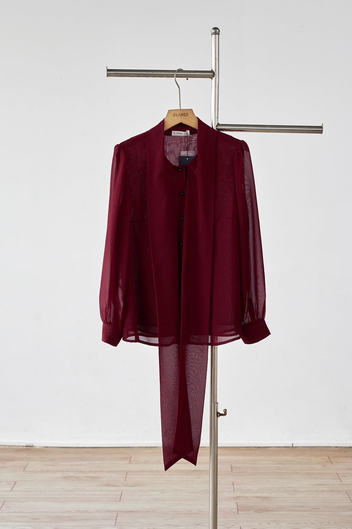 Mô tả sản phẩm : Áo sơ mi dáng suông, cổ buộc nơ, nẹp đính cúc sơ mi.
