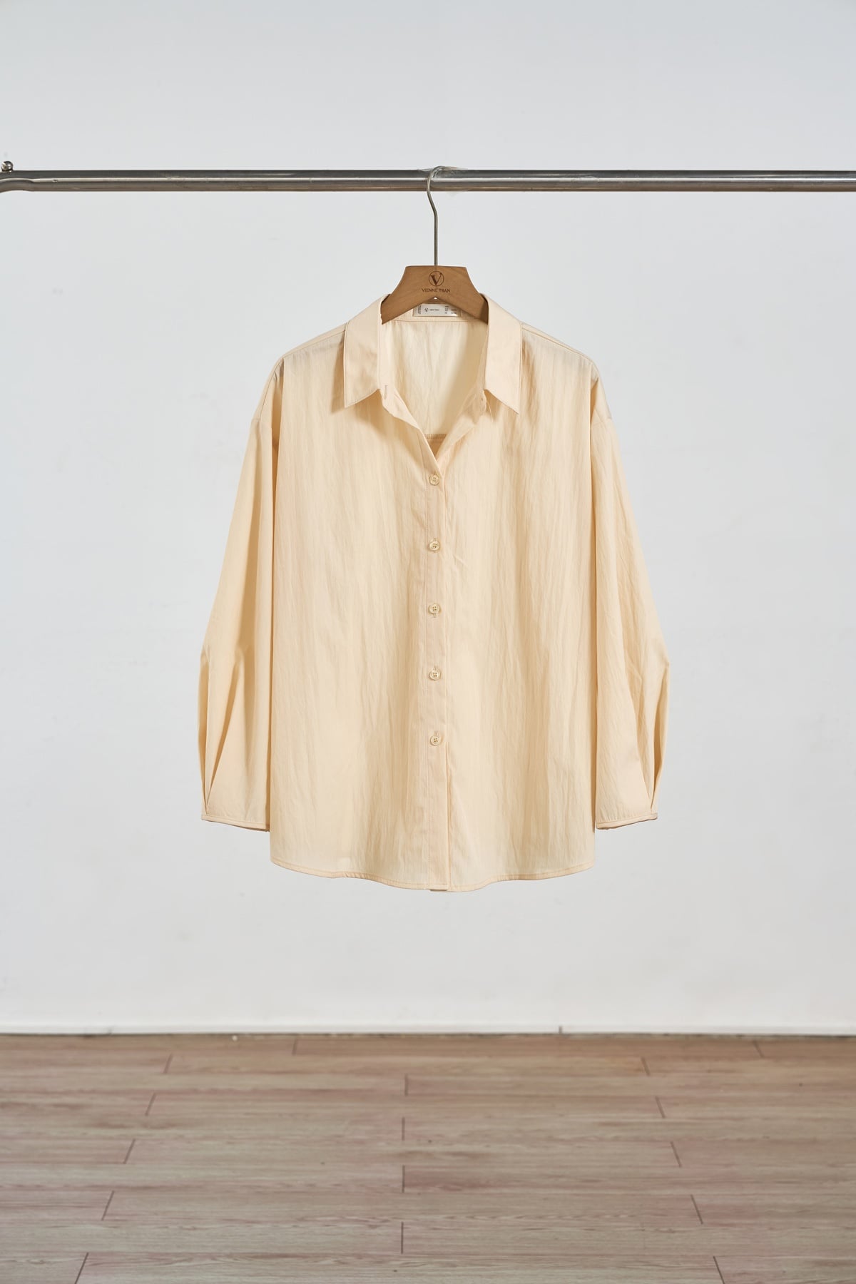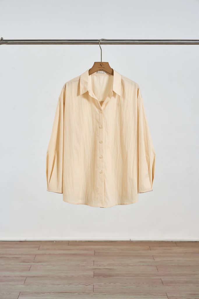 Mô tả sản phẩm: Áo sơ mi cổ đức, viền cửa tay, xếp ly tay phồng, dáng A nhẹ.