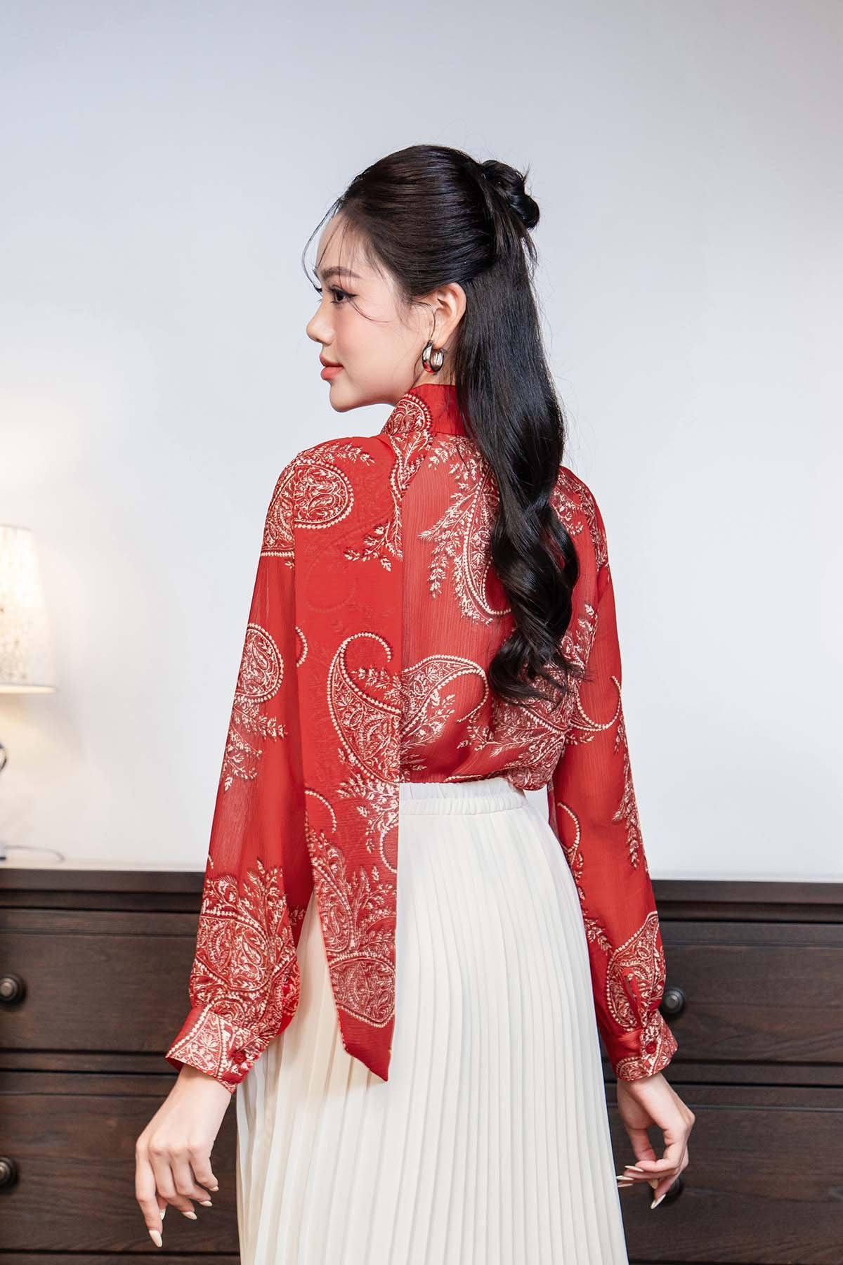 Mô tả sản phẩm : Dáng suông, cổ buộc nơ, tay zaplang, nẹp đính cúc, tay măng séc