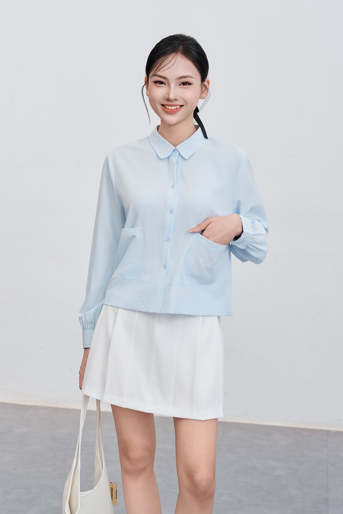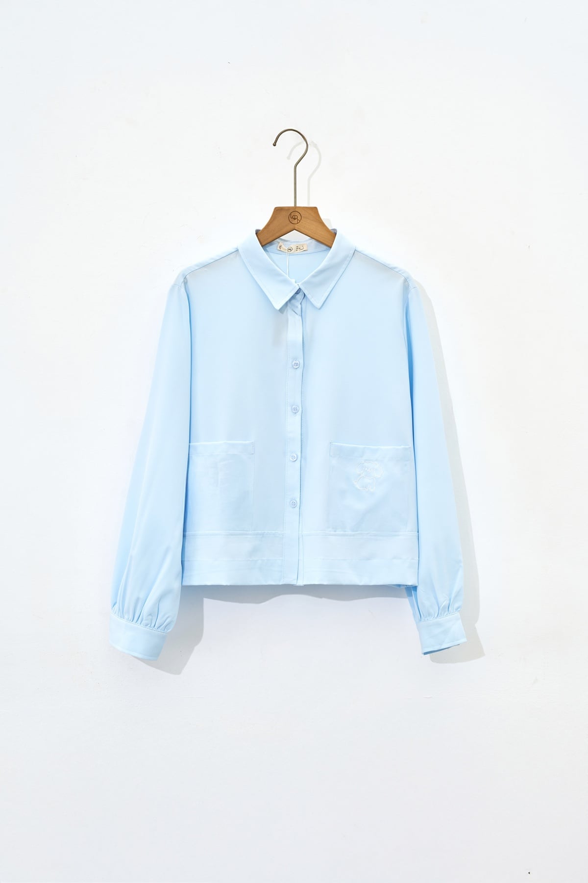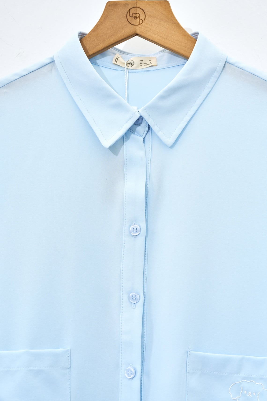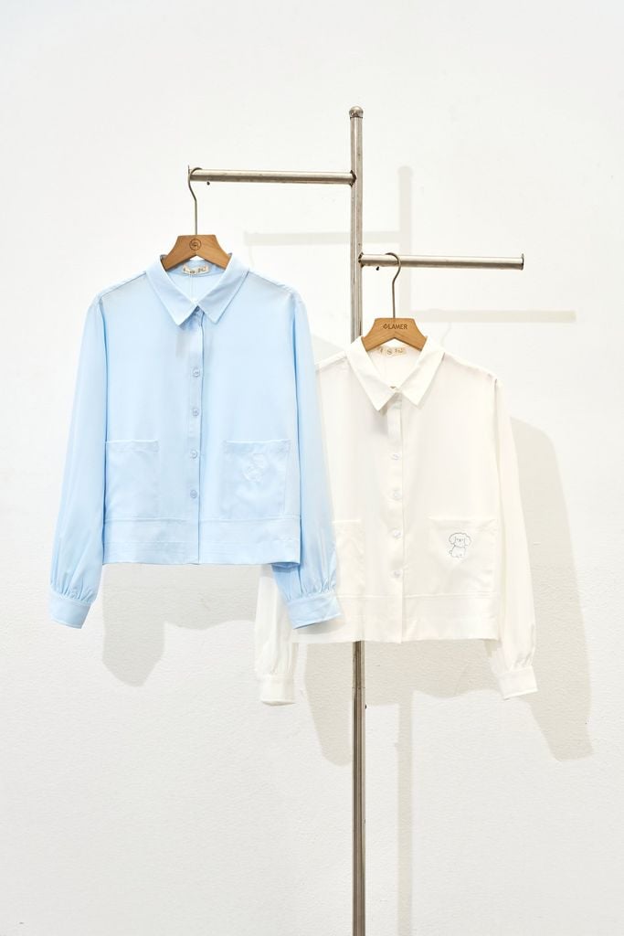 Mô tả sản phẩm : Áo sơ mi dáng rộng, cổ đức, 2 túi ốp, thêu túi áo trái.