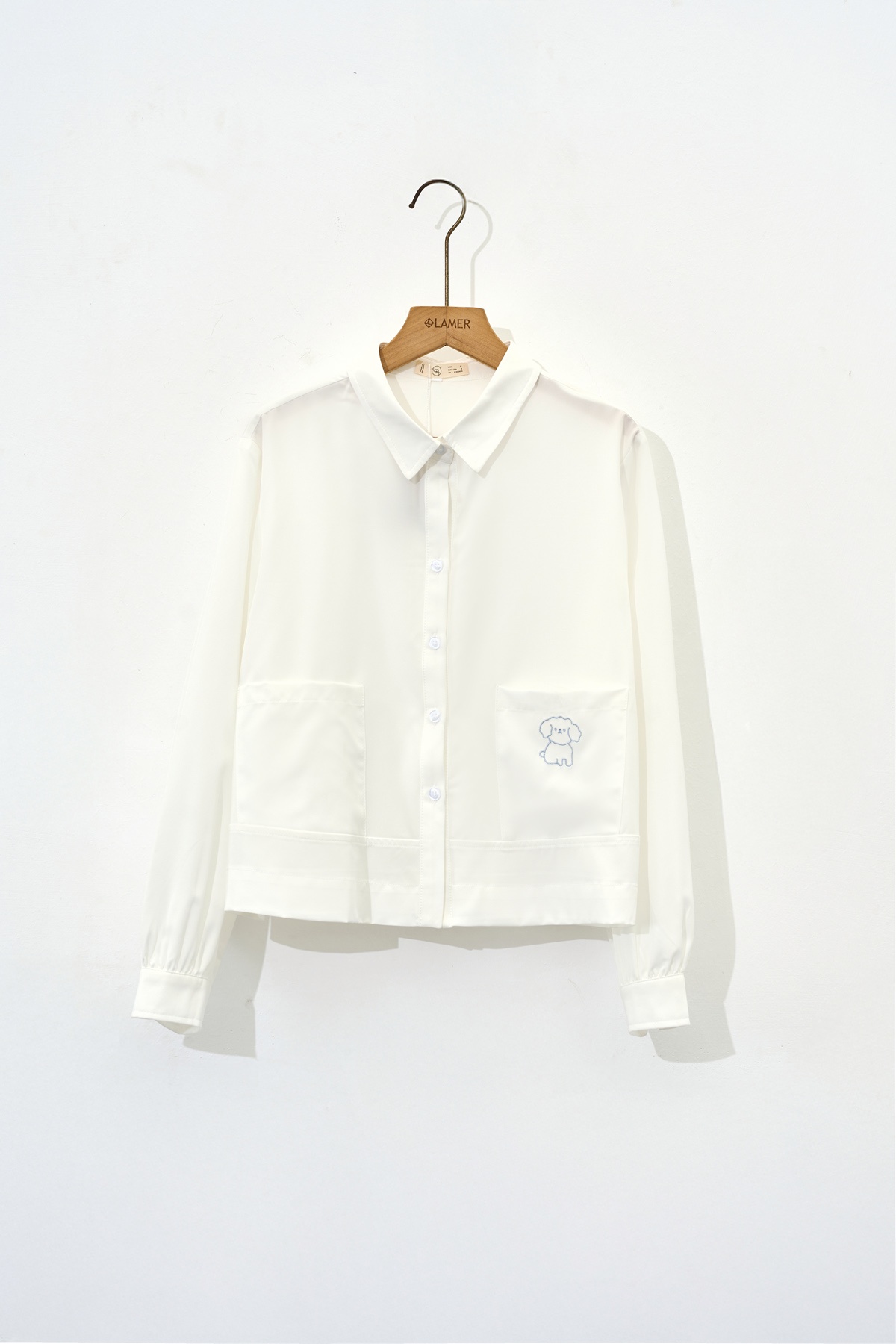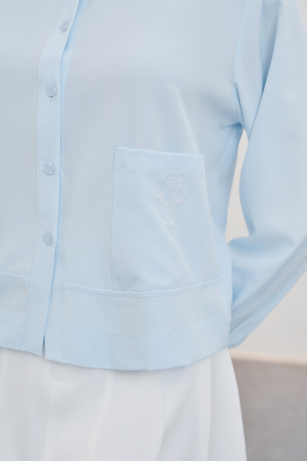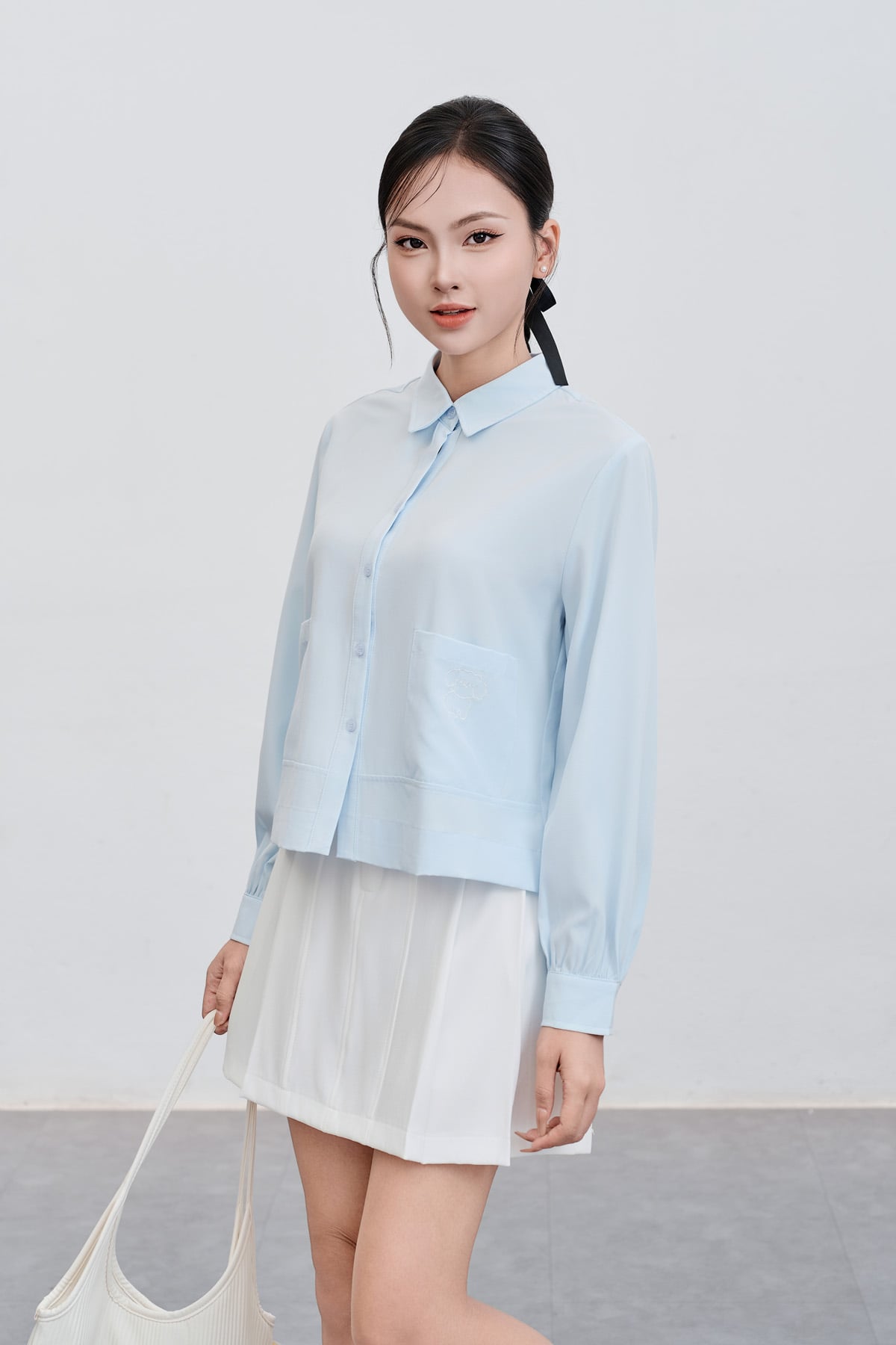 Mô tả sản phẩm : Áo sơ mi dáng rộng, cổ đức, 2 túi ốp, thêu túi áo trái.