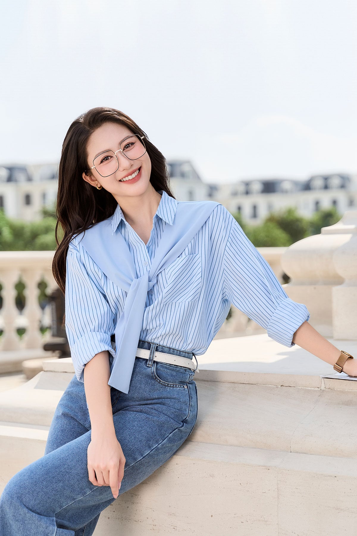 Mô tả sản phẩm : Áo sơ mi dáng rộng , cổ đức , dài tay , khăn quàng , phối màu