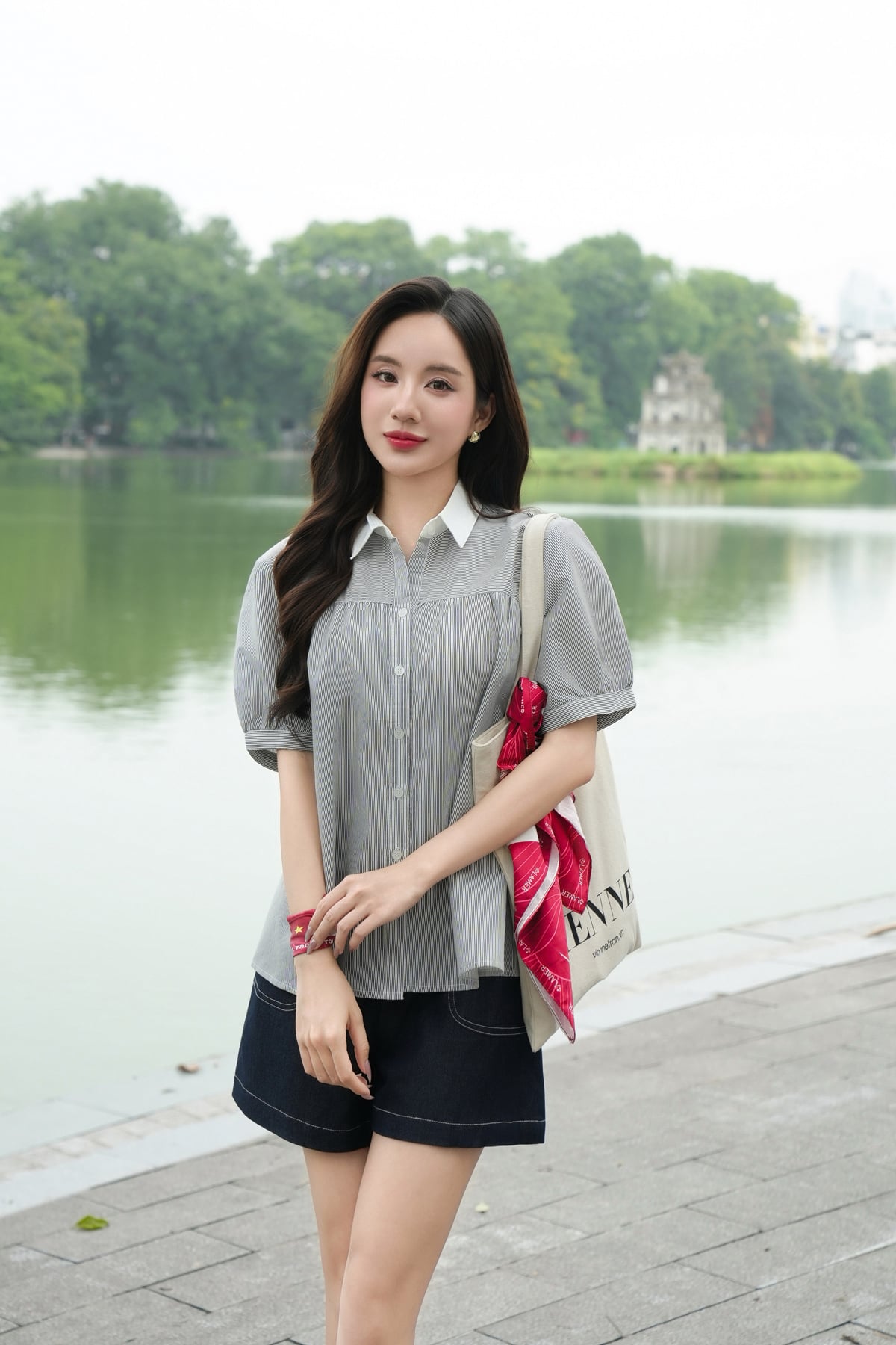 Mô tả sản phẩm: Áo dáng suông, cổ phối, cầu ngực nhún, nẹp đính cúc sơ mi.