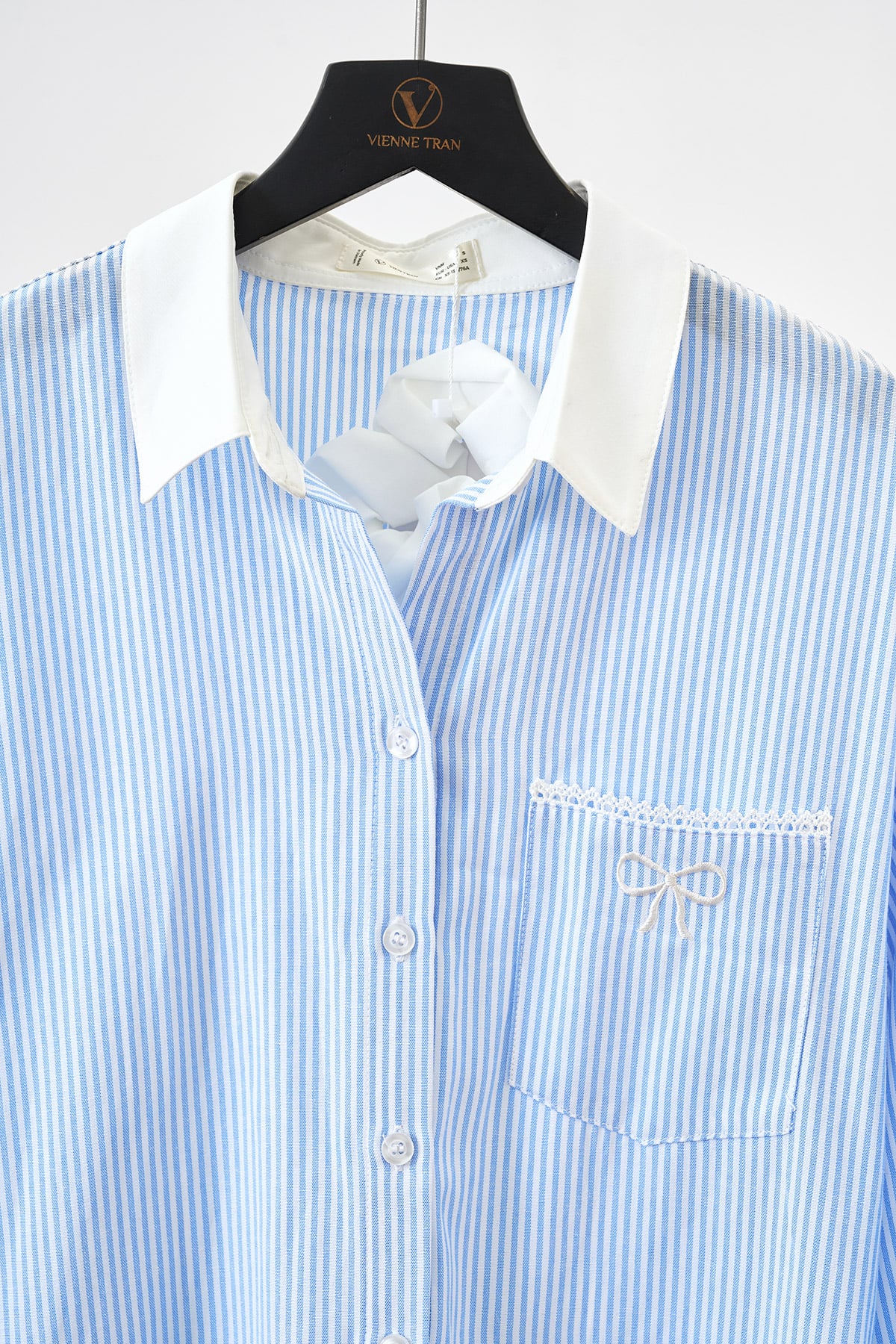 Mô tả sản phẩm : Áo sơ mi cổ đức, tay bồng, dài tay, túi ốp, kẹp ren phối màu, thêu túi. GB O64S25H005