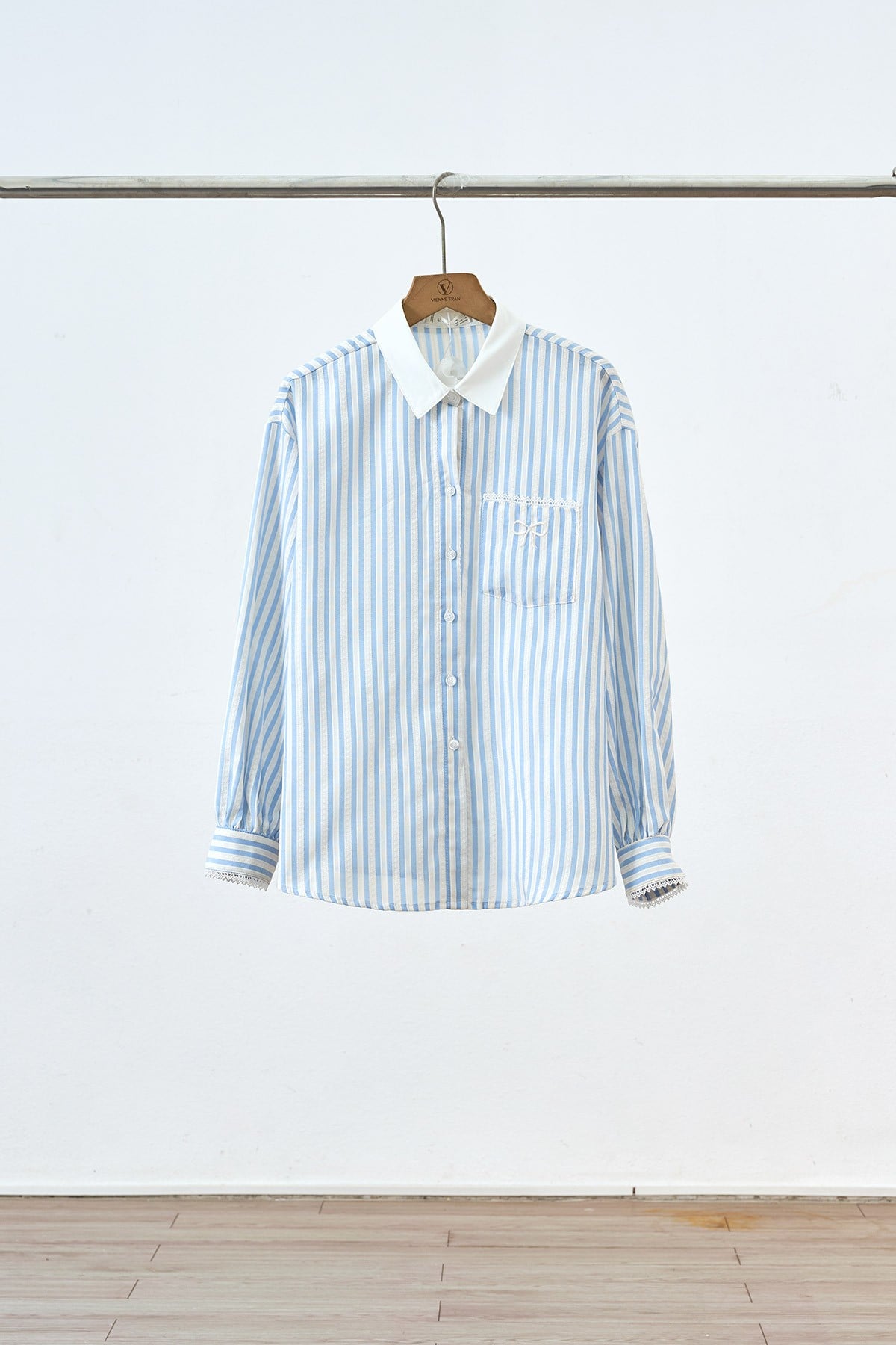 Mô tả sản phẩm : Áo sơ mi cổ đức, tay bồng, dài tay, túi ốp, kẹp ren, phối màu, thêu nơ túi. GB V64S25H005