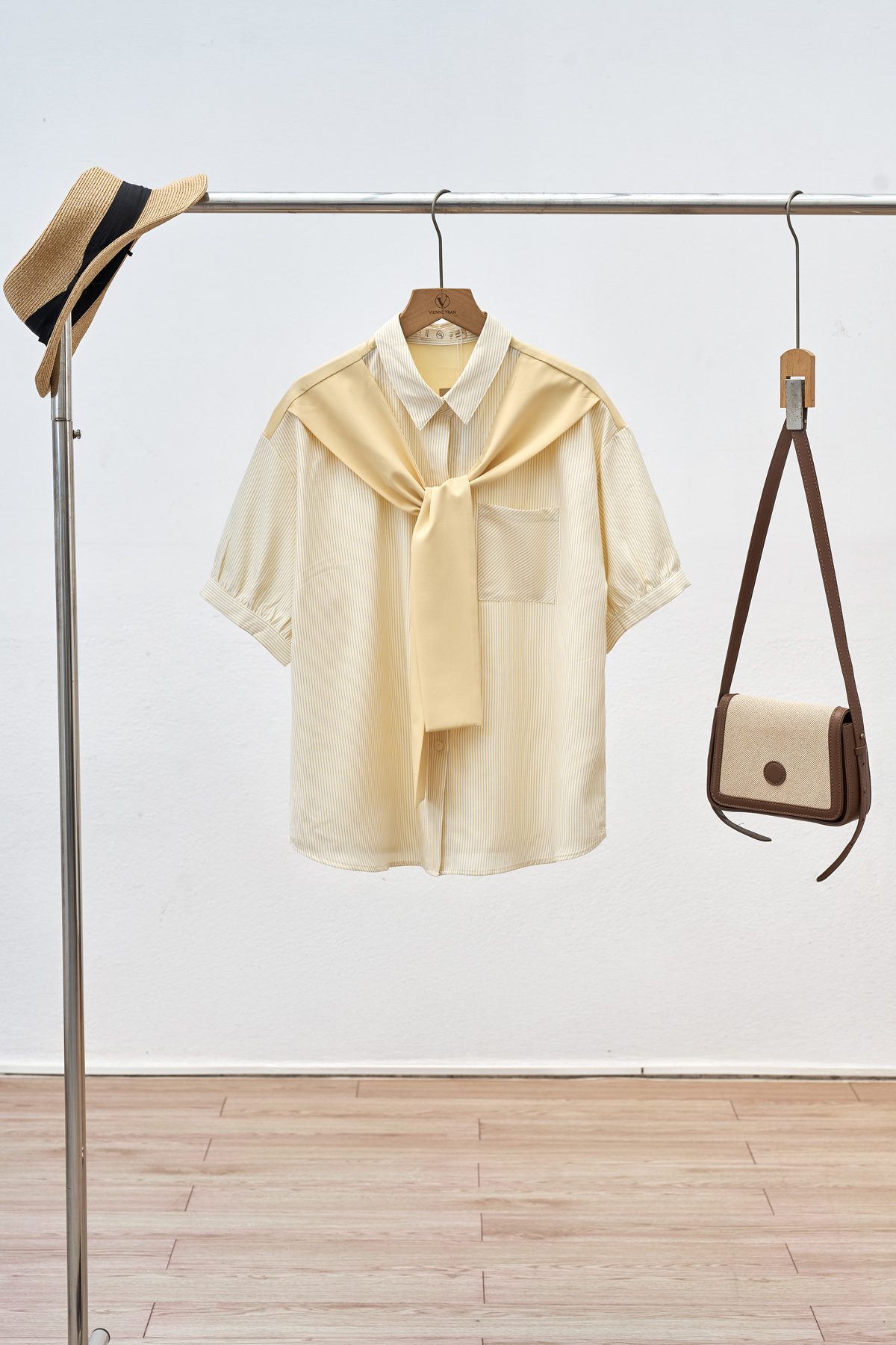Mô tả sản phẩm : Áo sơ mi dáng rộng, vai chờm, tay ngắn, túi ốp, phối khăn.
