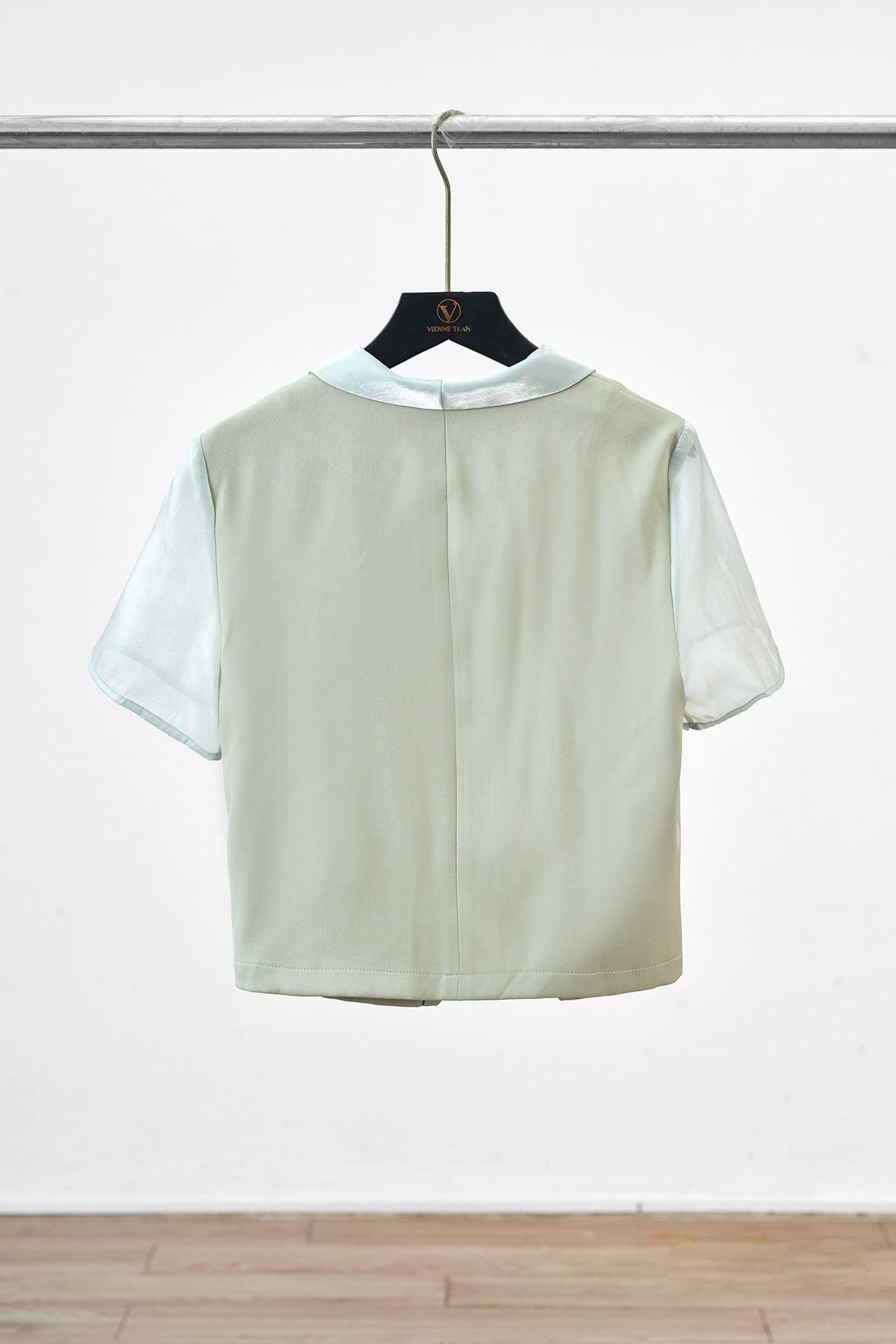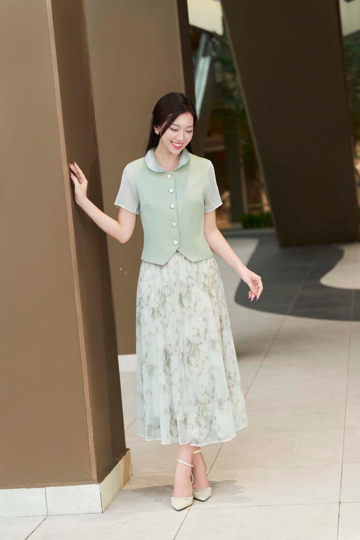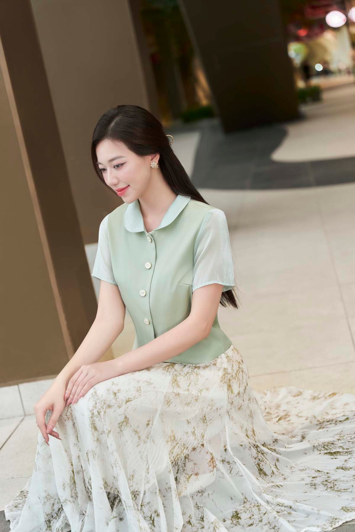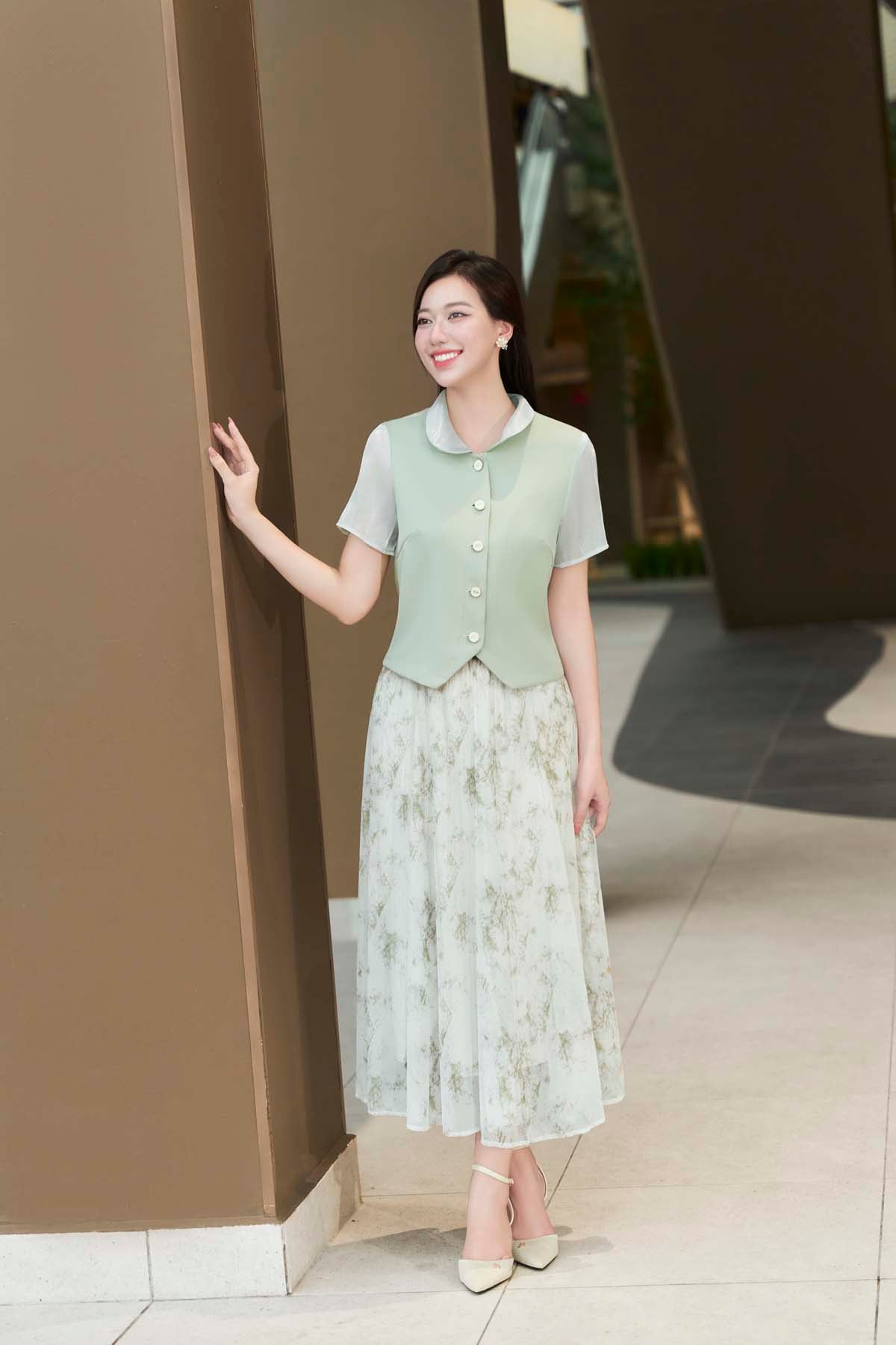 Mô tả sản phẩm : Áo dáng suông, cổ sen phối vải tơ, tay phối, nẹp đính cúc. GB-L62L25Q007