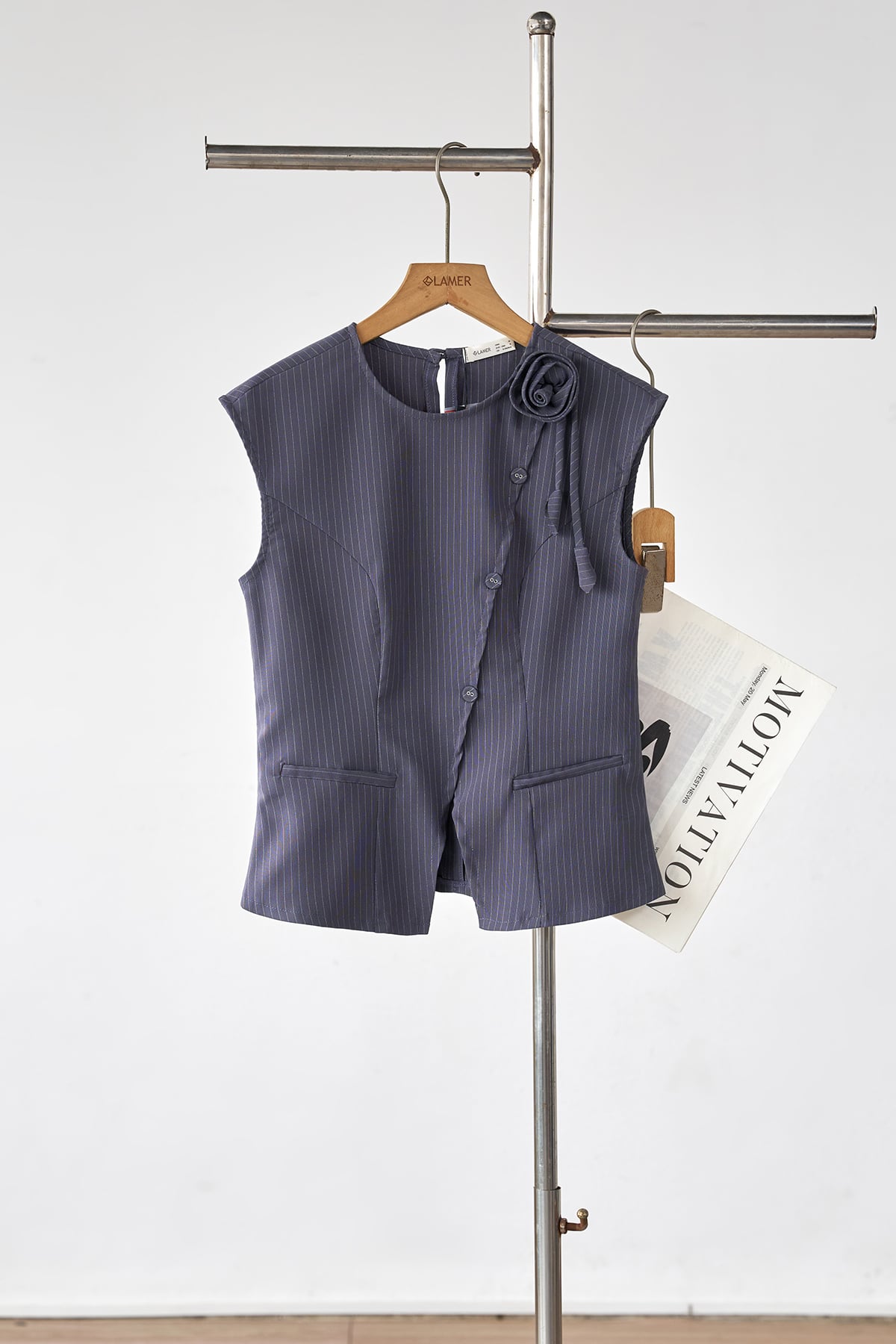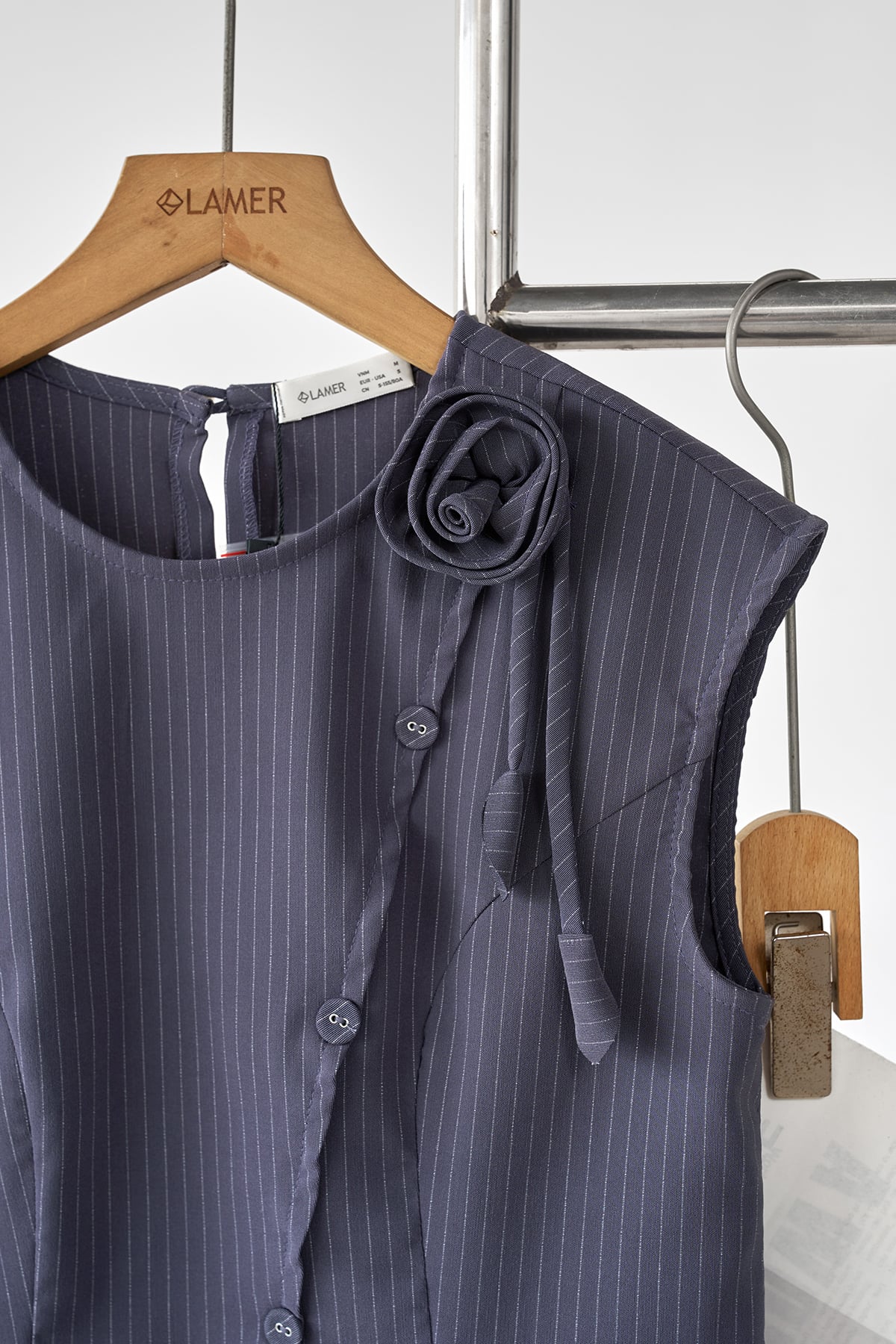 Mô tả sản phẩm: Áo dáng ôm, nẹp chéo giả, đính cúc, đính hoa và lá ở vai. GB L64W26Q001