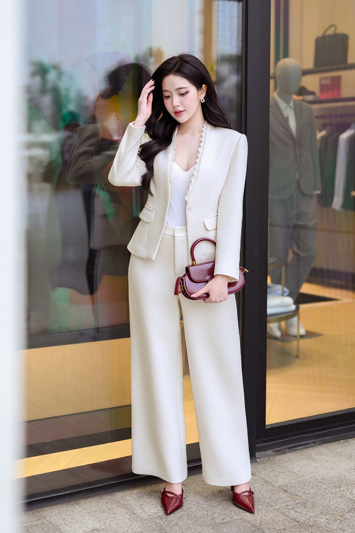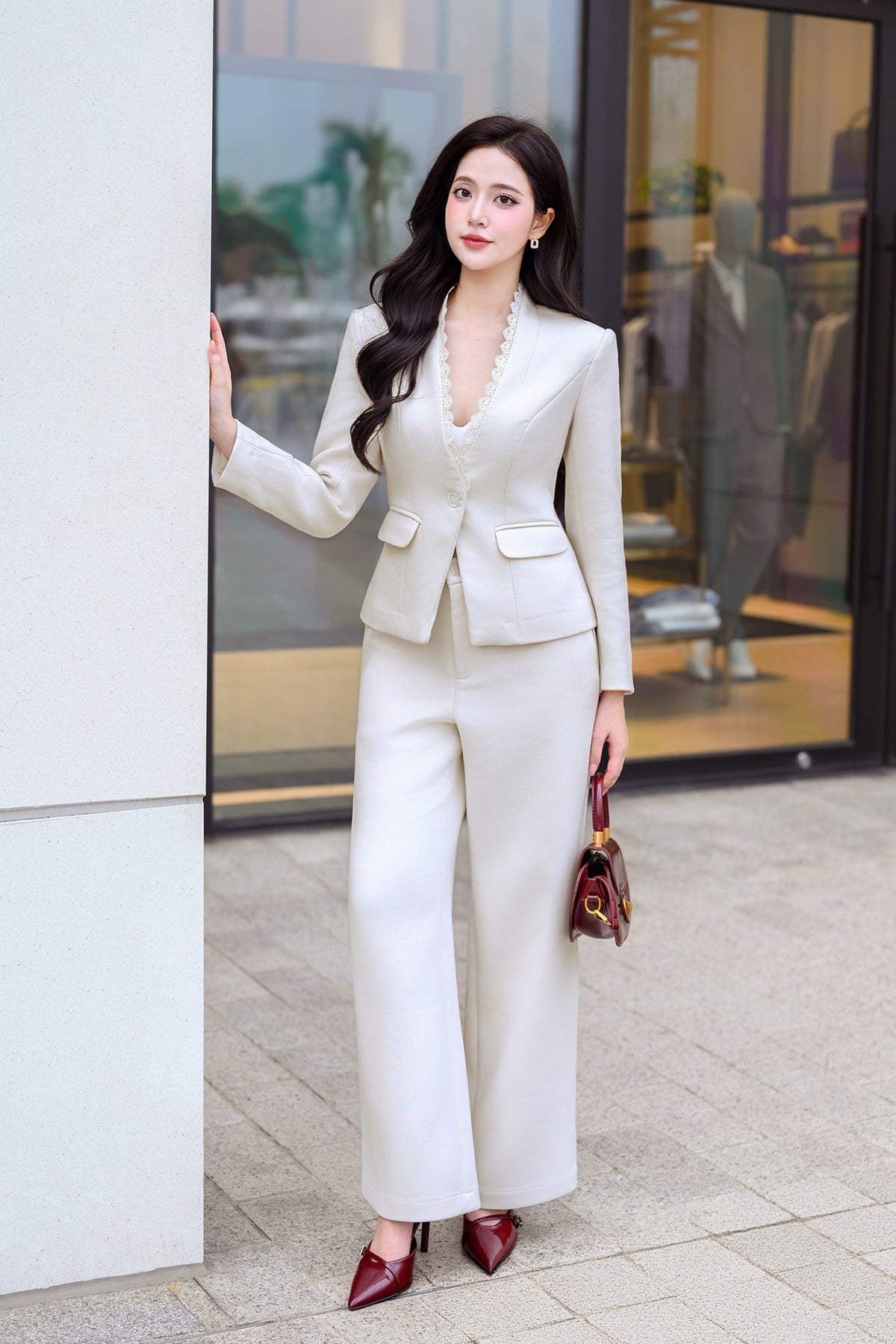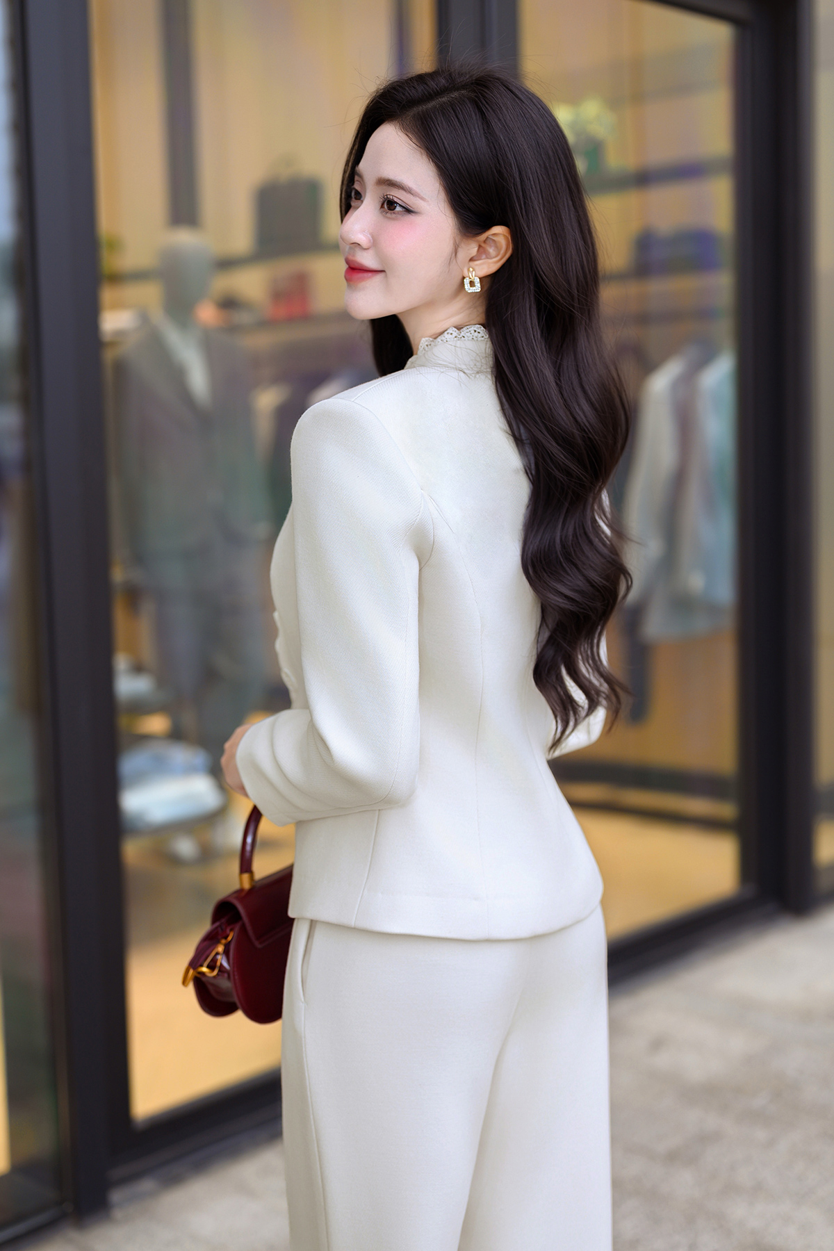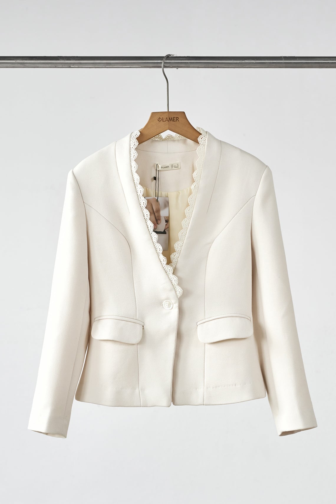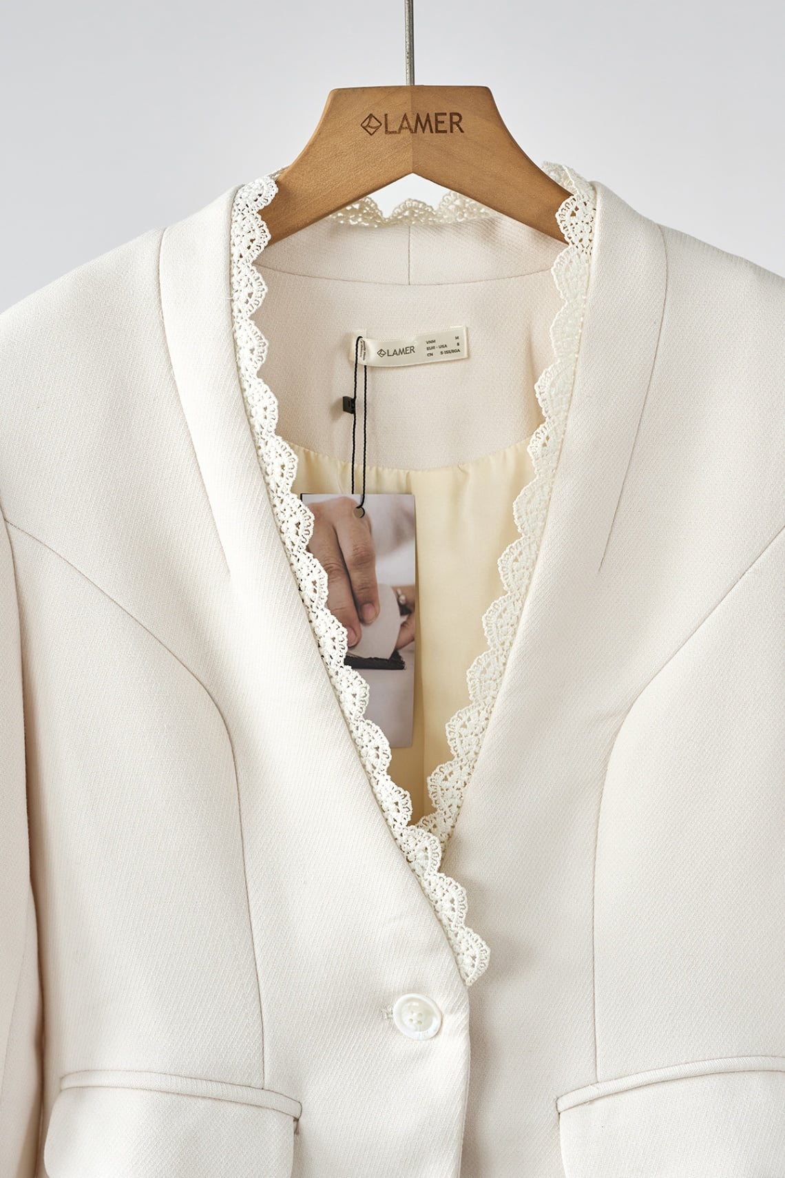 Mô tả sản phẩm : Áo dáng ôm, cổ leo 1 cúc, 2 cơi túi thật, cổ kẹp ren trang trí. GB L64W25Q011