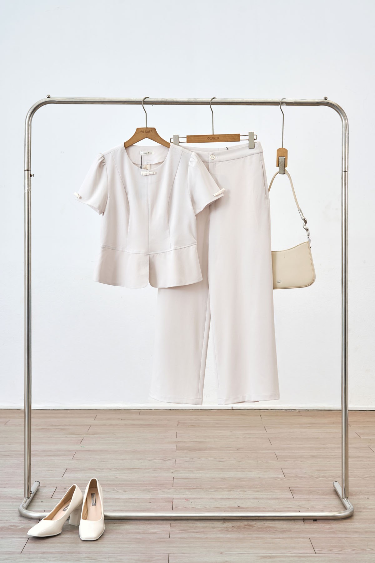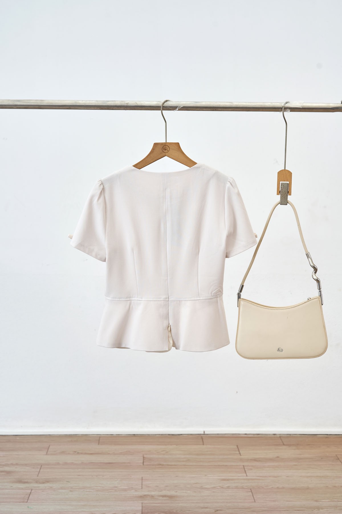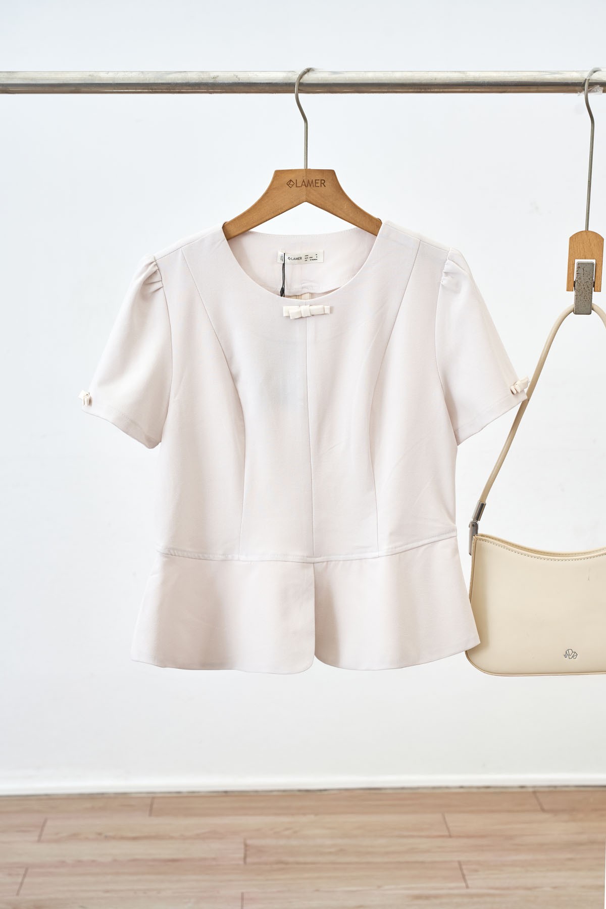 Mô tả sản phẩm : Áo dáng ôm, peplum, xẻ trước, cổ và tay đính nơ, kéo khóa sau. GB L64W25H006