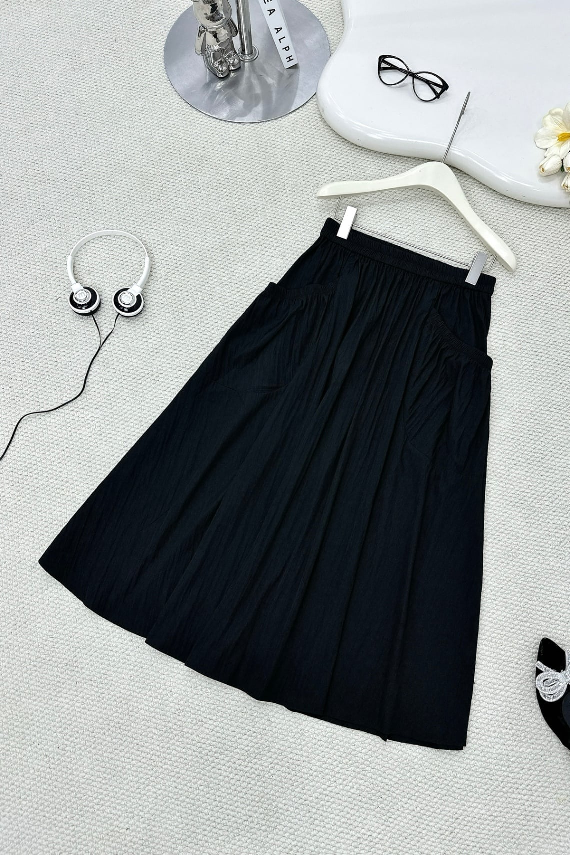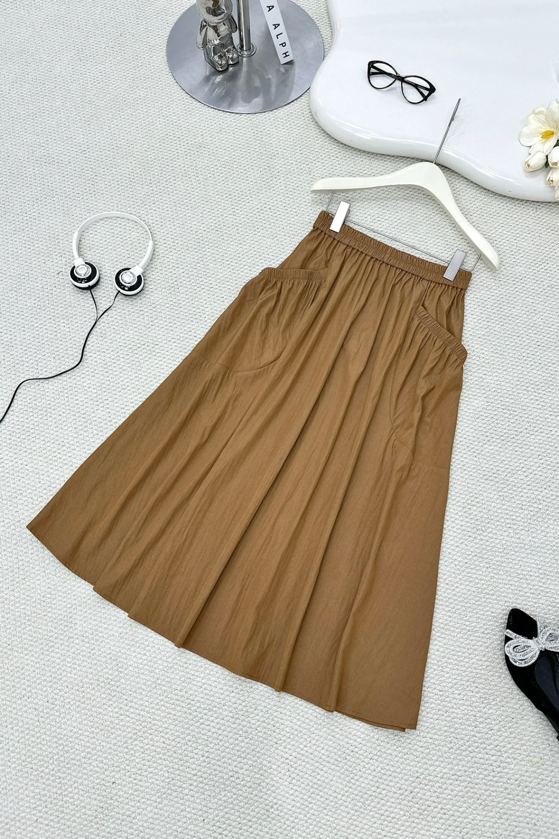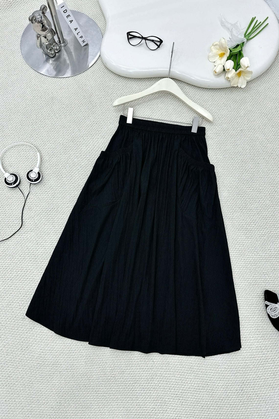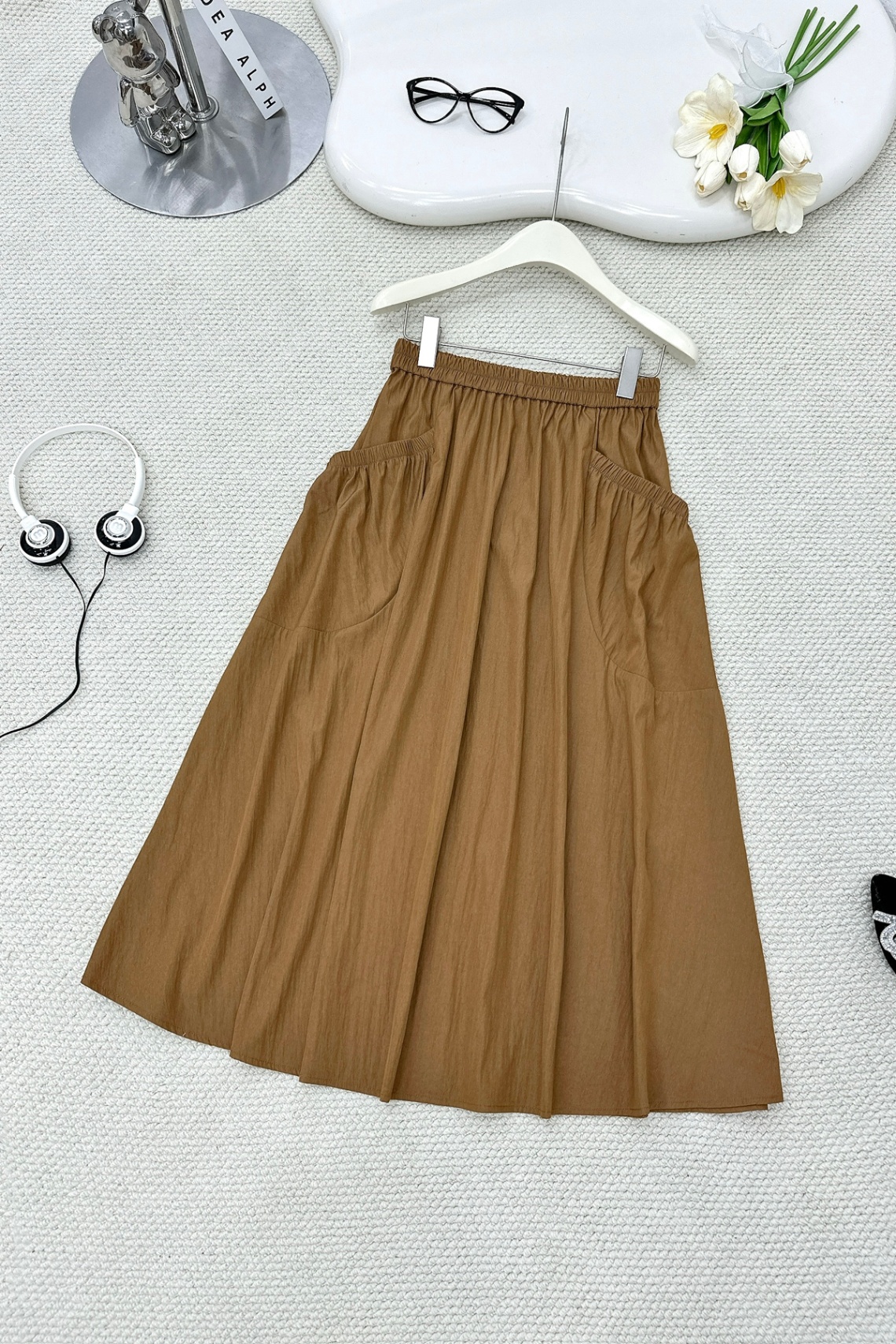 Mô tả sản phẩm : Chân váy dáng xòe dài, 2 túi ốp nhún phồng, cạp chun.