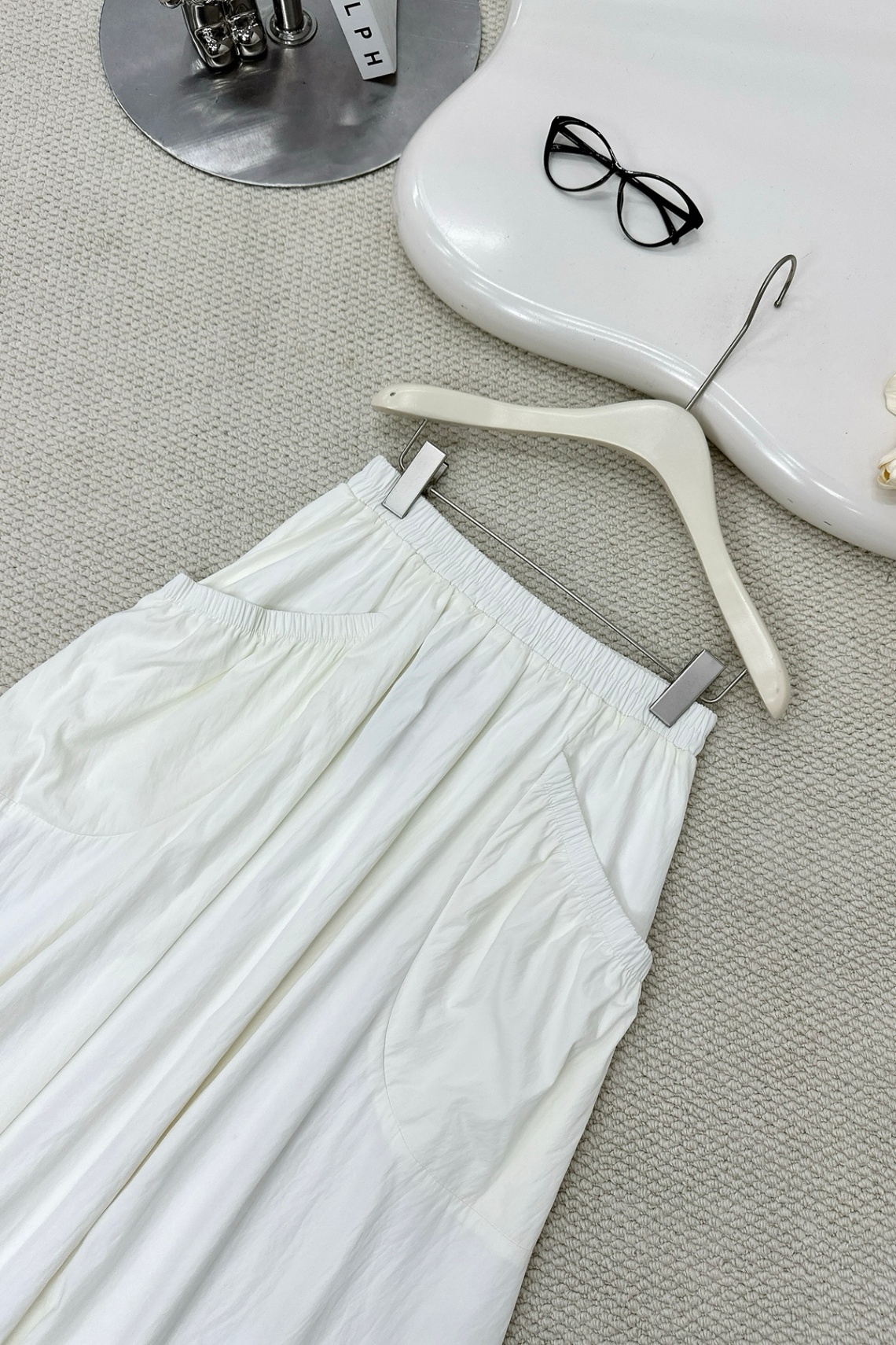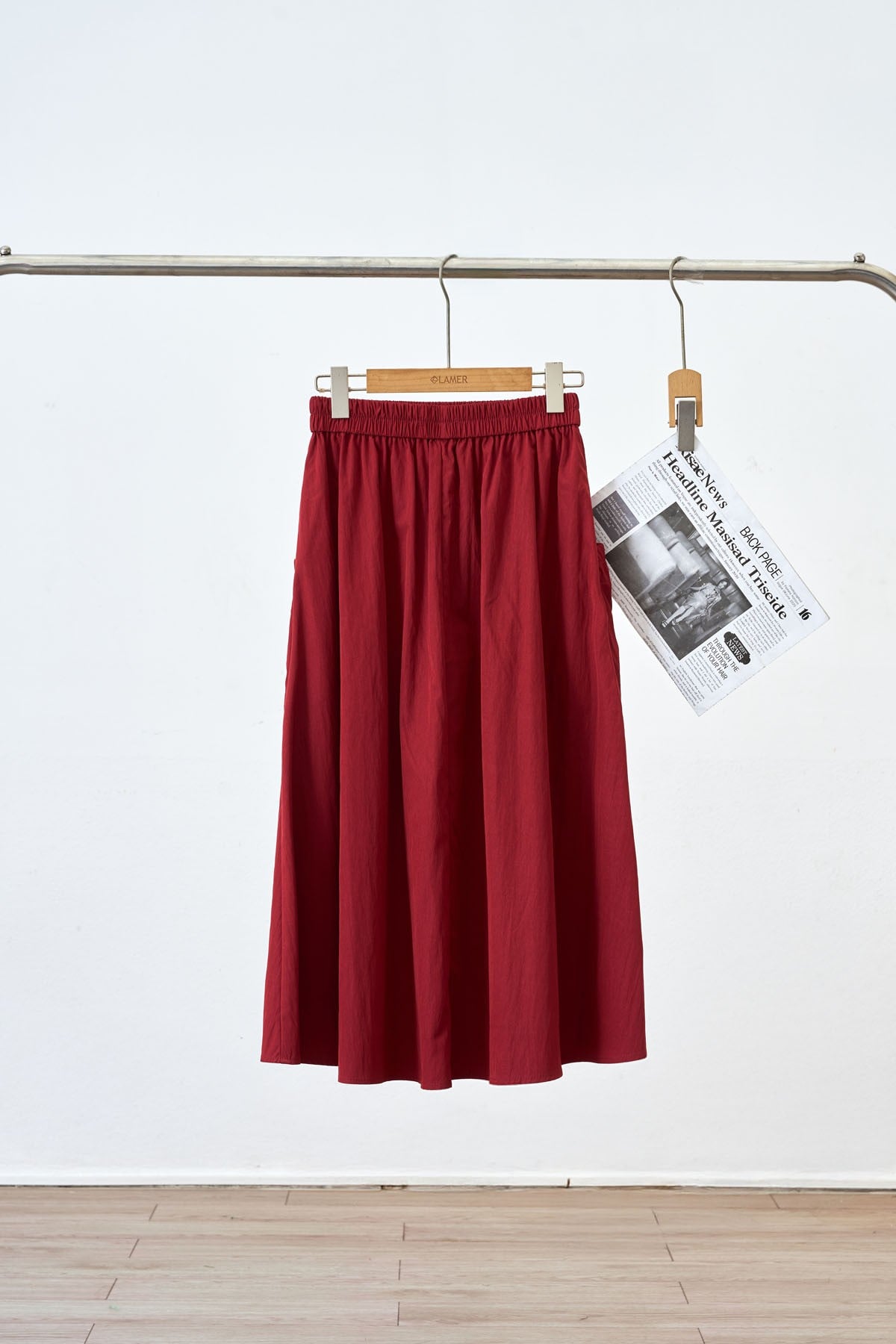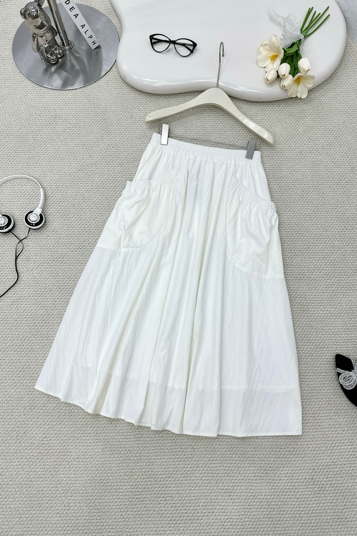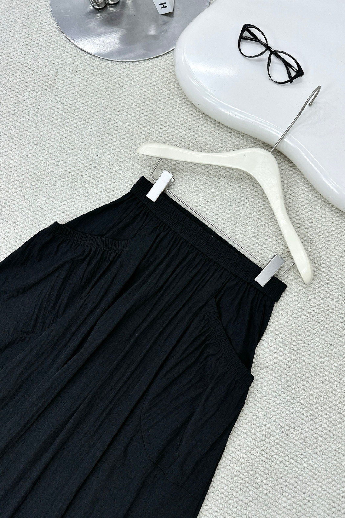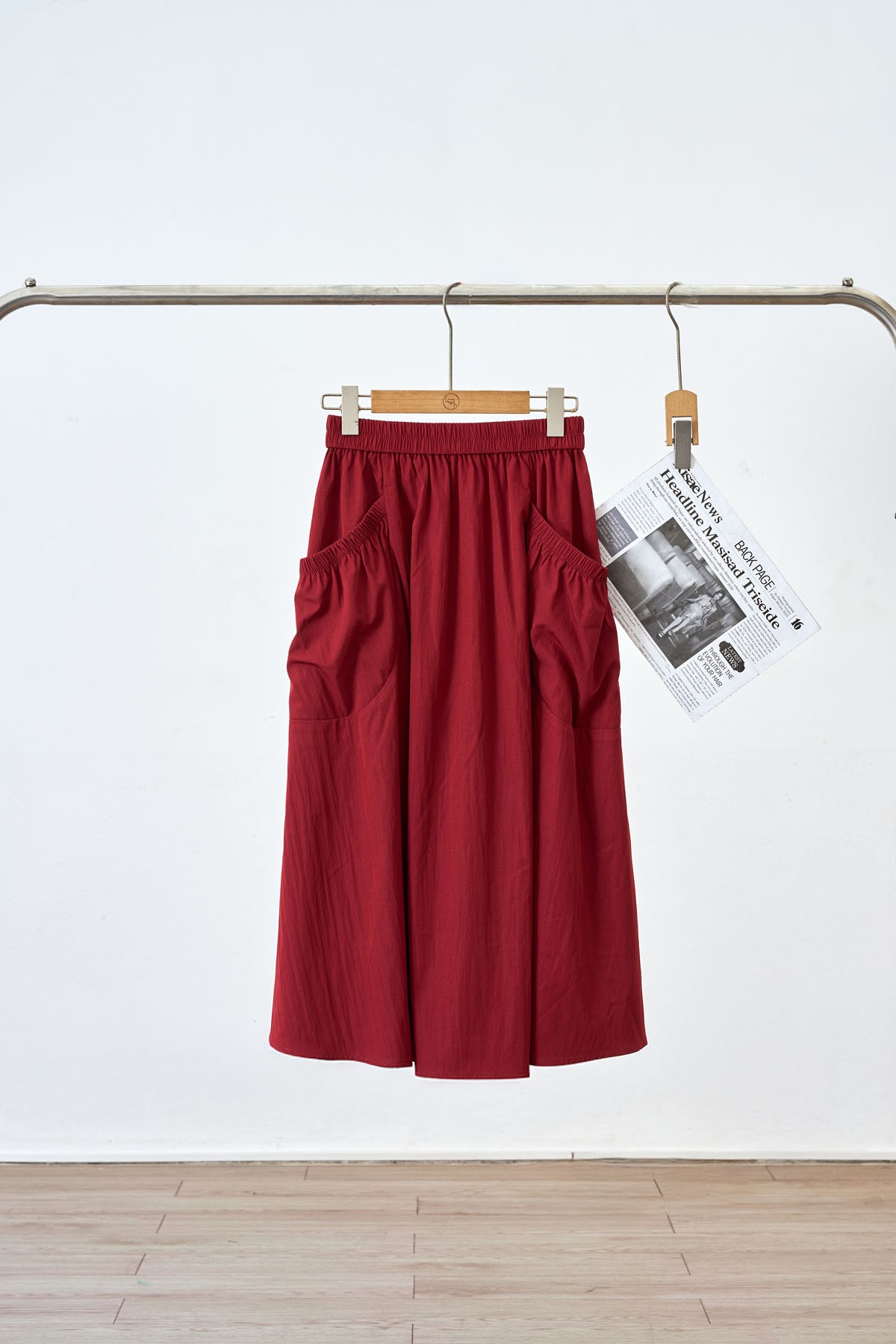Mô tả sản phẩm : Chân váy dáng xòe dài, 2 túi ốp nhún phồng, cạp chun.