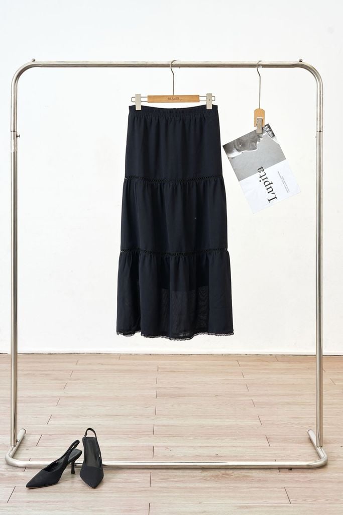Mô tả sản phẩm : Chân váy dáng xòe 2 lớp, cạp chun, nhún 3 tầng kẹp ren.