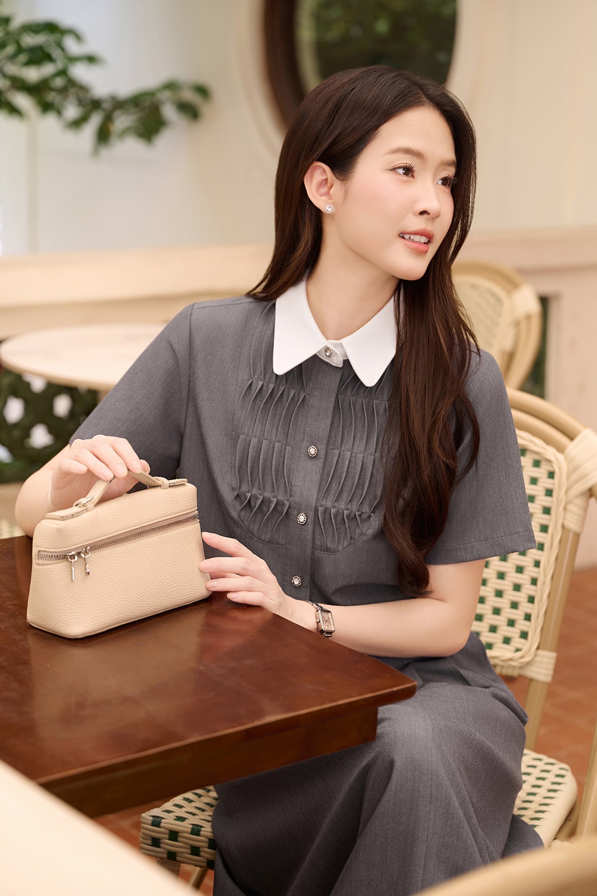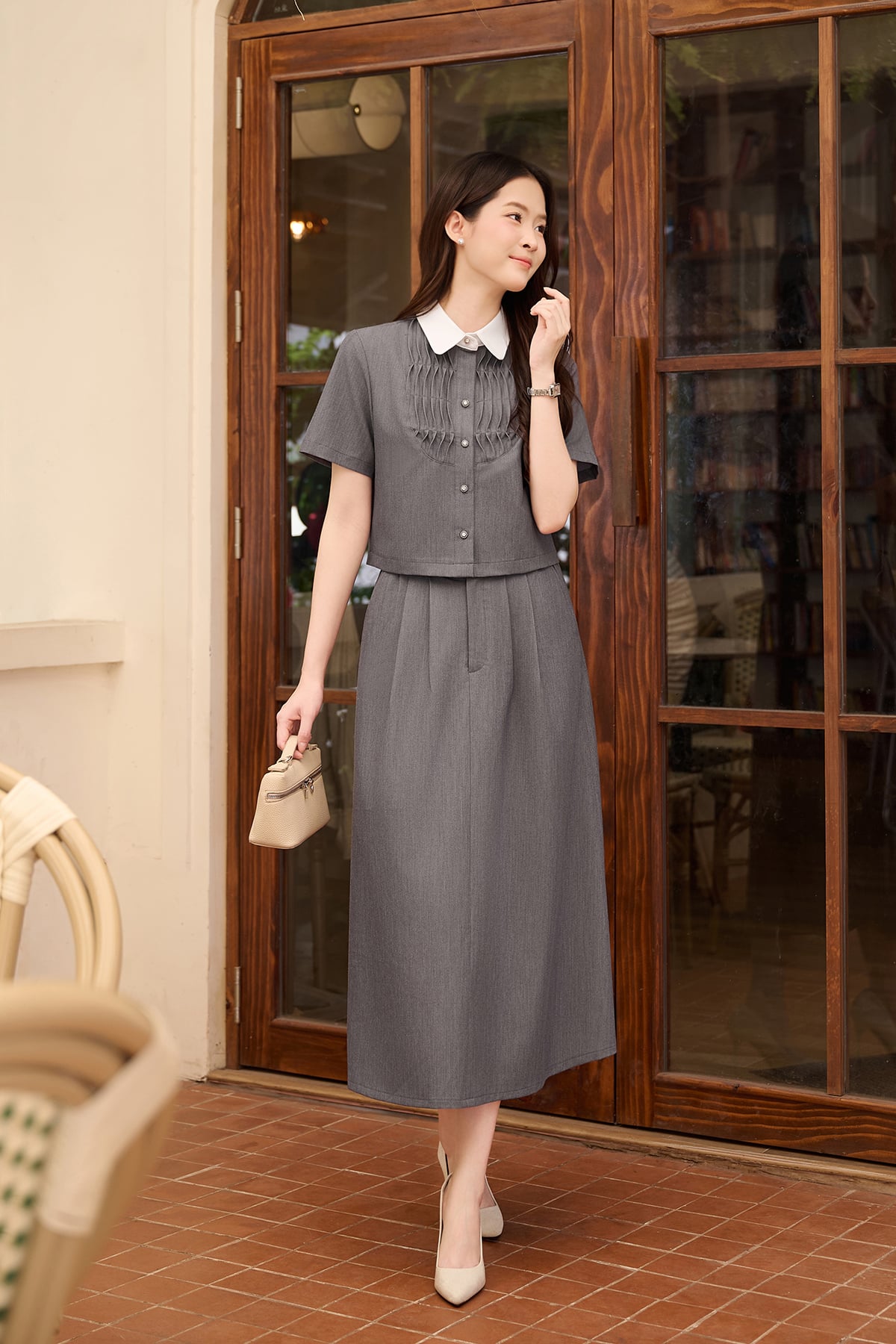 Mô tả sản phẩm : Chân váy dáng A, chun 2 bên sườn, chiết ly, túi chéo, đóng cúc. GB O61H26Q008