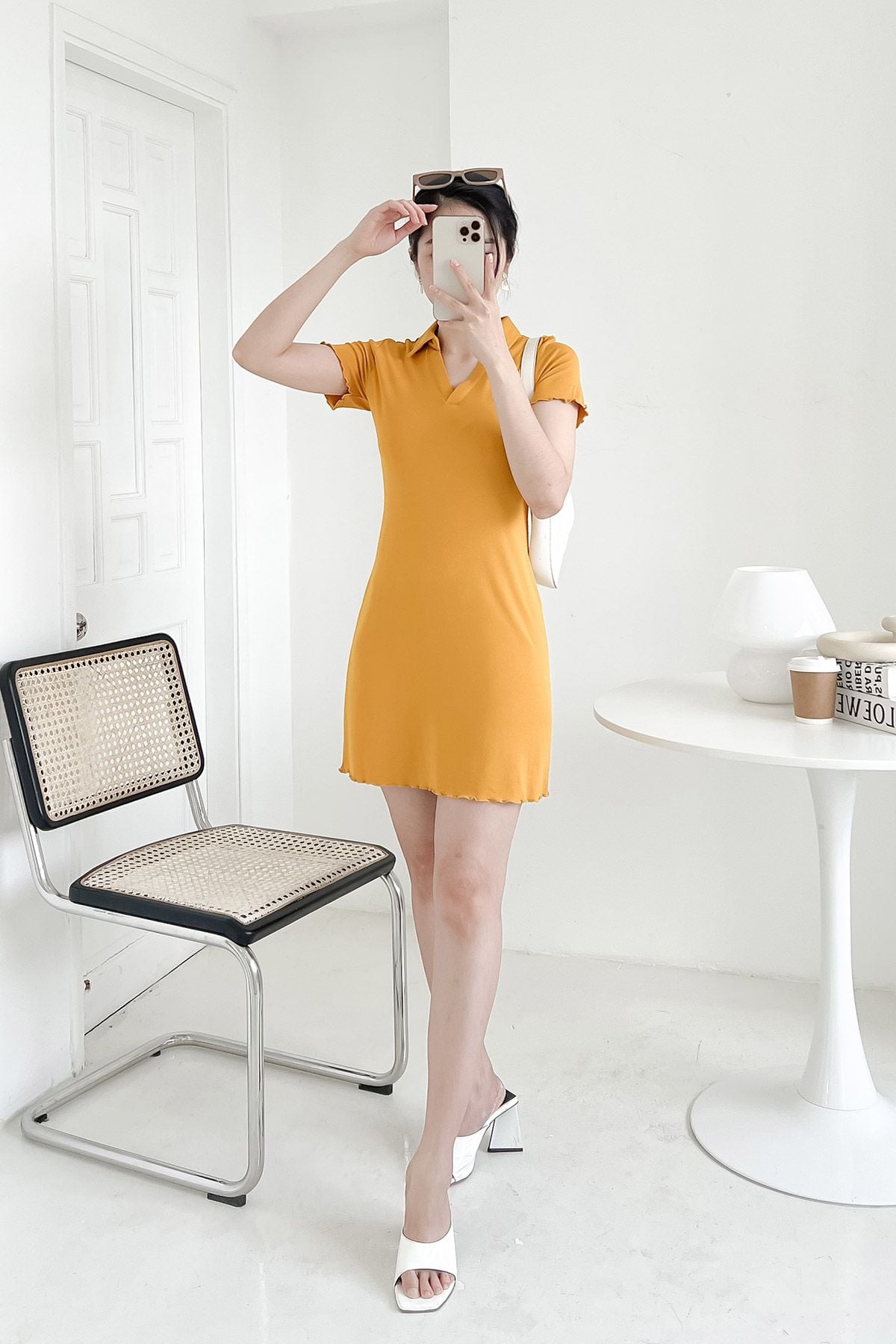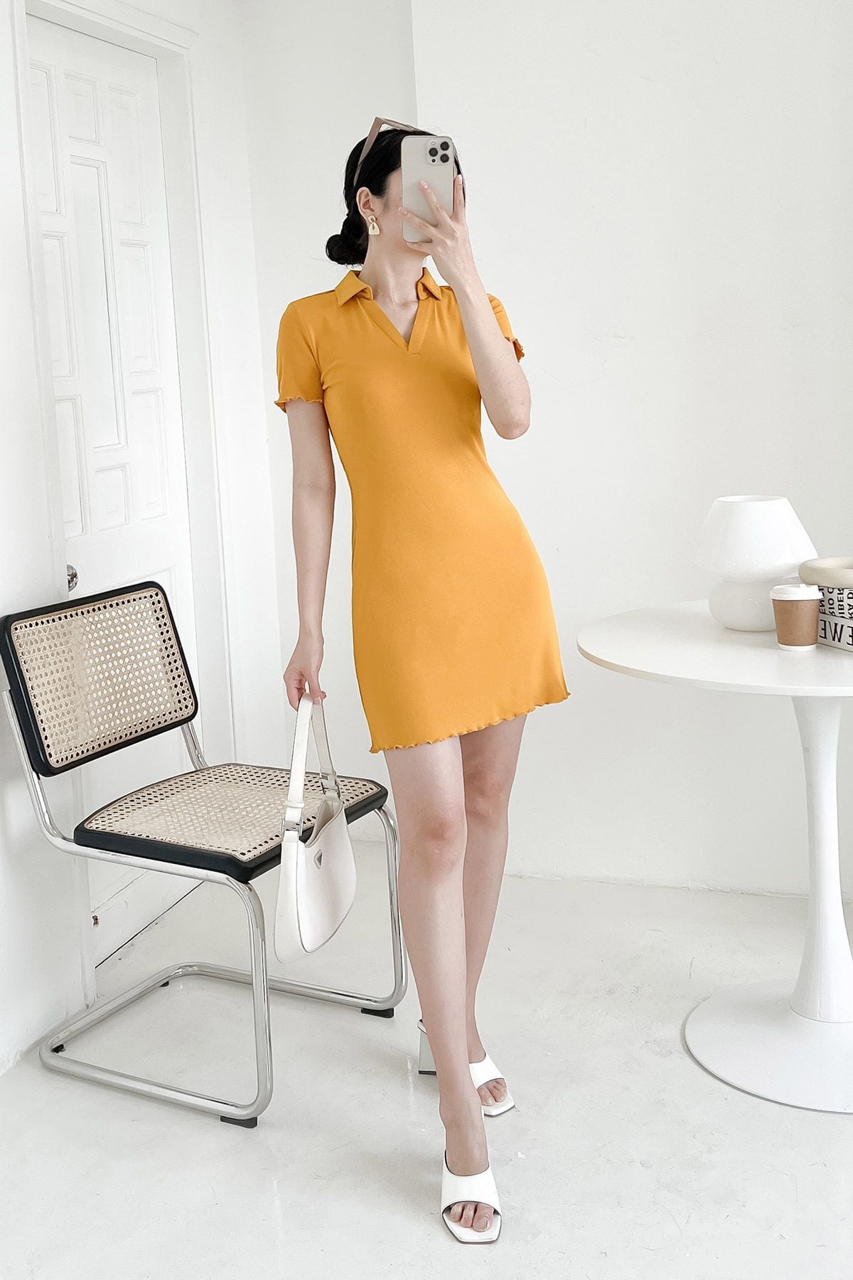 Mô tả sản phẩm : Đầm A cổ bẻ ,dáng ôm,gấu đầm+tay cuốn bèo trang trí