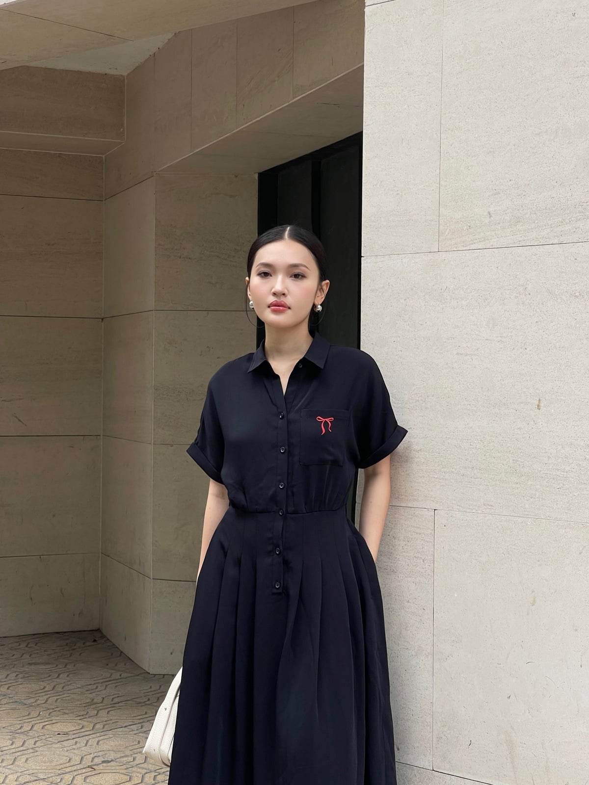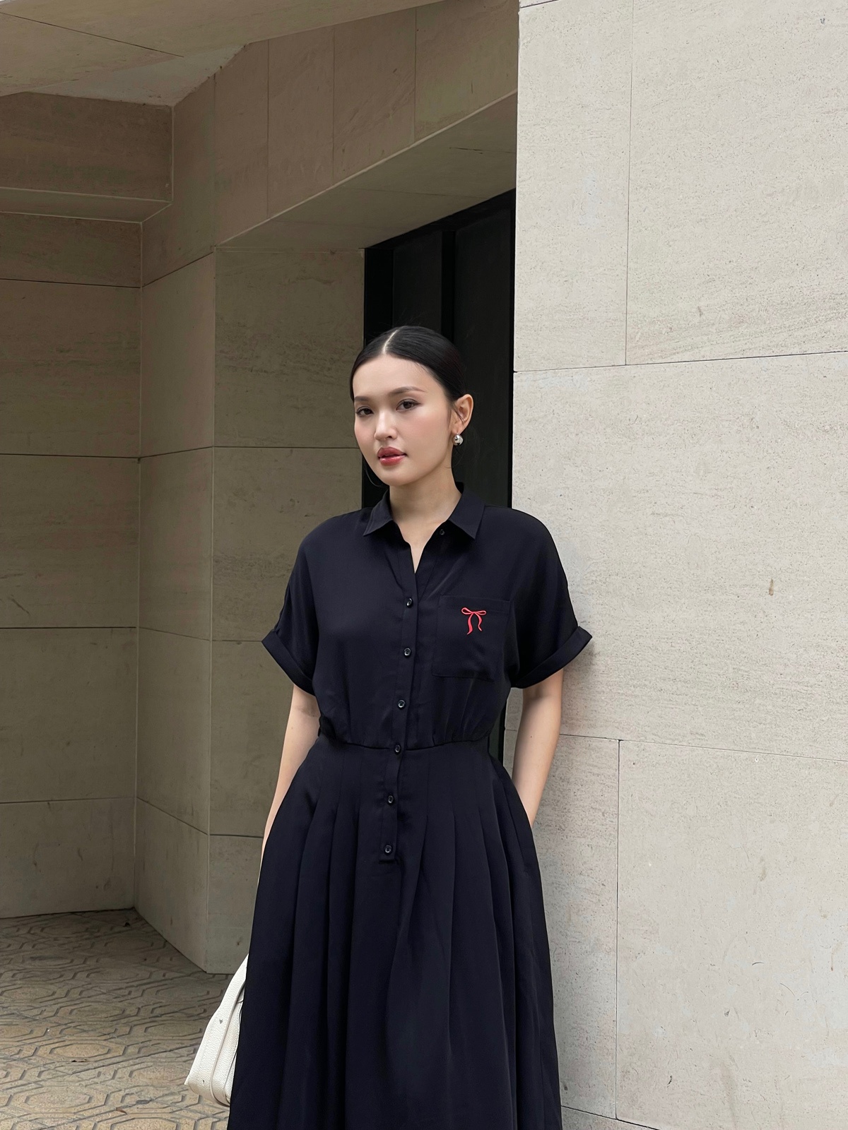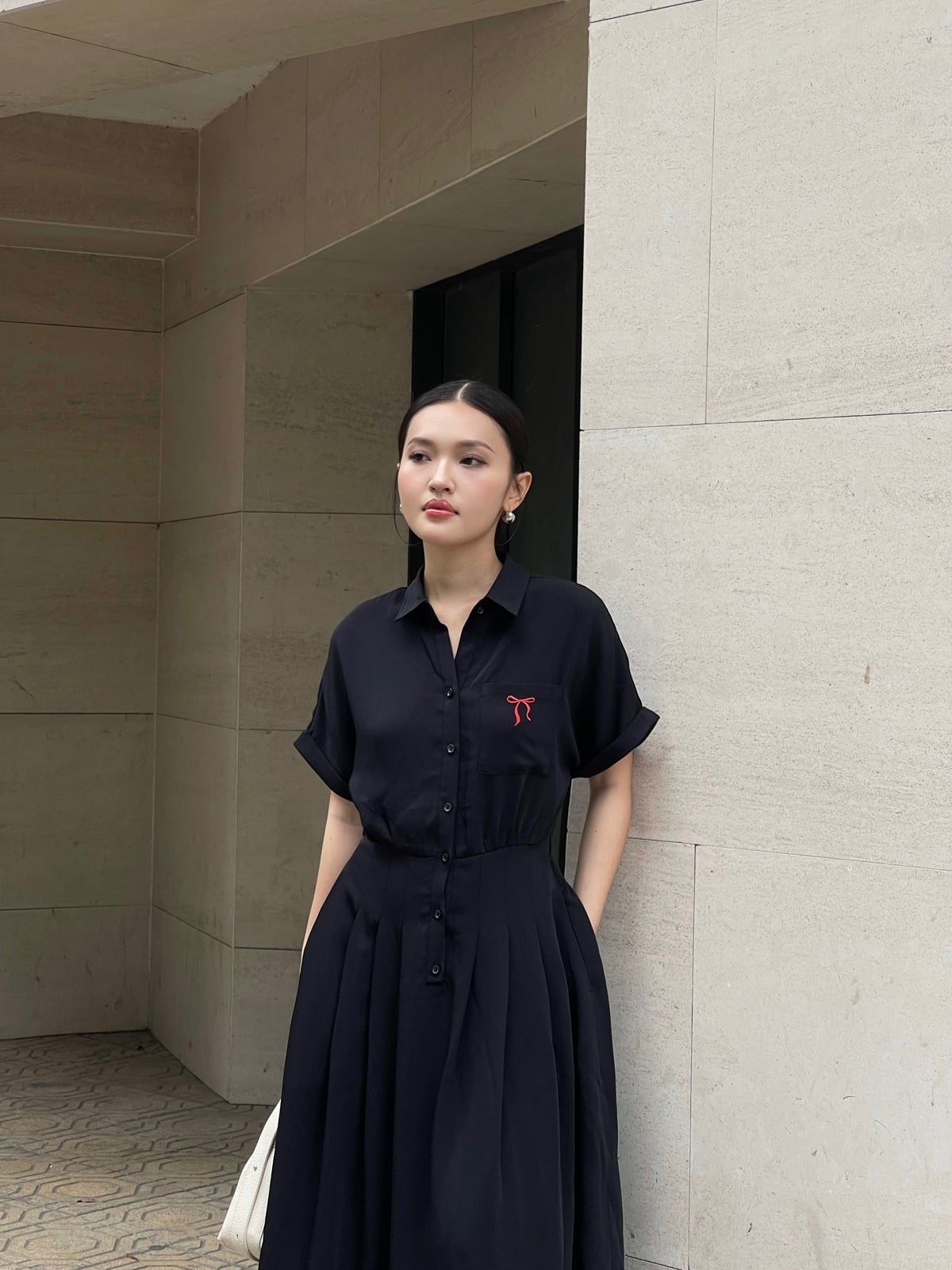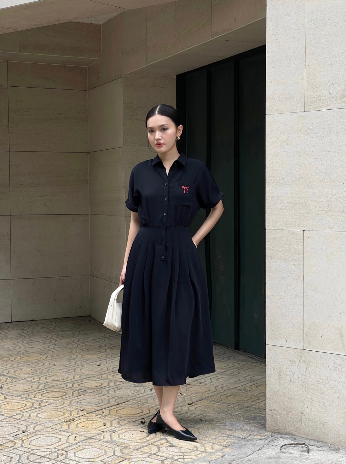 Mô tả sản phẩm : Đầm dáng xòe cổ đức thêu nơ, cài cúc, xếp ly eo, túi ốp, tay lơ vê, chun sau.