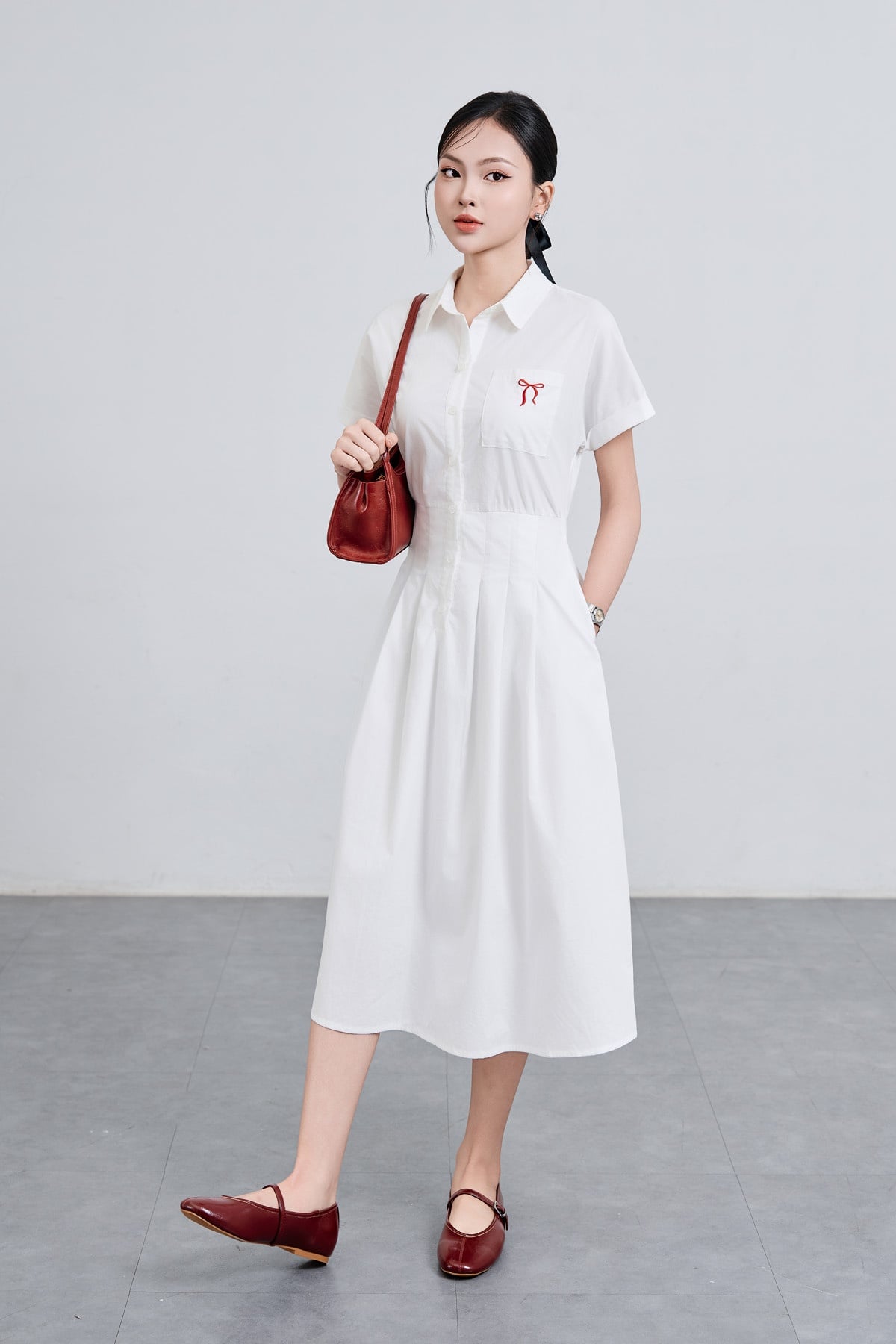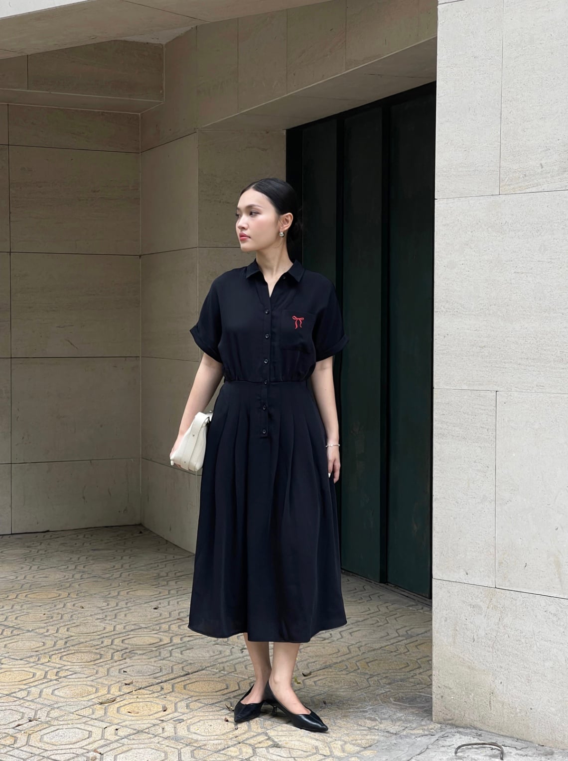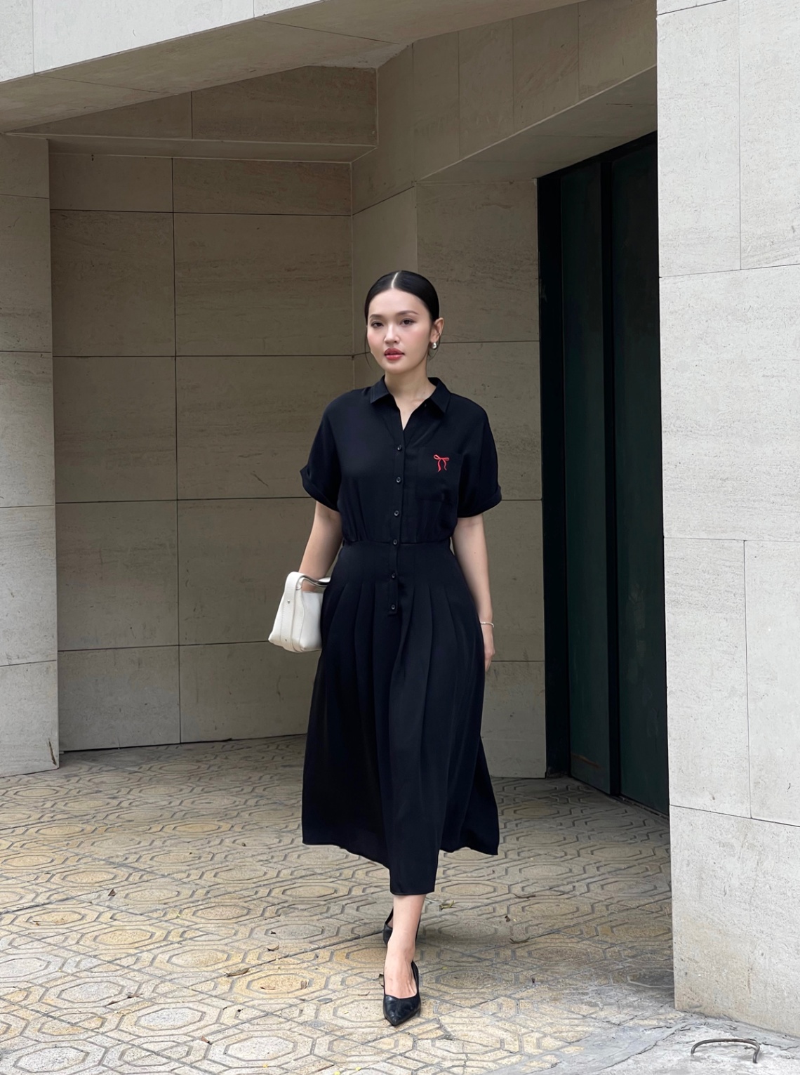 Mô tả sản phẩm : Đầm dáng xòe cổ đức thêu nơ, cài cúc, xếp ly eo, túi ốp, tay lơ vê, chun sau.