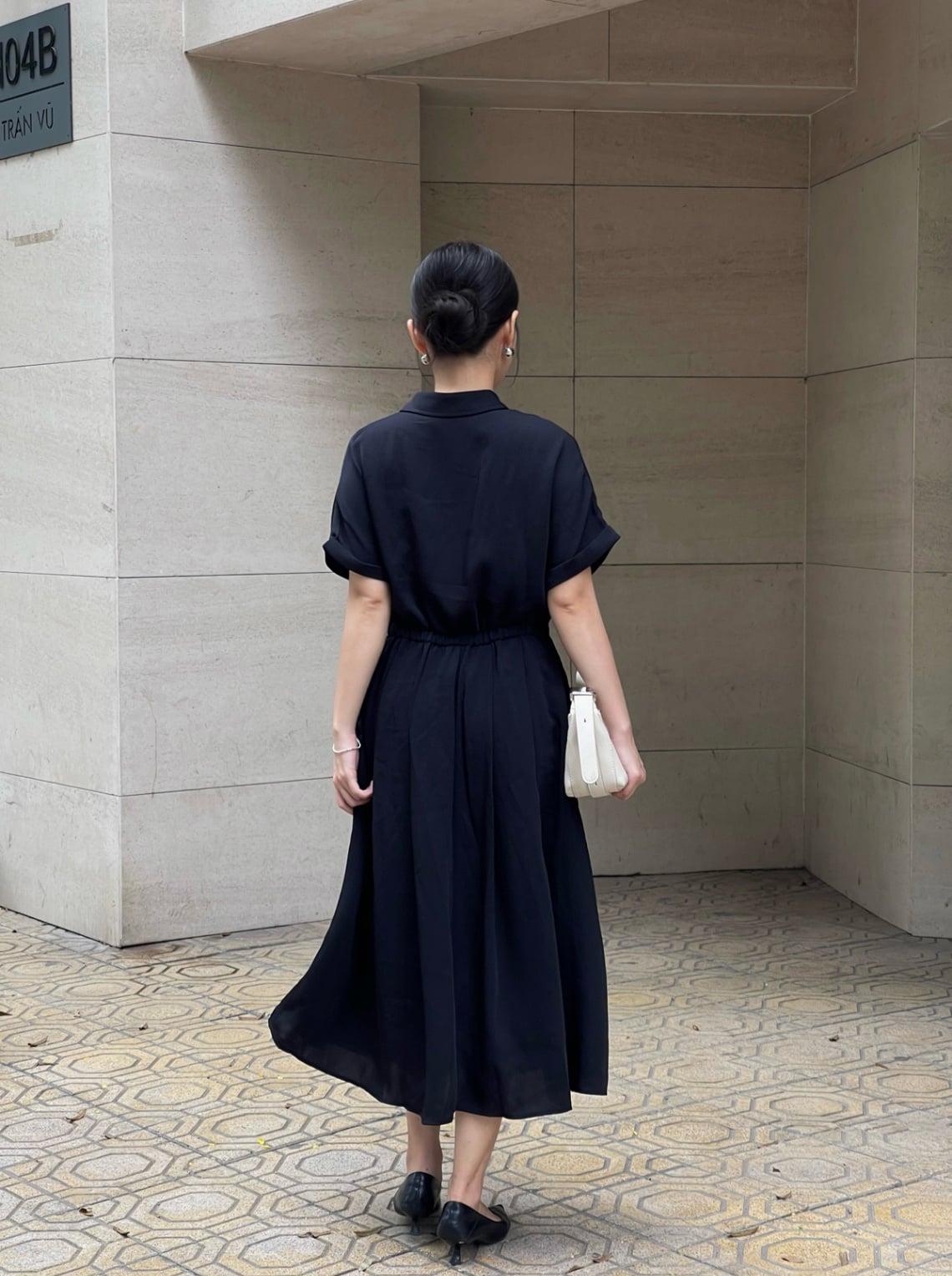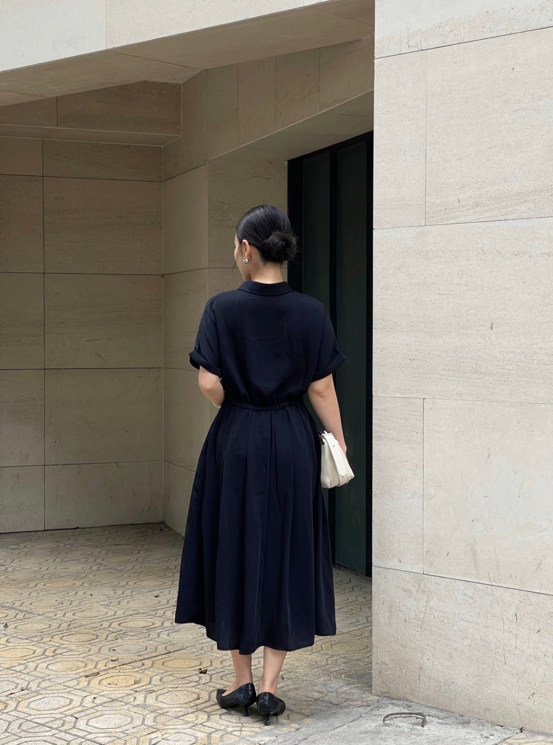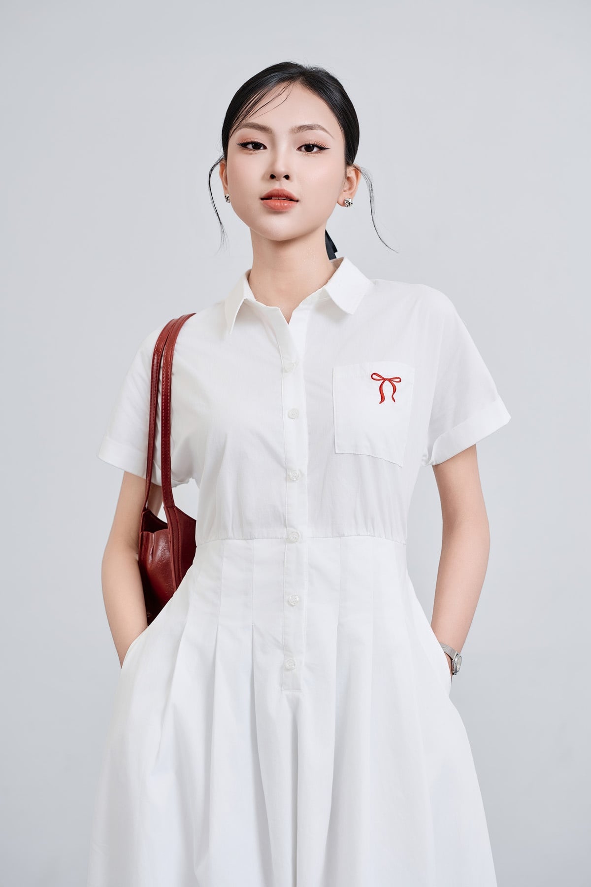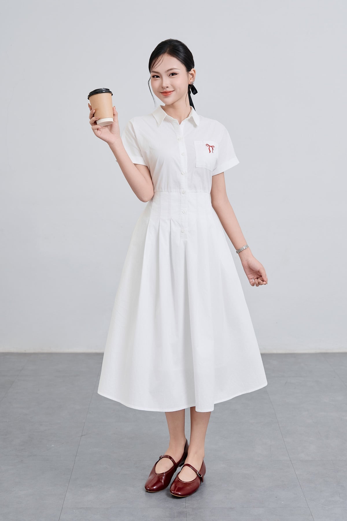 Mô tả sản phẩm : Đầm dáng xòe cổ đức thêu nơ, cài cúc, xếp ly eo, túi ốp, tay lơ vê, chun sau.