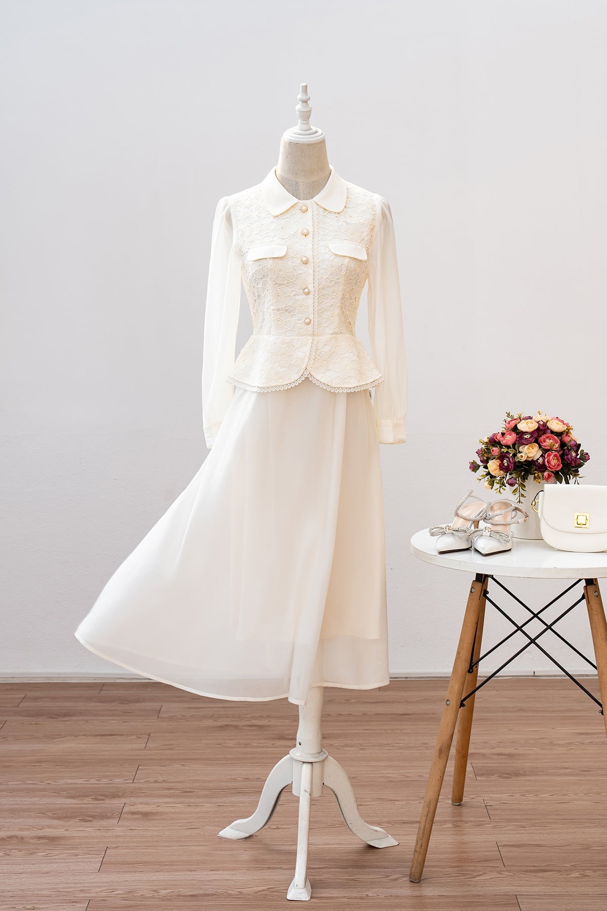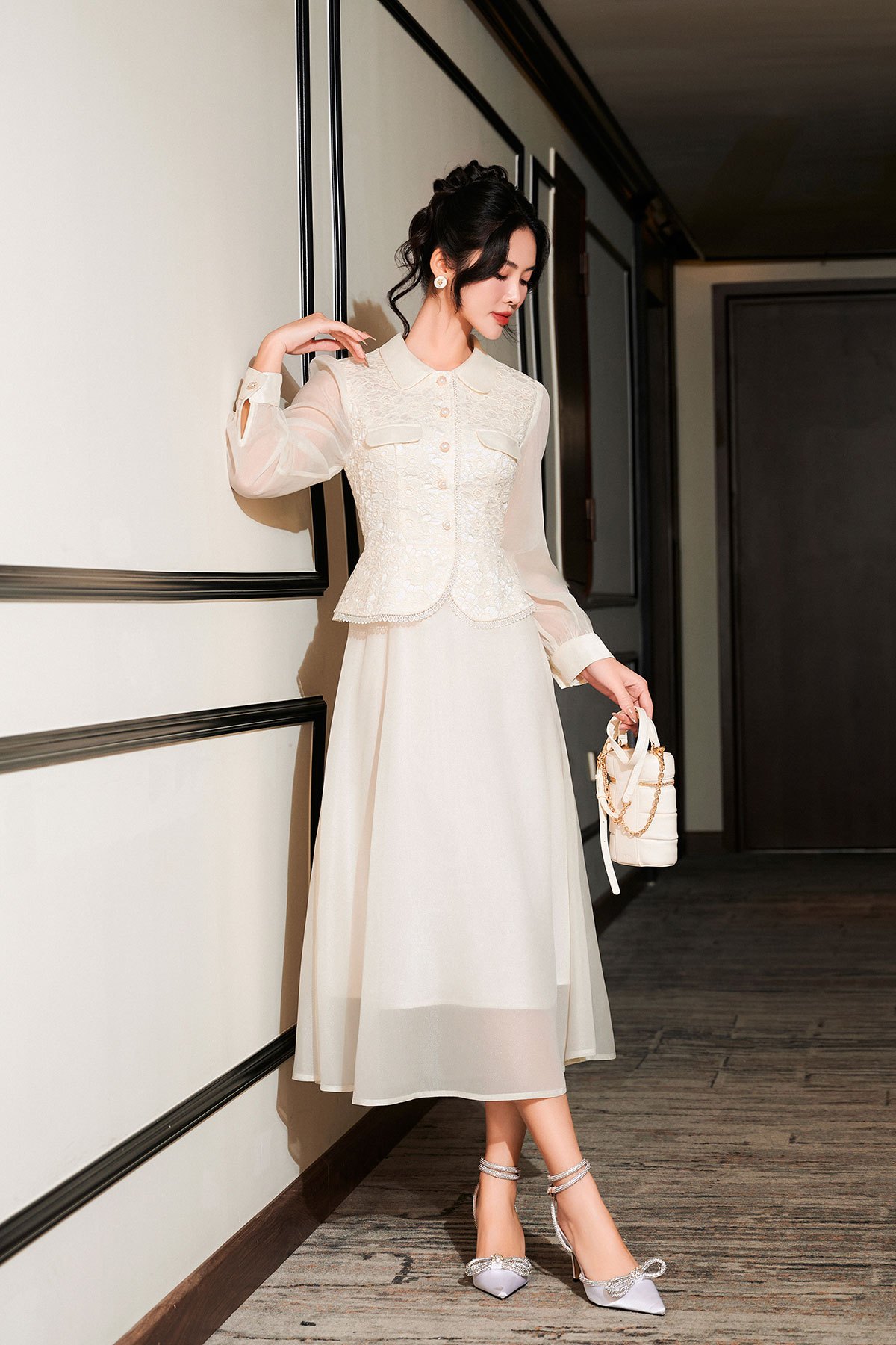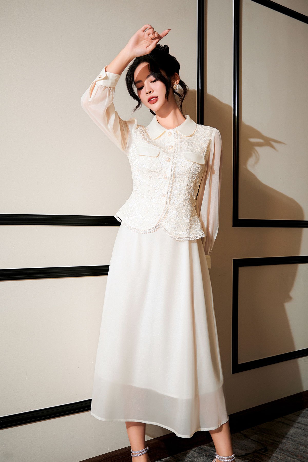 Mô tả sản phẩm : Dáng xòe, cổ sen phối, thân ren peplum, tay dài phối tơ óng, nẹp đính cúc, kéo khóa sau lưng